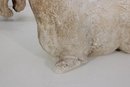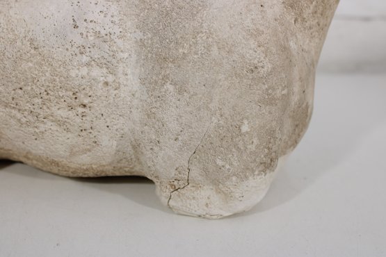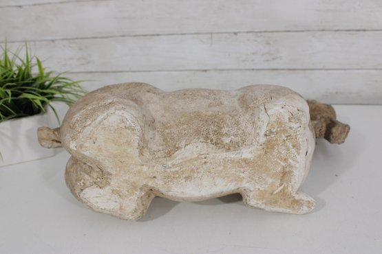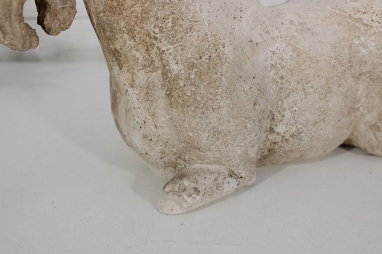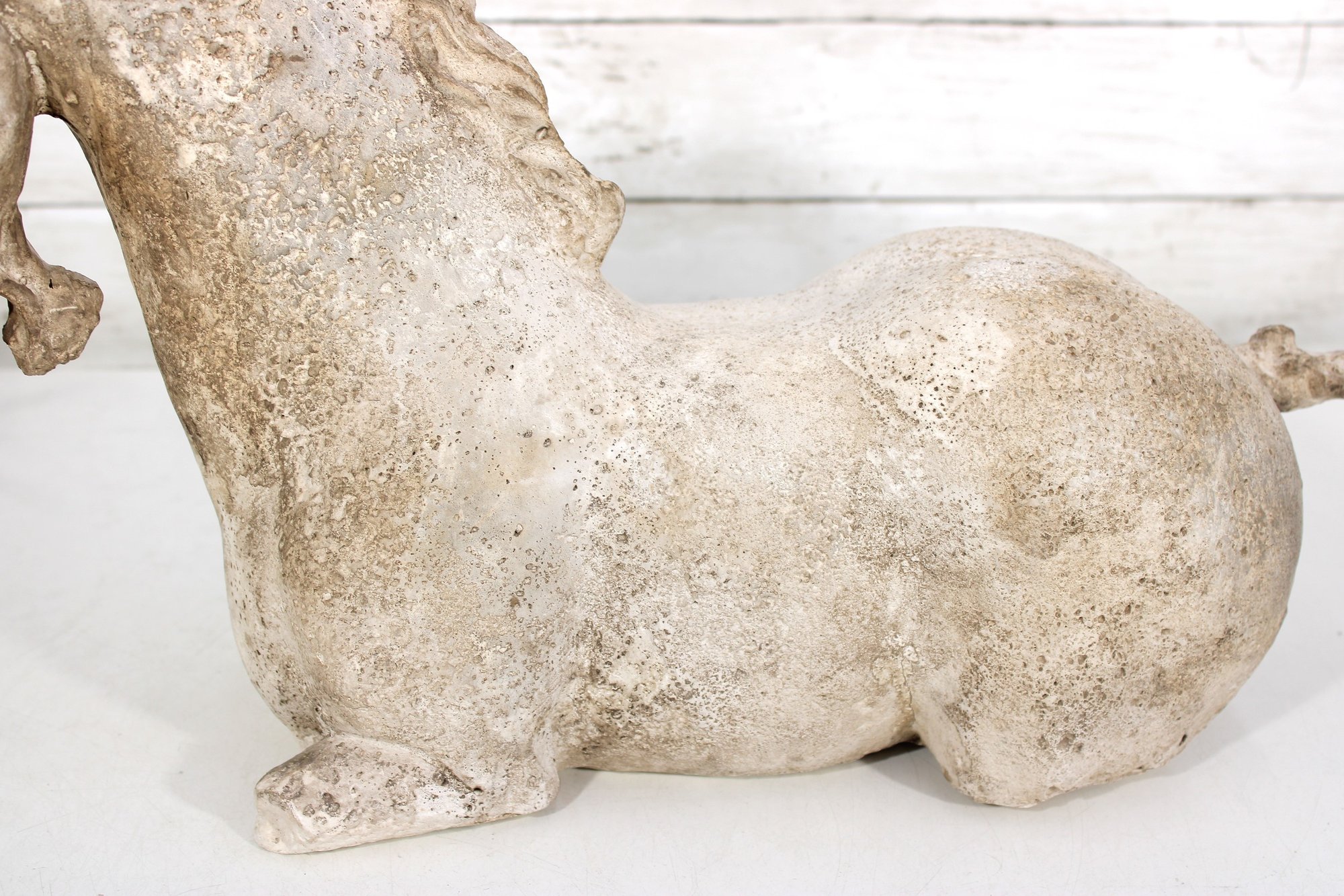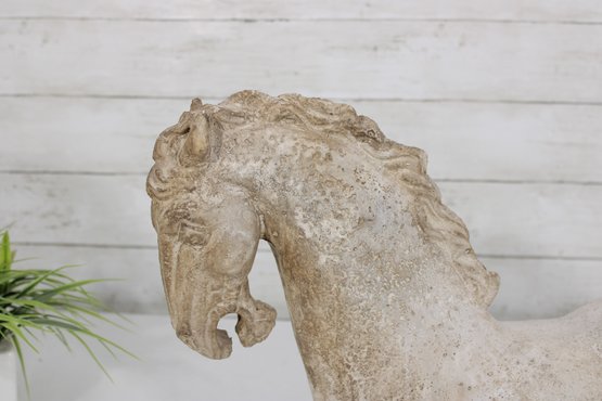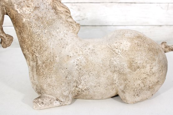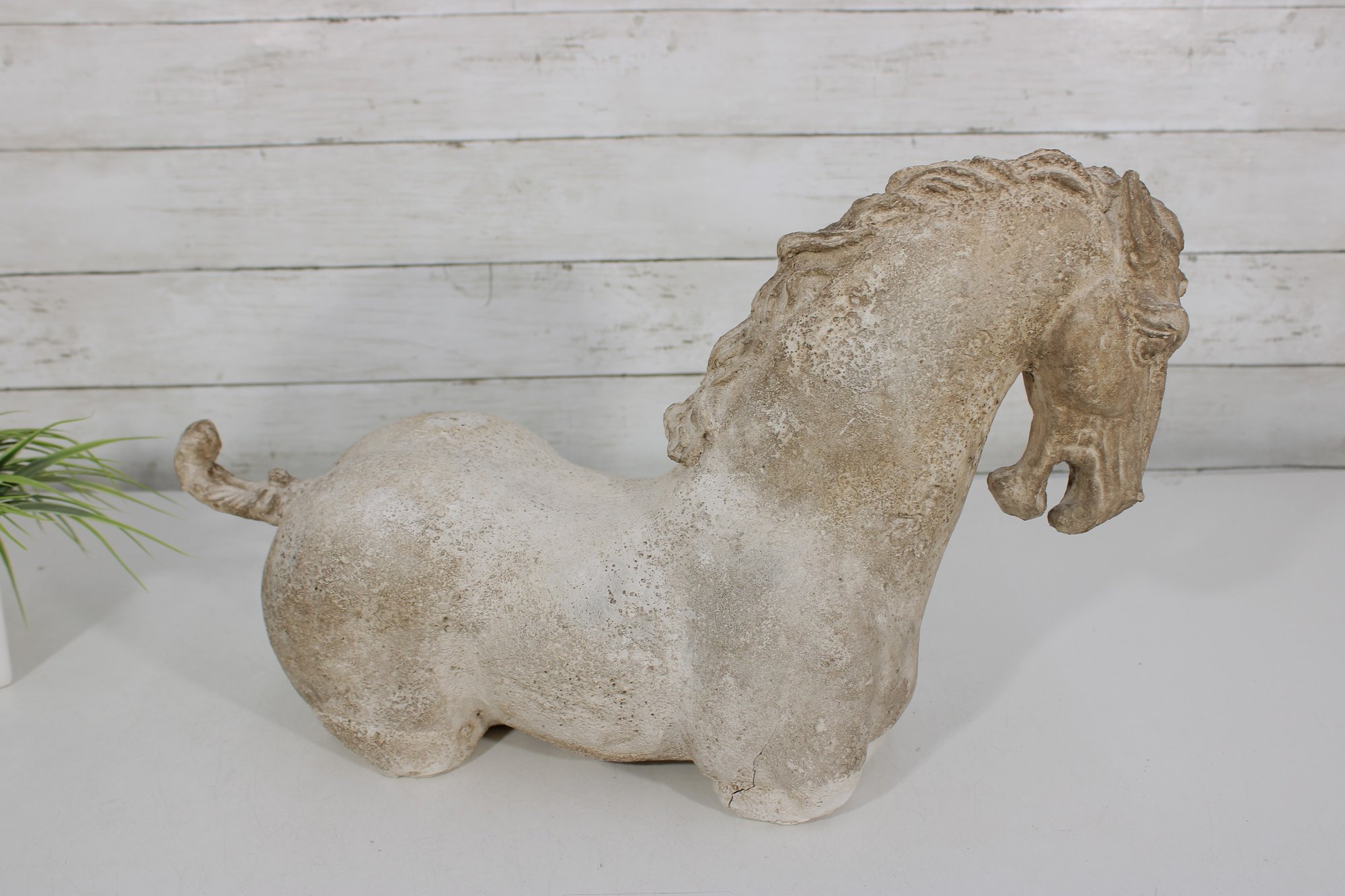 Impressive vintage horse sculpture featuring a reclining horse with detailed mane, expressive head, and curled tail. This decorative piece has a rustic stone or aged plaster appearance, giving it a classical and weathered look that works beautifully with farmhouse, rustic, or garden-inspired décor.