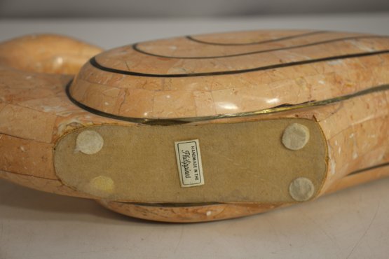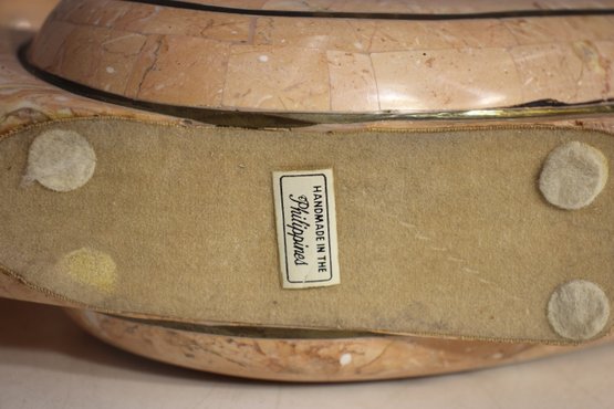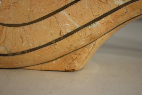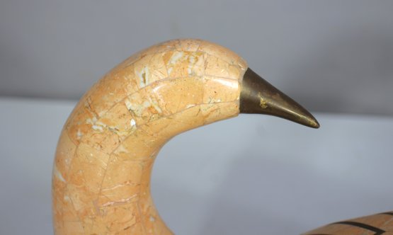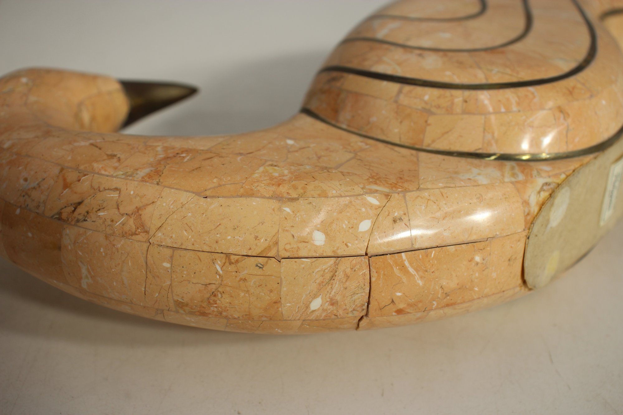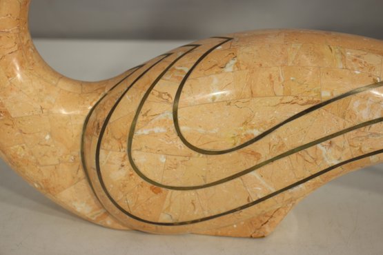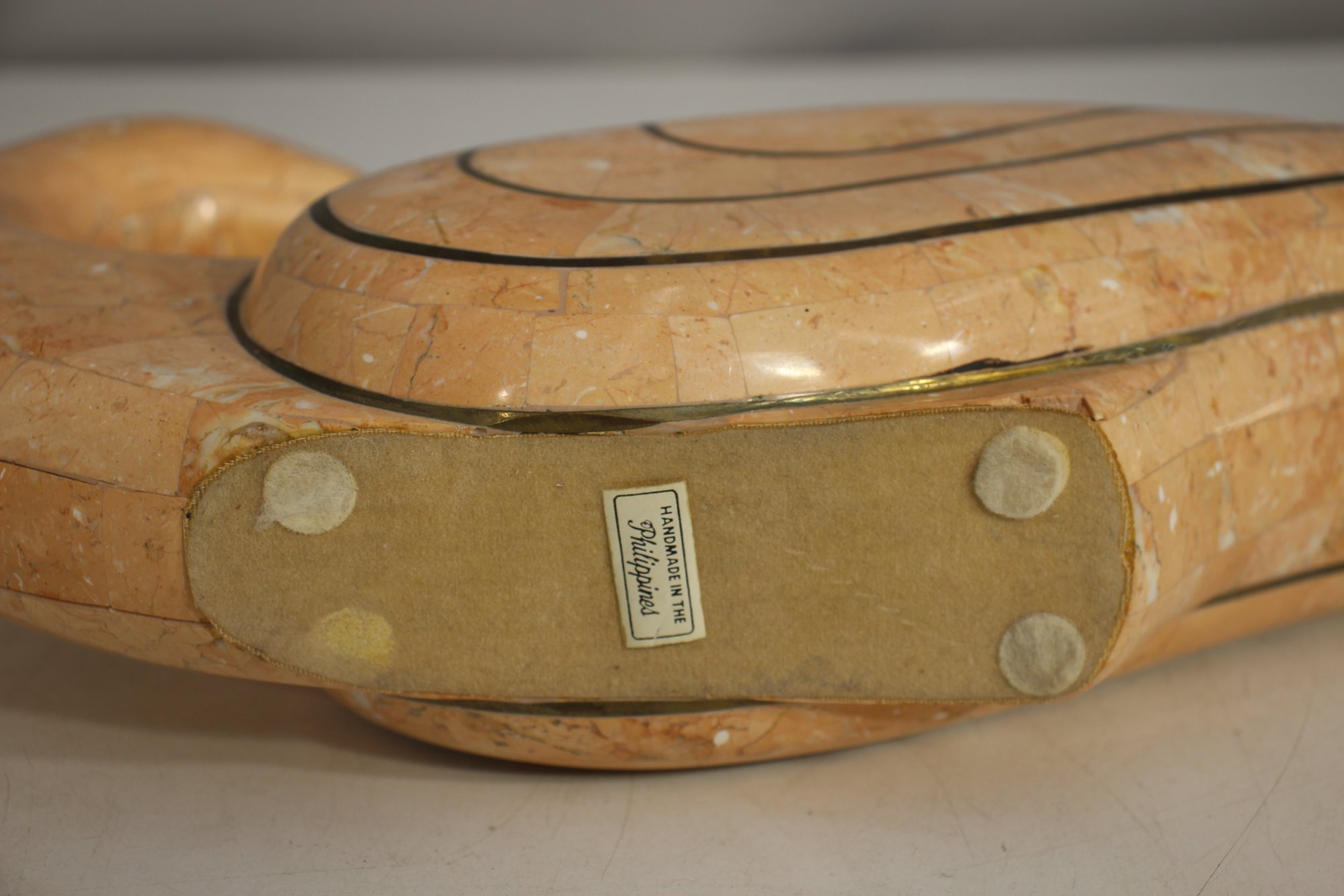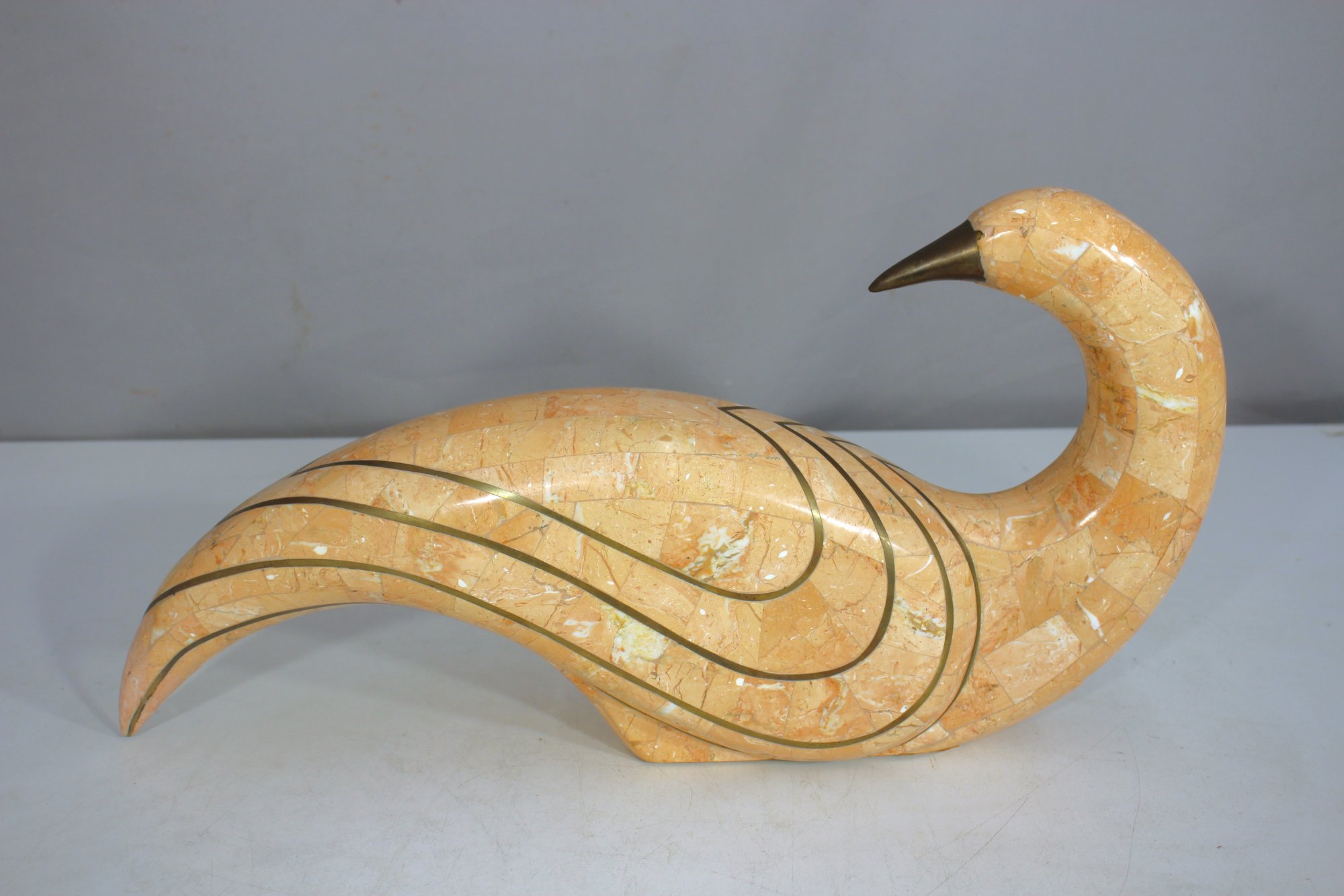 This stunning handcrafted bird sculpture is made from intricately inlaid marble with brass accents, forming elegant flowing lines across its body. The soft beige tones of the marble contrast beautifully with the polished brass beak and detailing, creating a sophisticated and timeless aesthetic. The sculpture is marked "Handmade in the Philippines" on the base, adding to its authenticity. A unique statement piece, perfect for mid-century modern, tropical, or eclectic decor. Ideal for collectors of artisan stonework and decorative sculptures.