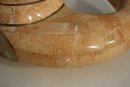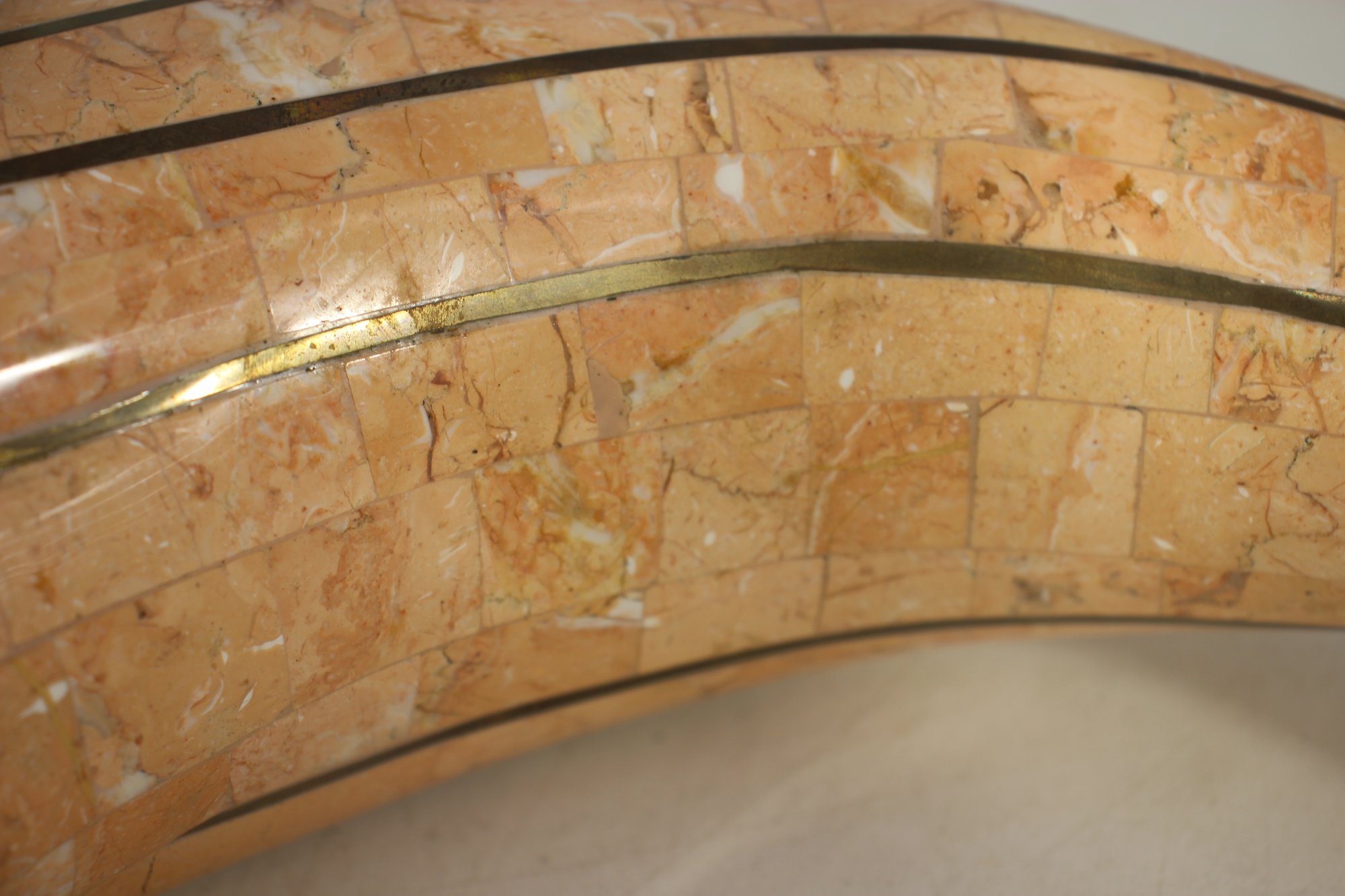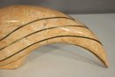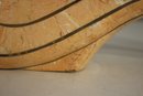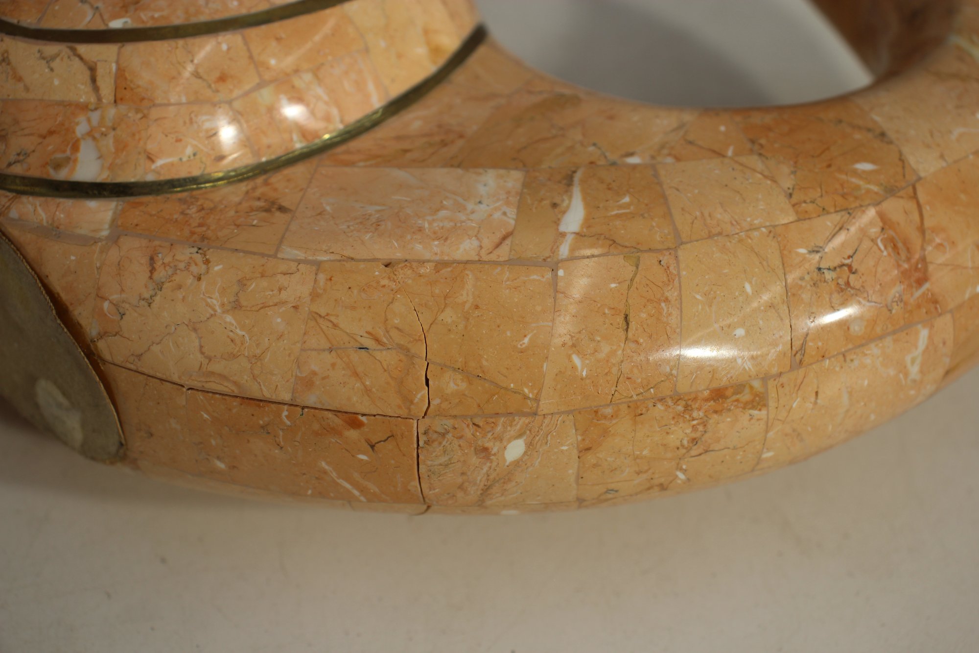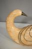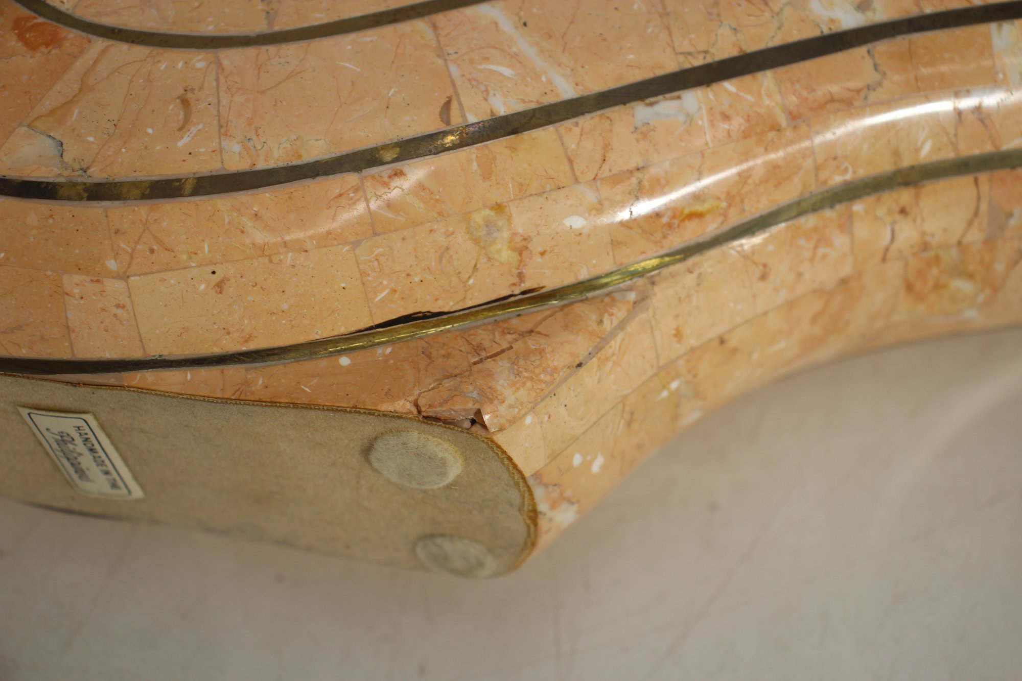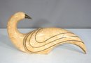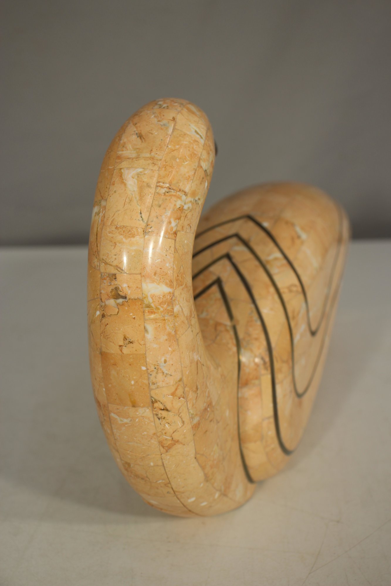This stunning handcrafted bird sculpture is made from intricately inlaid marble with brass accents, forming elegant flowing lines across its body. The soft beige tones of the marble contrast beautifully with the polished brass beak and detailing, creating a sophisticated and timeless aesthetic. The sculpture is marked "Handmade in the Philippines" on the base, adding to its authenticity. A unique statement piece, perfect for mid-century modern, tropical, or eclectic decor. Ideal for collectors of artisan stonework and decorative sculptures.