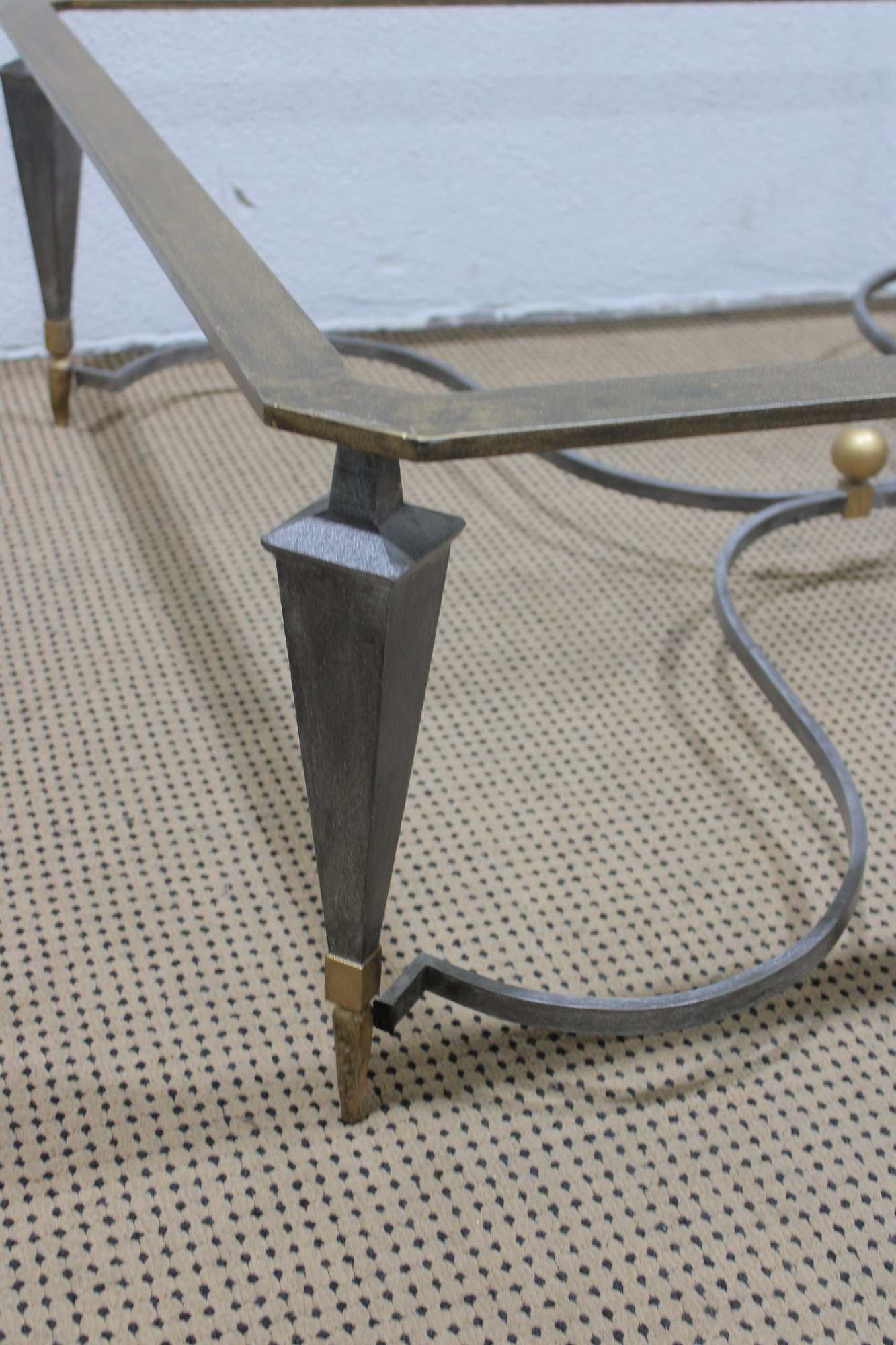 The base showcases textured iron with brass accent caps and a central decorative brass finial, giving it a sophisticated Hollywood Regency or modern neoclassical feel. The wide rectangular frame is designed to support a large glass top (glass not included), allowing you to customize with your preferred thickness and edge style.