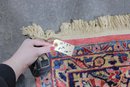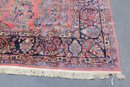 The vibrant coral-toned field is complemented by a deep navy main border, creating strong contrast and visual impact. Fringe is present along the ends, adding to its traditional character.