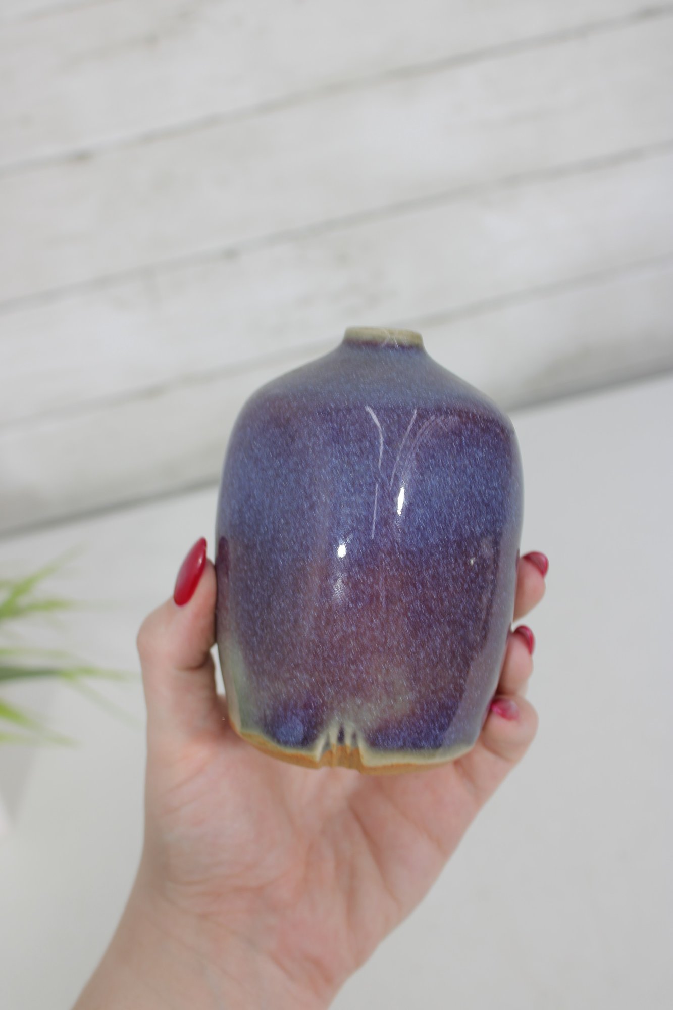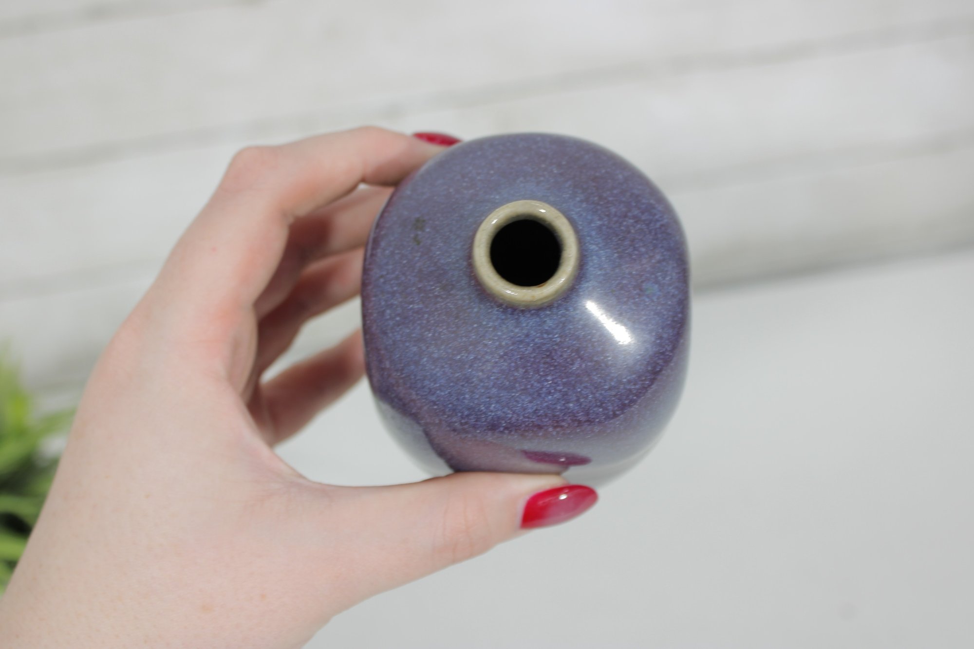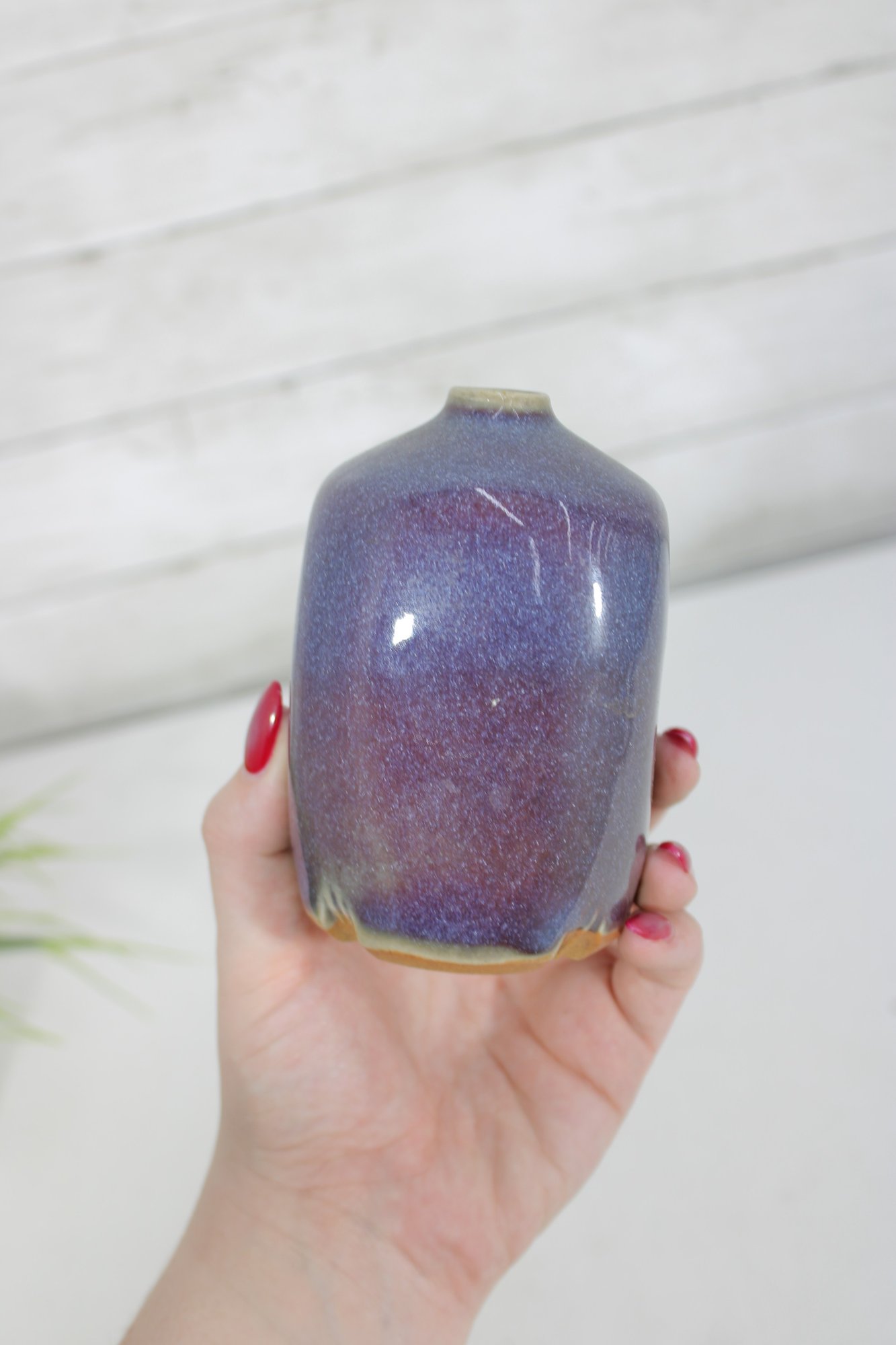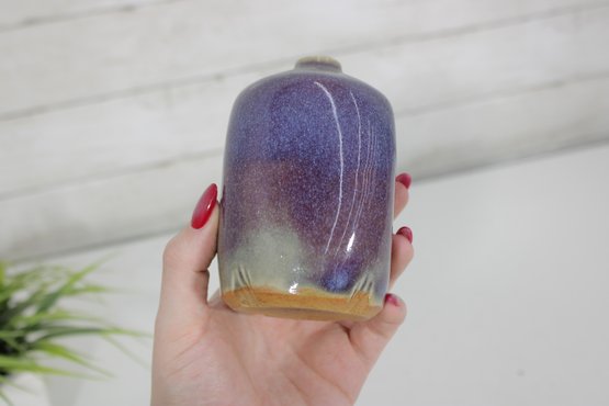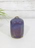 Larry Laslo for Mikasa bud vase measuring approximately 4.5 inches tall, featuring a beautifully blended blue-to-violet glazed finish. This compact, sculptural vase has a softly squared form with rounded edges and a narrow opening, ideal for displaying a single stem or small arrangement.