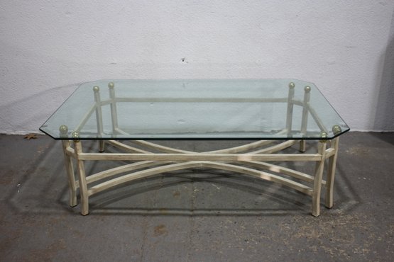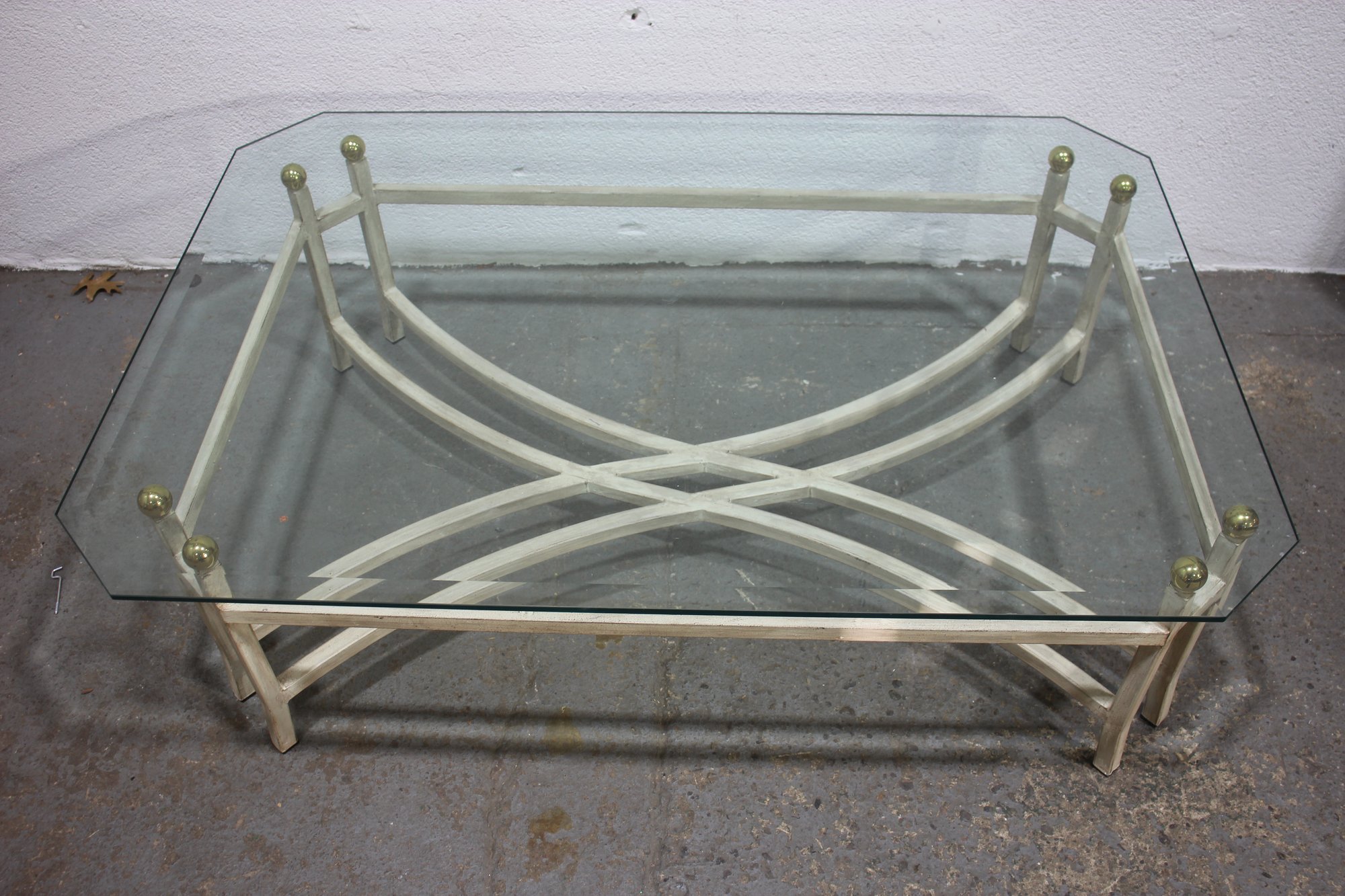 glass-top coffee table combines contemporary style with timeless sophistication. The table features a sturdy metal base with an intricate crossed design and a soft cream finish, adding visual interest and modern charm. Brass-toned accents at the corners provide a touch of luxury, complementing the clean lines of the frame.