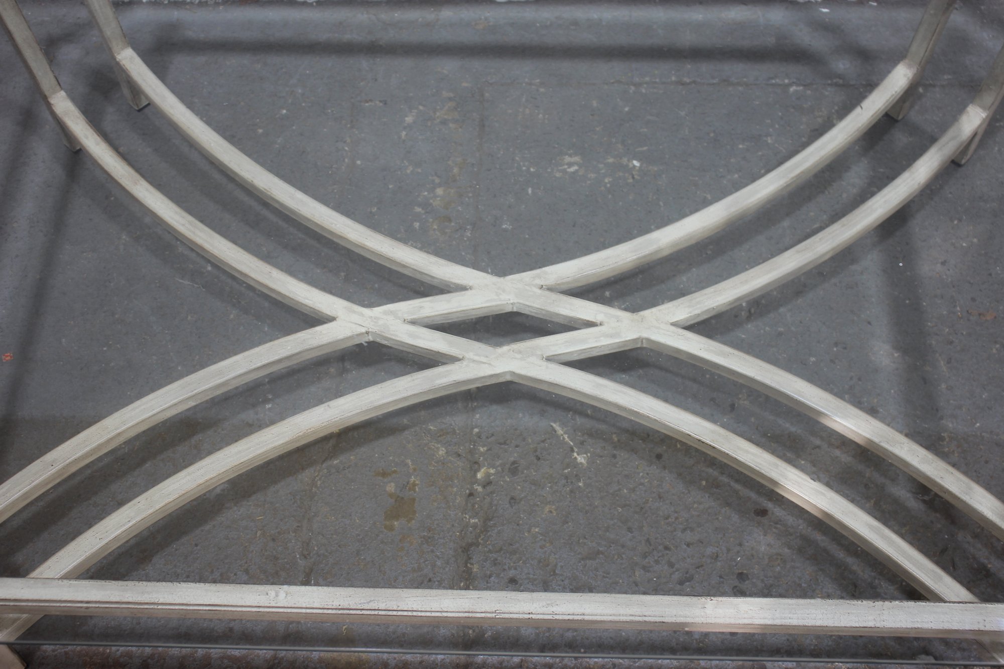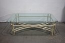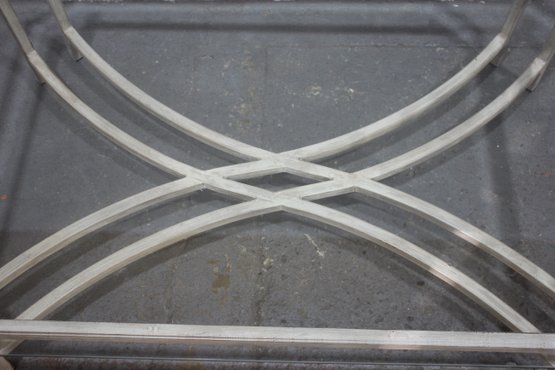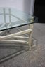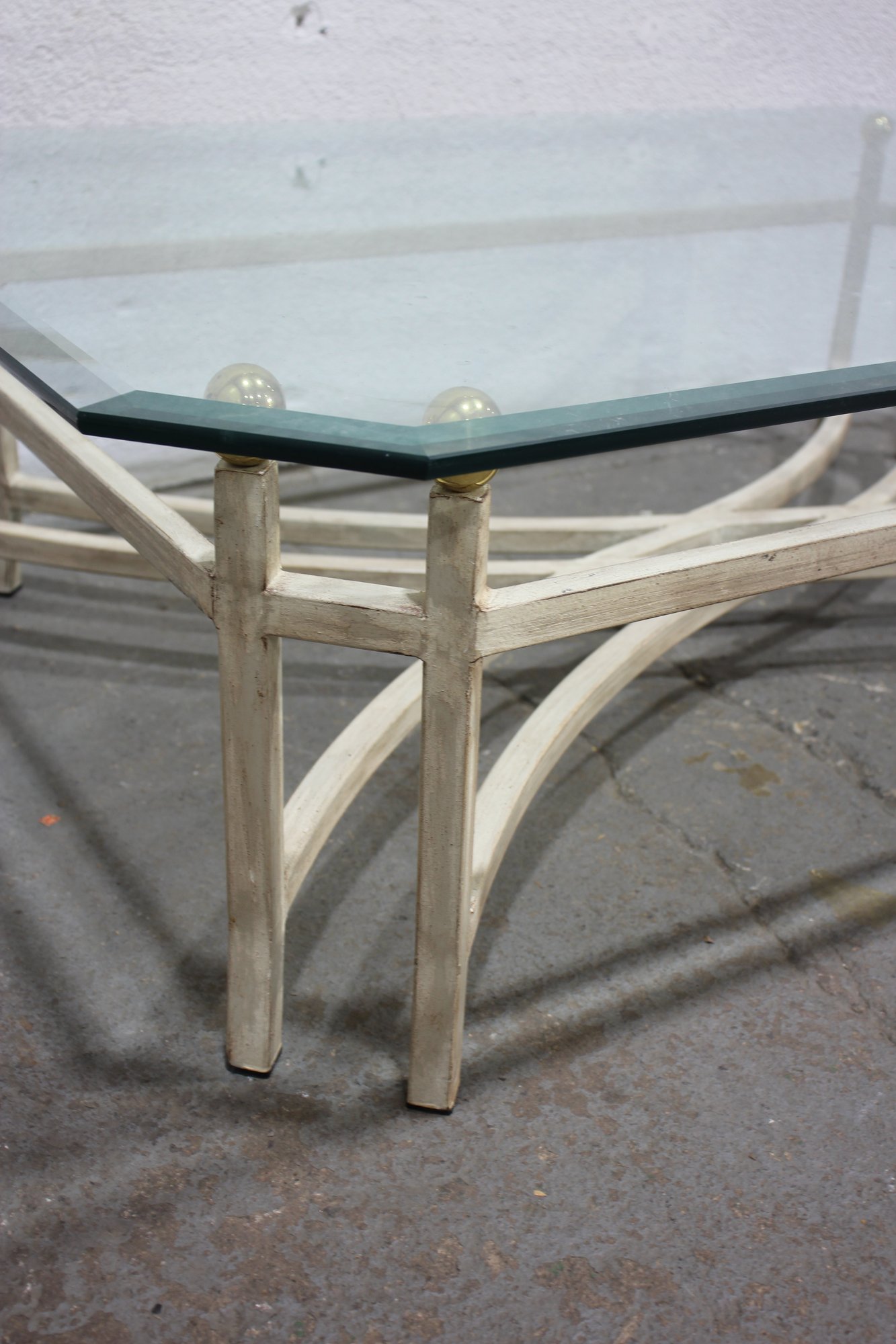 The top is a beveled glass panel, offering a spacious surface for decor, books, or drinks while enhancing the table's airy and open design. This piece is perfect for a living room, sunroom, or any space needing a refined focal point.