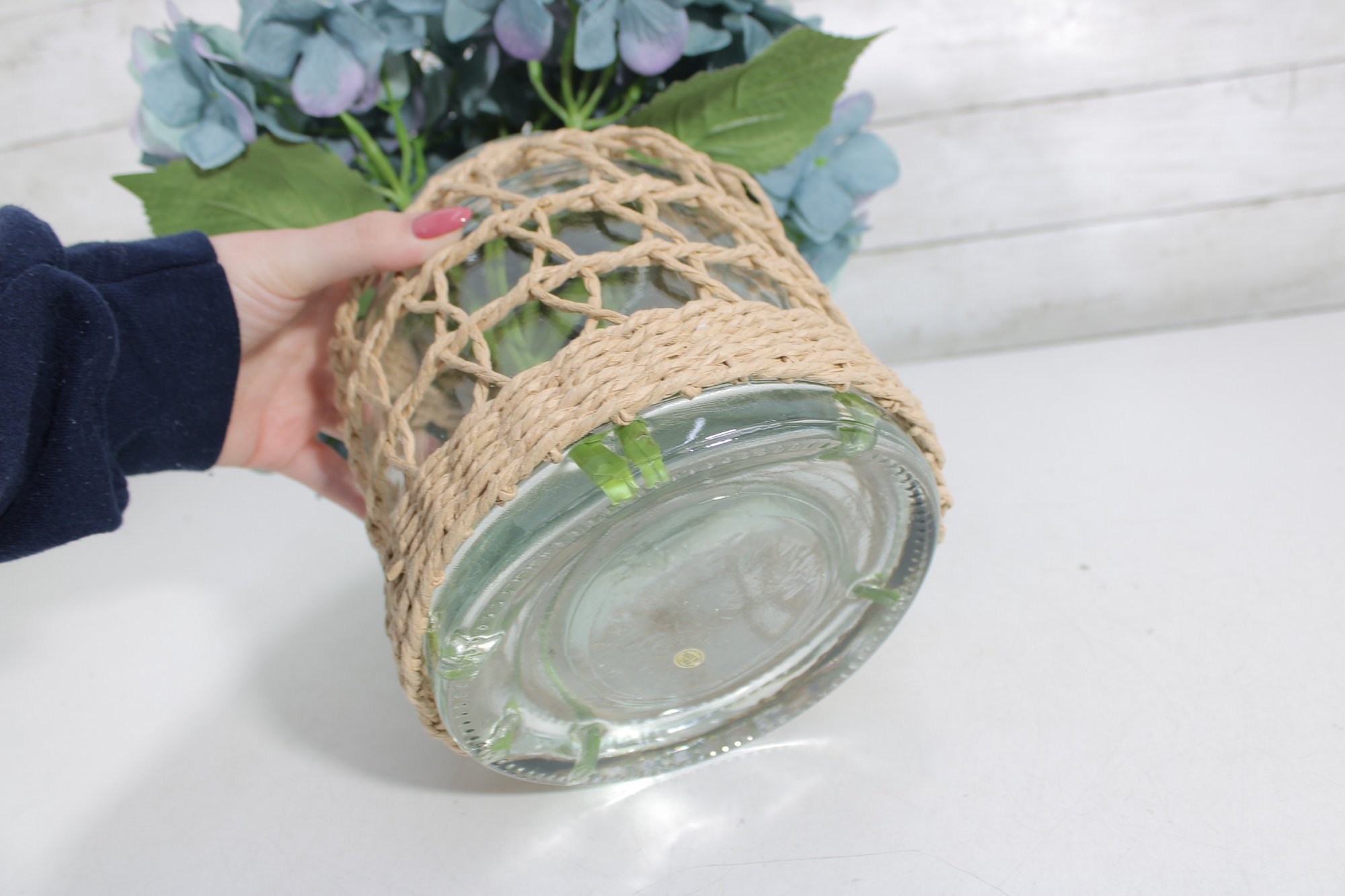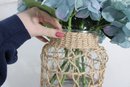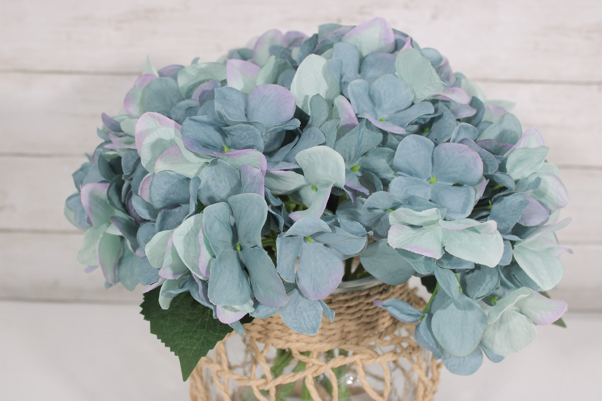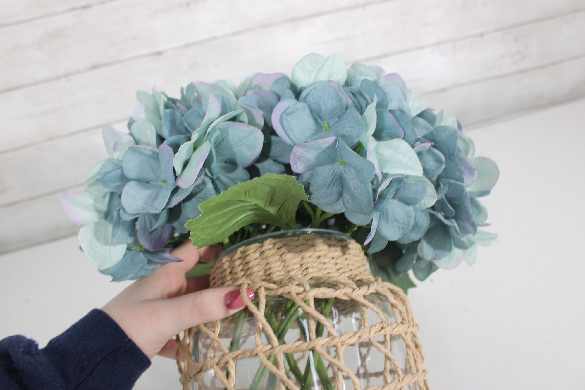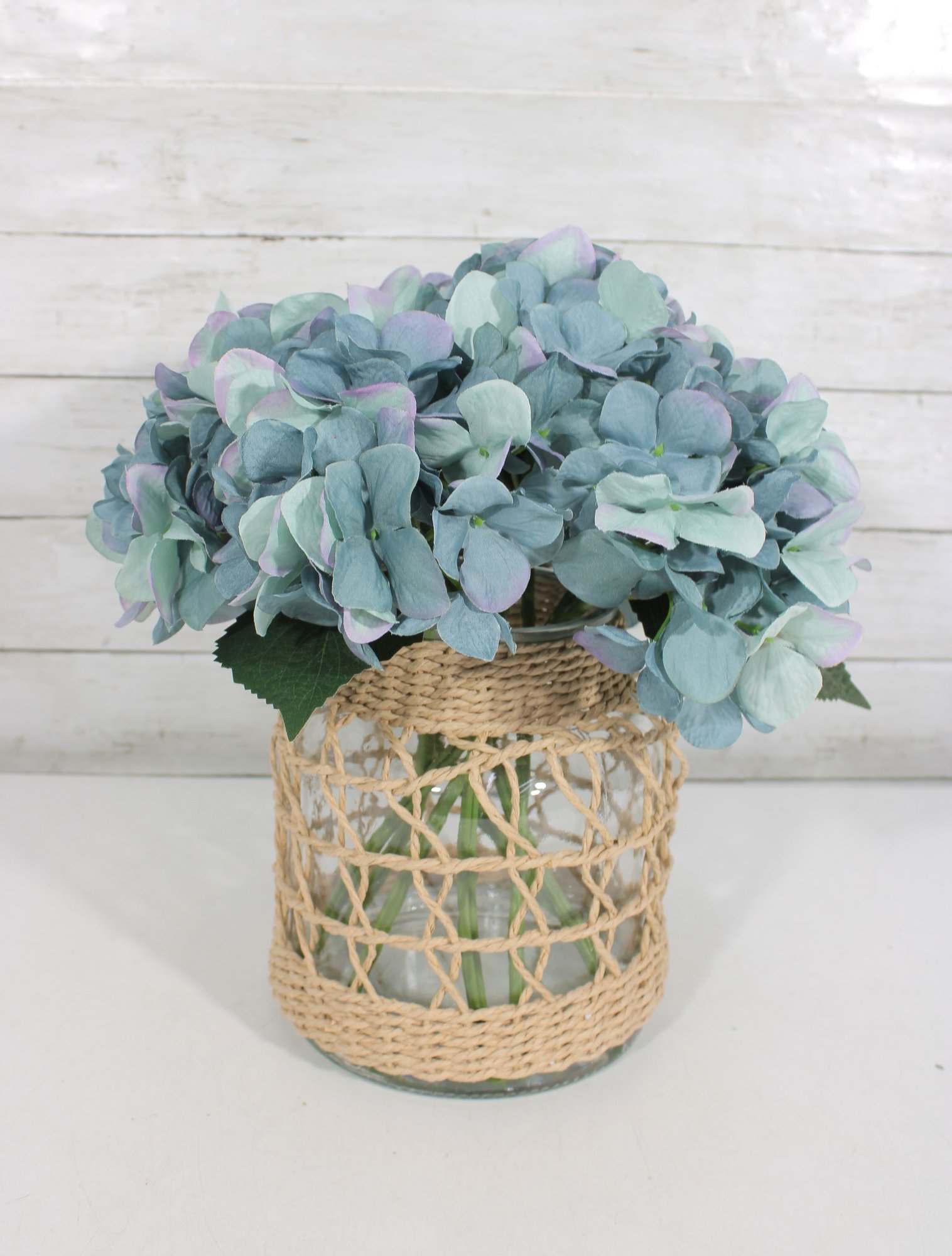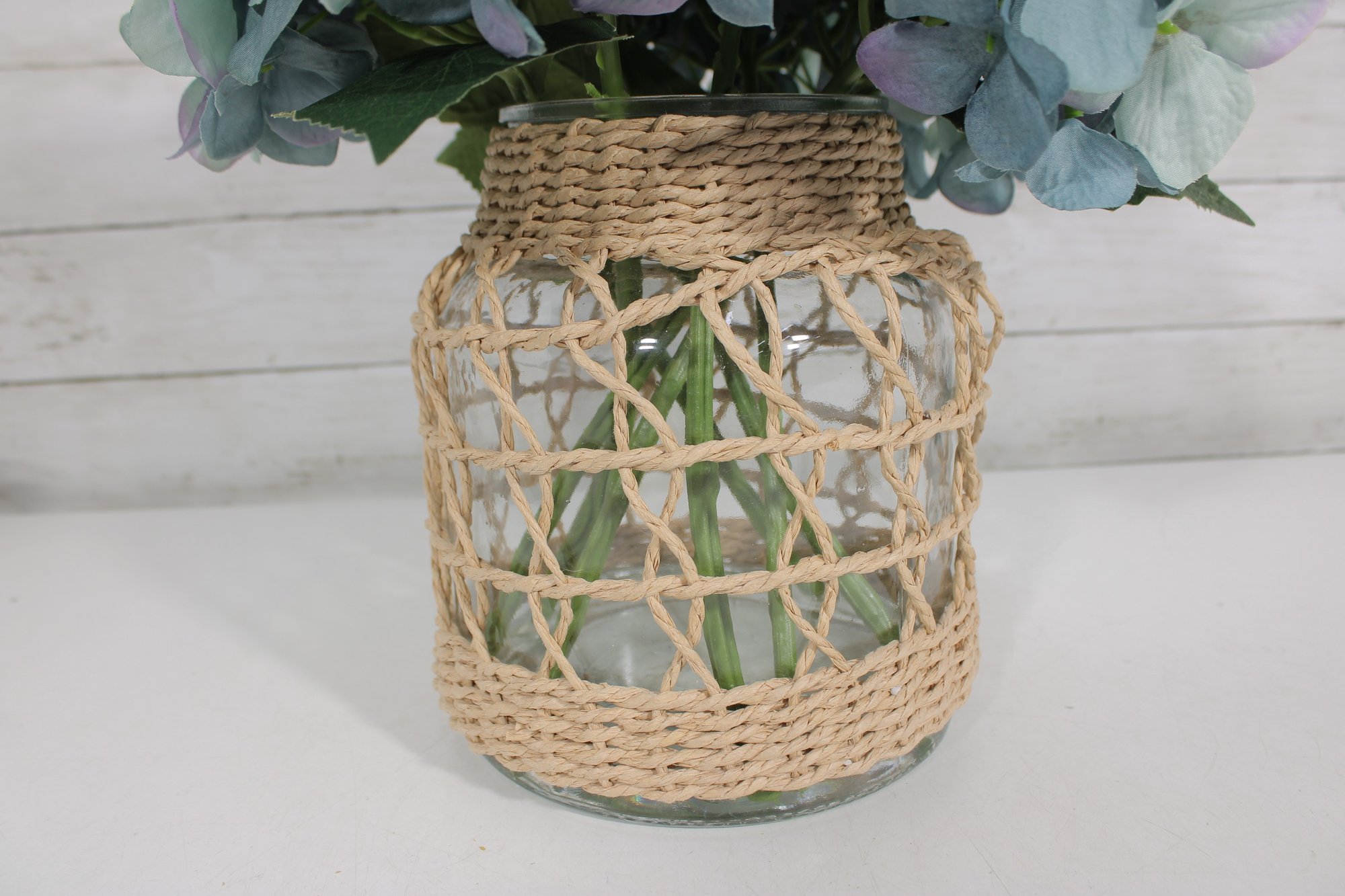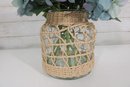 Charming decorative vase with woven rattan cover featuring a full faux blue hydrangea arrangement. The clear glass vase is wrapped in a natural wicker-style lattice, giving the piece a warm rustic, coastal, or farmhouse décor look.