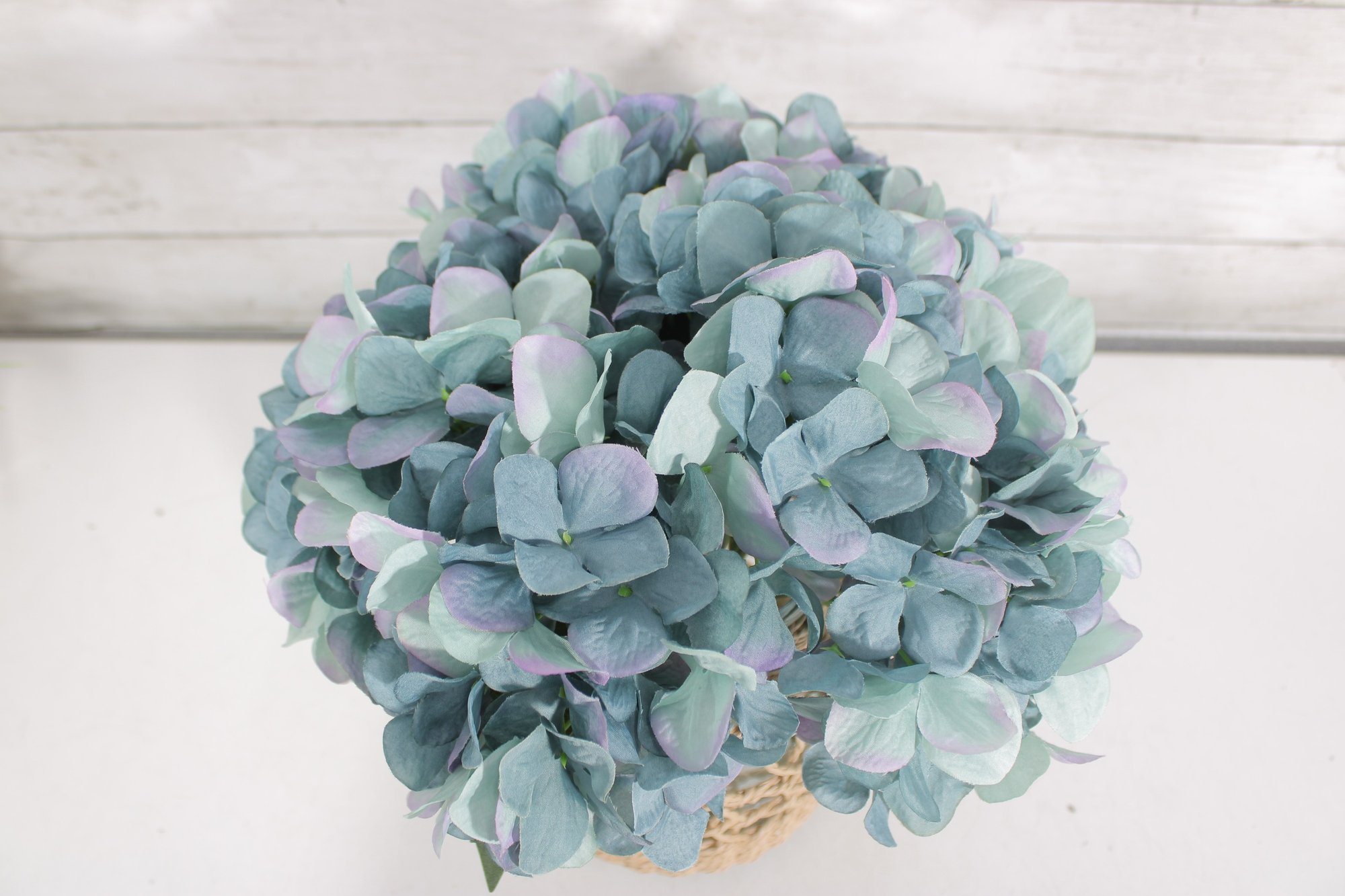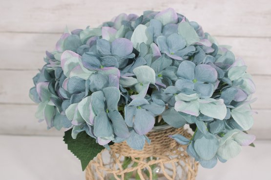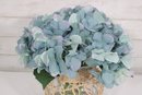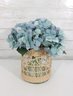 The arrangement includes a large cluster of soft blue hydrangea flowers with realistic petals and greenery, creating a full and elegant display that requires no maintenance. This piece works beautifully as a table centerpiece, shelf décor, or accent for living rooms, kitchens, or entryways.