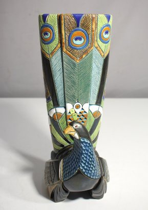 This stunning Artesania Rinconada ceramic vase, inspired by Art Deco design, features a beautifully detailed peacock motif. The peacock, with its vibrant feathers fanned out, showcases exquisite hand-painted craftsmanship with intricate geometric patterns and bold colors. This vase, from the late 20th century, combines functionality and artistry, making it a perfect decorative piece for any home or collection. The vase stands as a testament to the unique and artistic approach of Artesania Rinconada's renowned ceramic artisans. Excellent condition, ready to enhance your décor.
