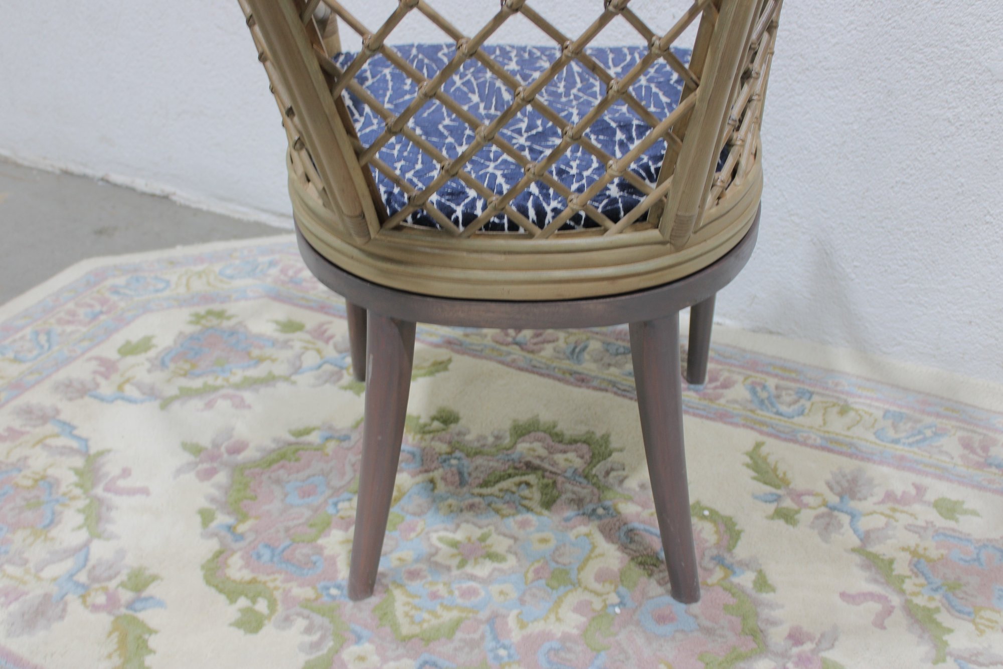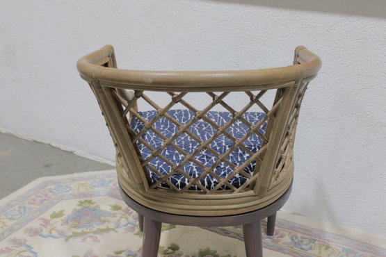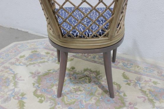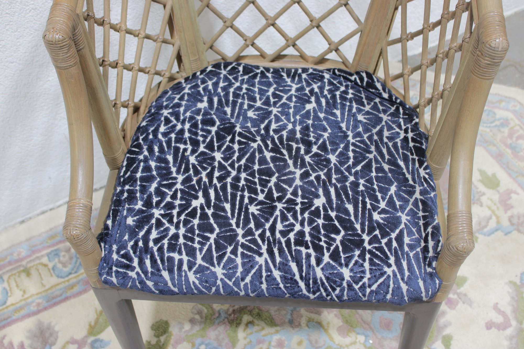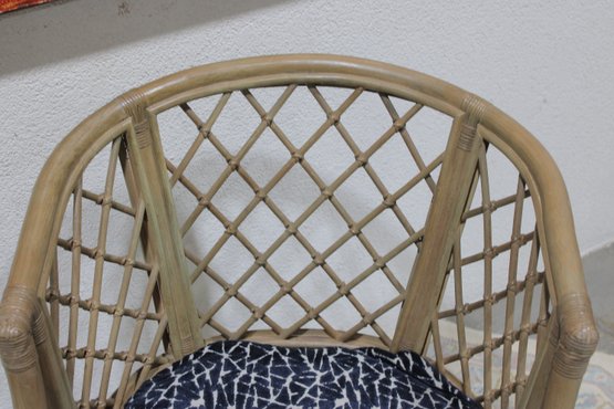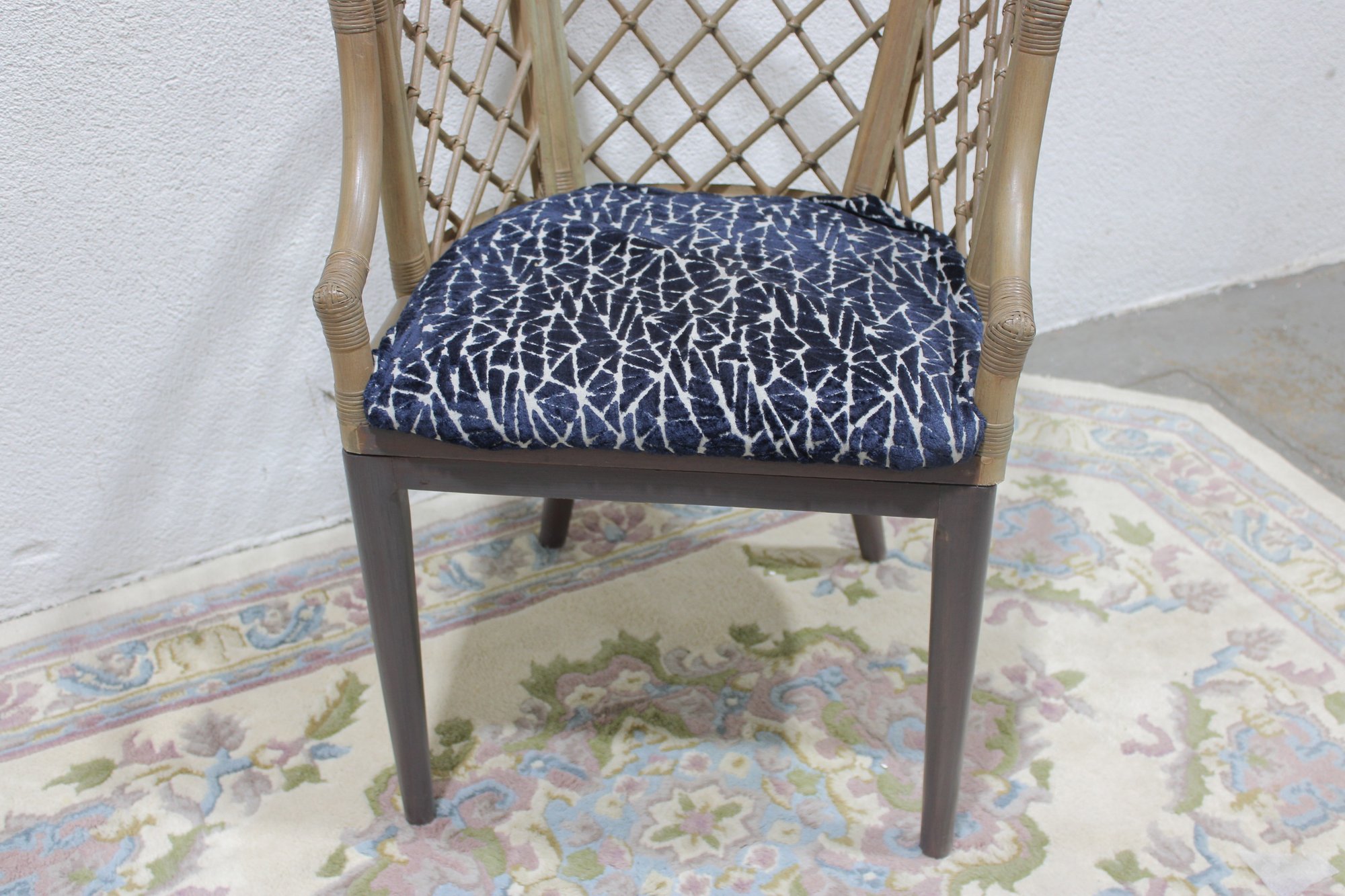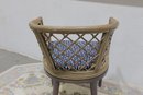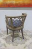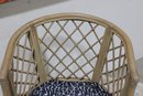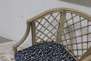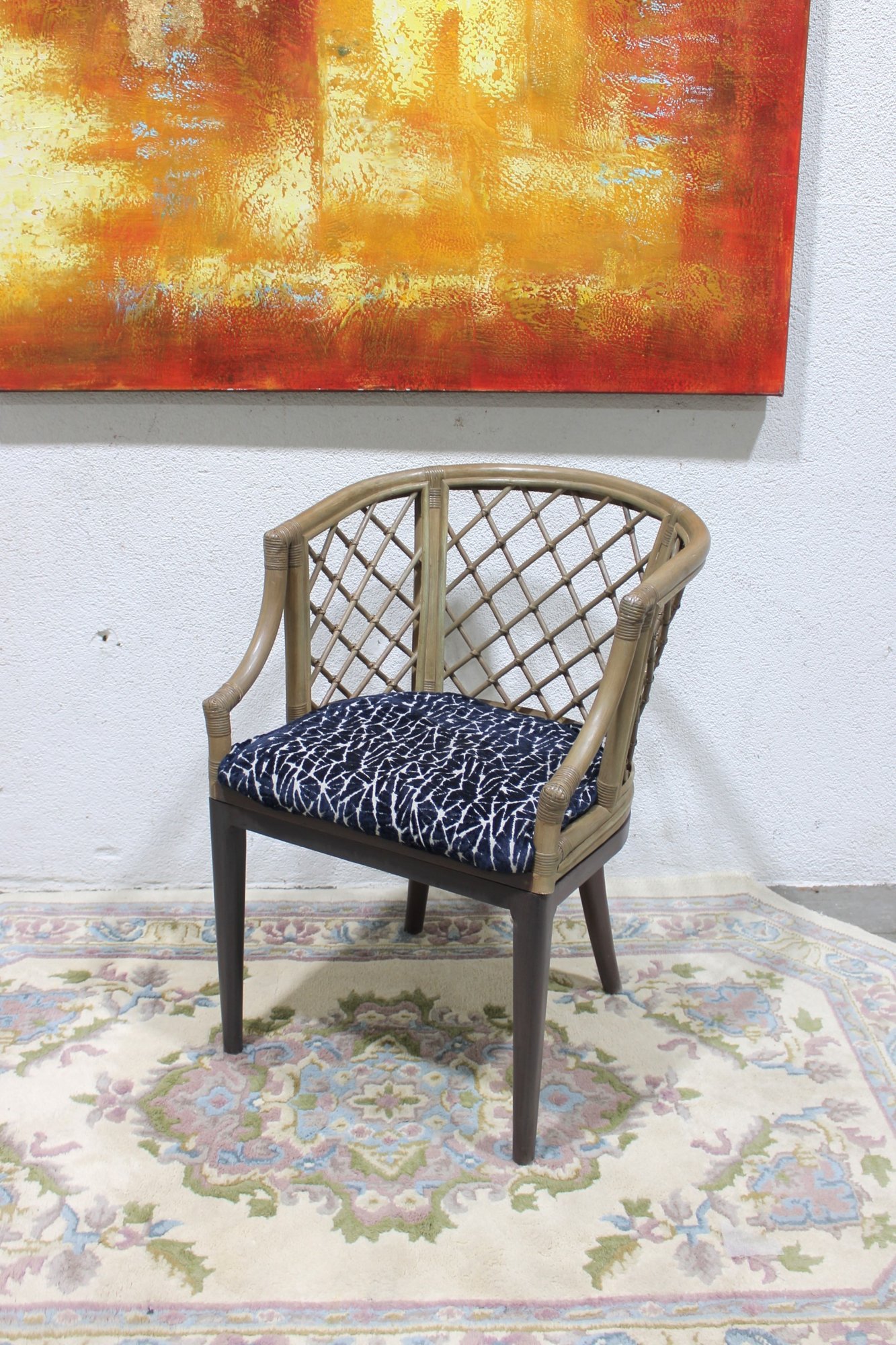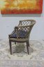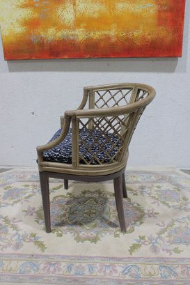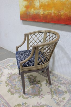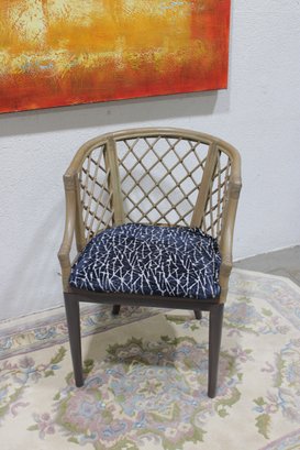 Stylish accent armchair featuring a curved frame with open lattice back and sides, gently shaped arms, and a padded upholstered seat in a bold black and white patterned fabric. A versatile chair that works well as a vanity chair, desk chair, bedroom accent, or occasional seating in a living space. Its decorative silhouette adds a light, elegant look with transitional appeal.