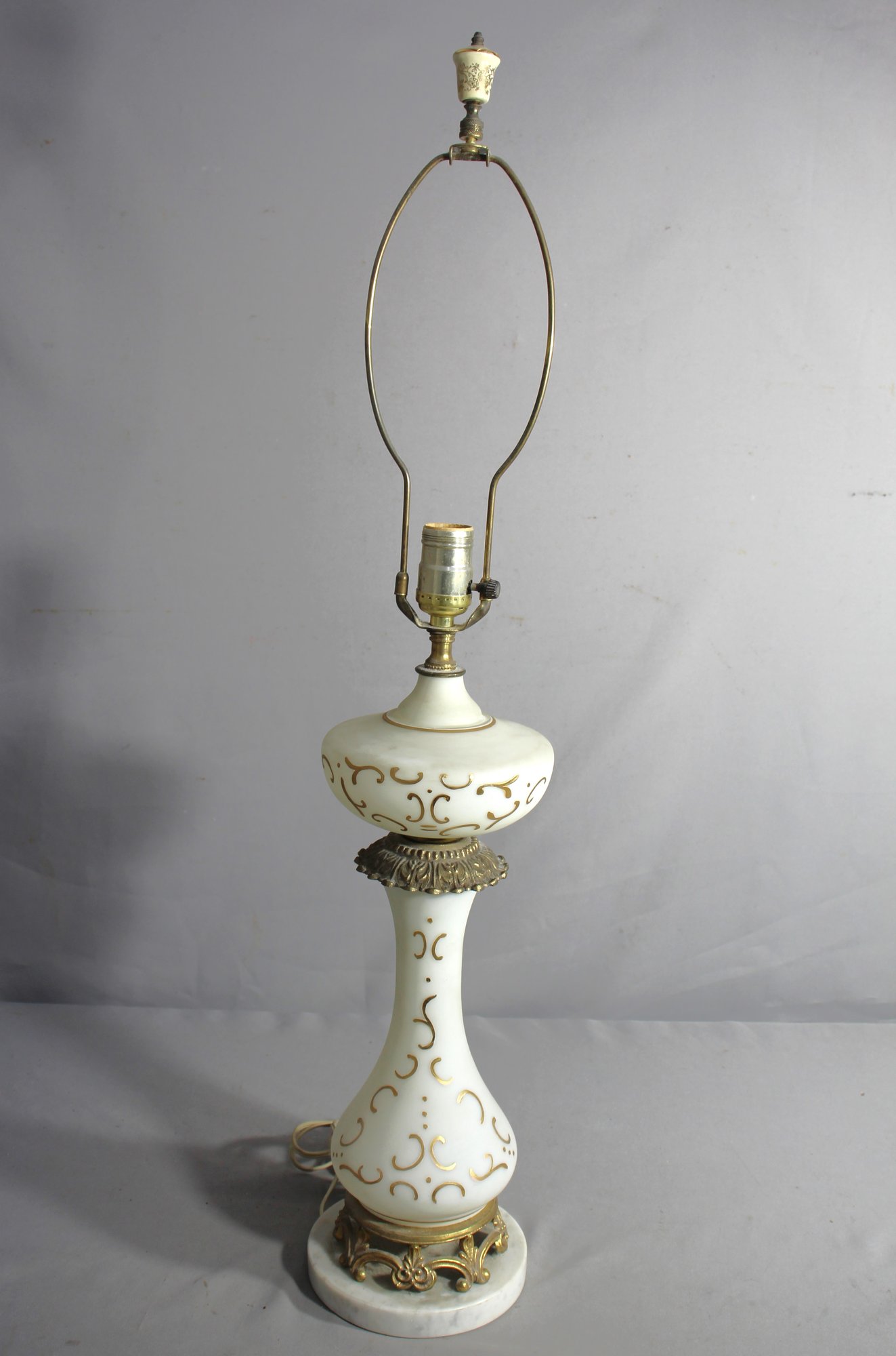 Gilded brass-toned metal embellishments enhance the lamp's neck and base, providing a rich, antique look.