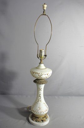 The lamp features a sinuous form, with scrolled gold motifs elegantly contrasting against the creamy ceramic background.