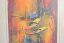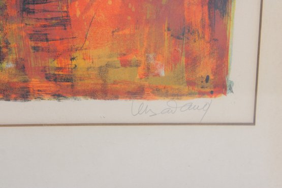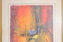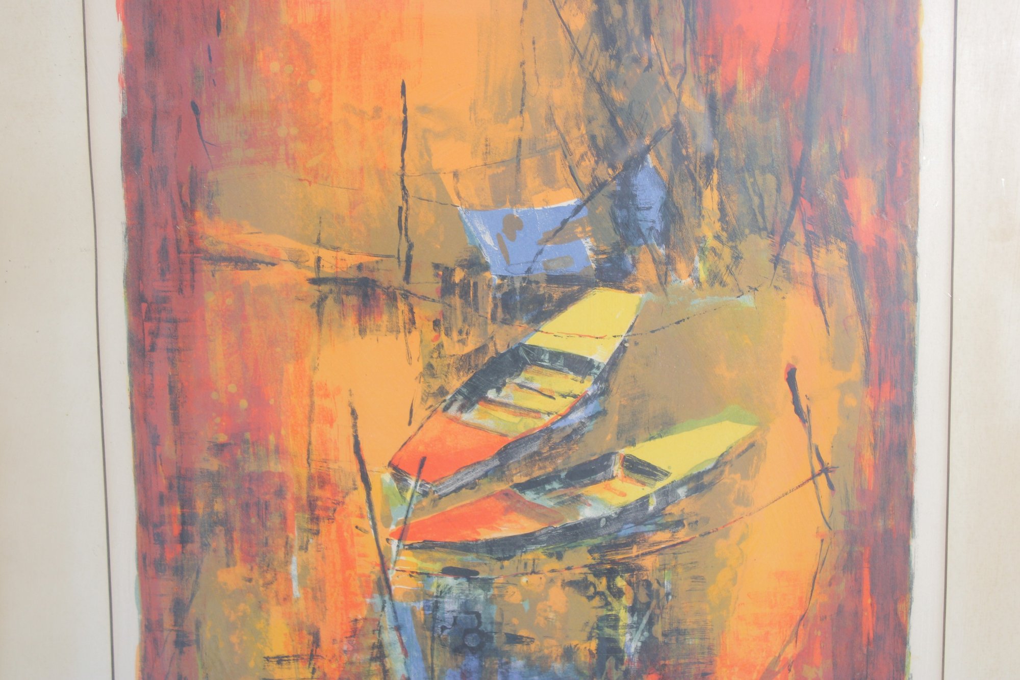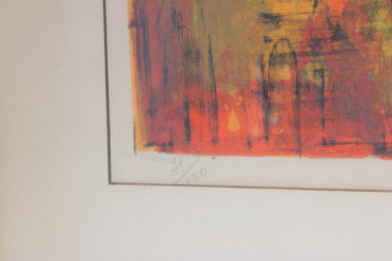 Striking limited edition lithograph by Le Ba Dang, pencil signed and numbered 21/120. This expressive composition features an abstract harbor or waterfront scene with boats and architectural elements, rendered in rich, layered tones of orange, red, yellow, and blue.