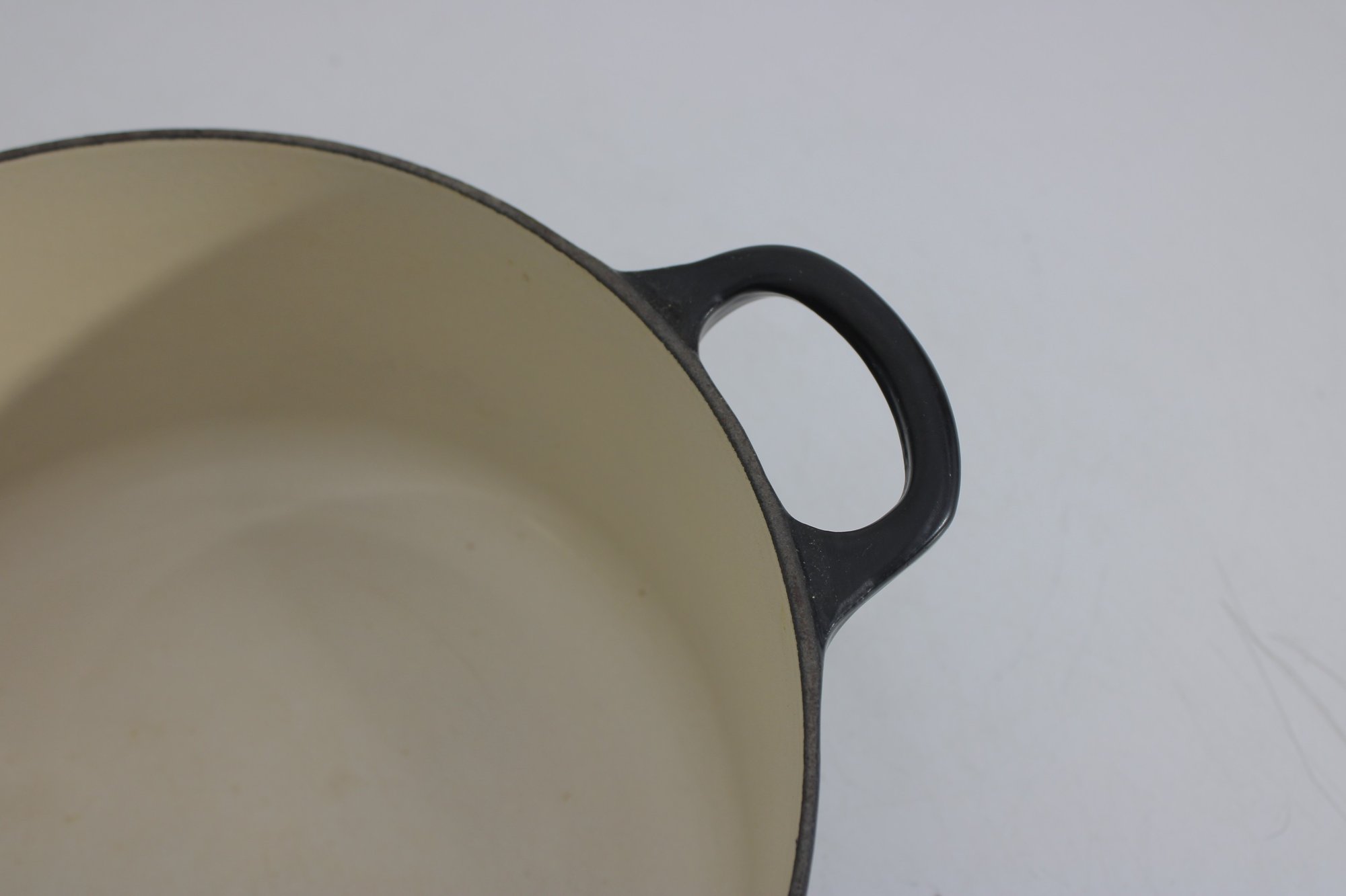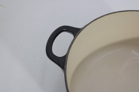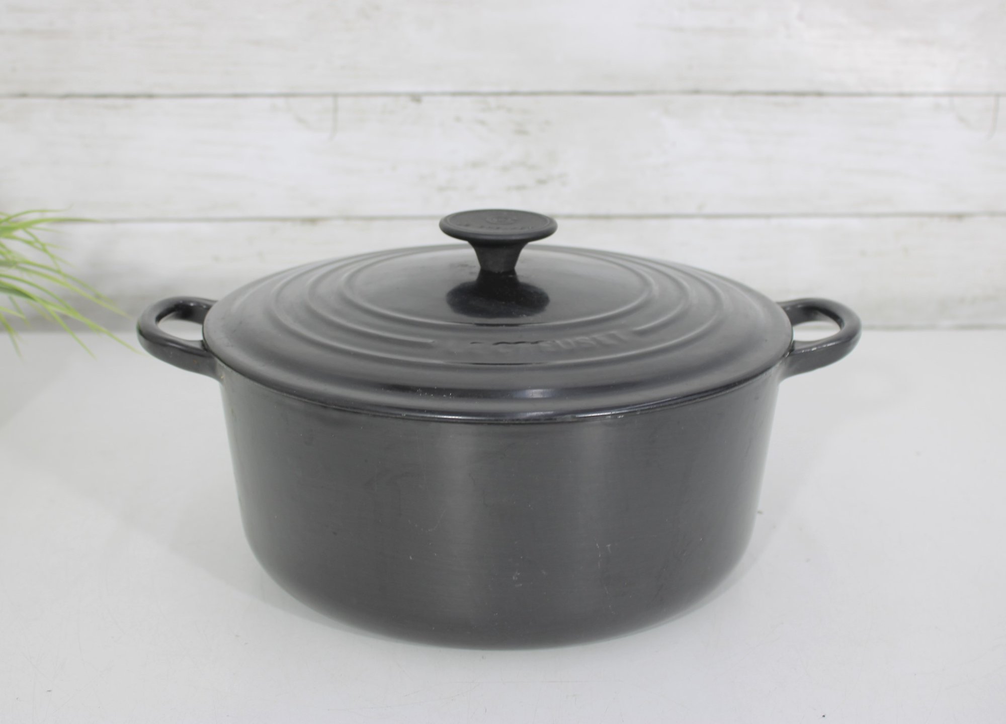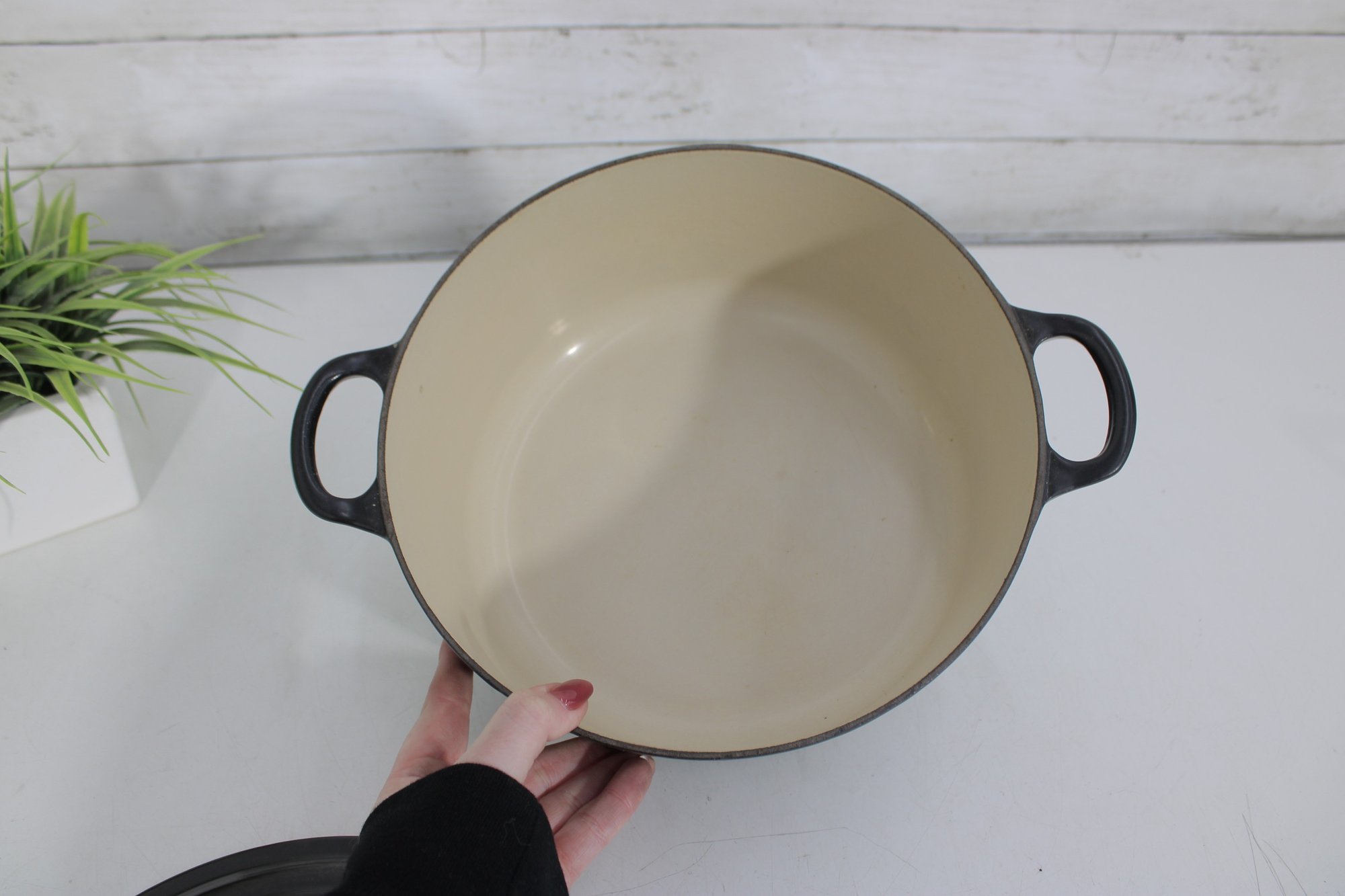 Authentic Le Creuset cast iron Dutch oven, proudly Made in France, measuring approximately 5” high x 10” round (excluding handles).