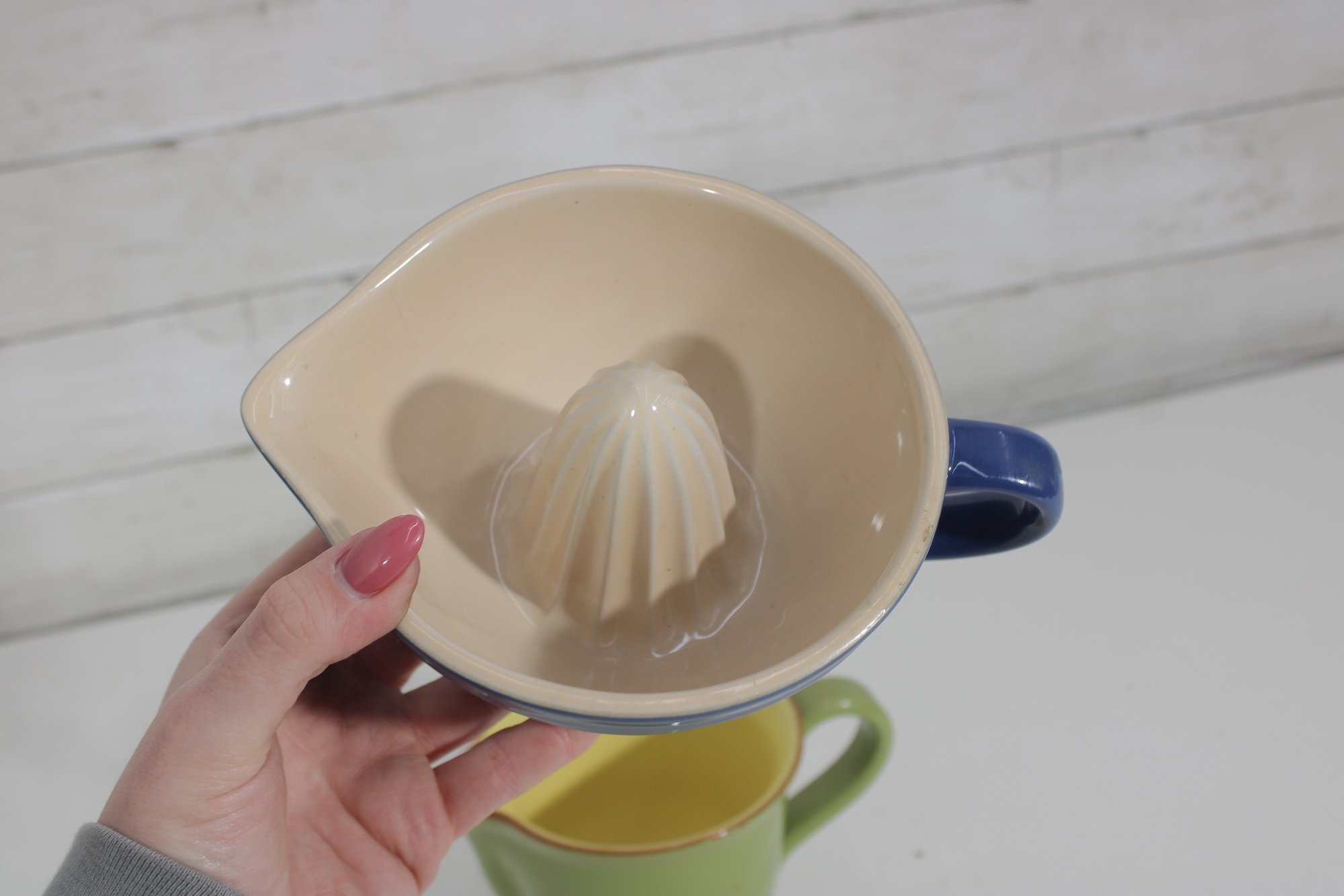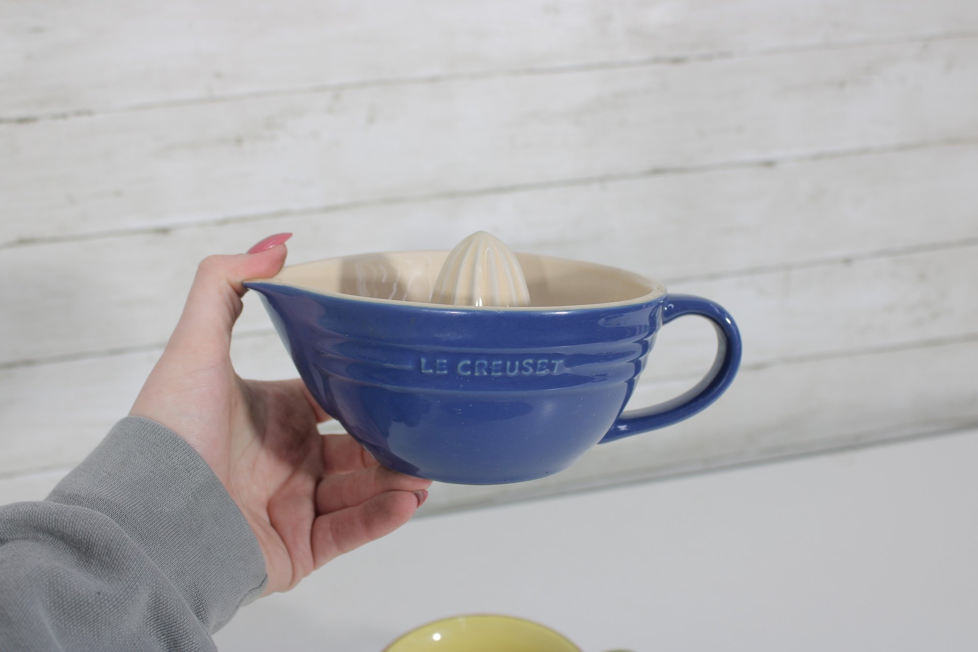 **Le Creuset Citrus Juicer – Classic blue exterior with cream interior and built-in reamer. Features a convenient spout and handle for easy pouring. Ideal for fresh lemon, lime, or orange juice.
