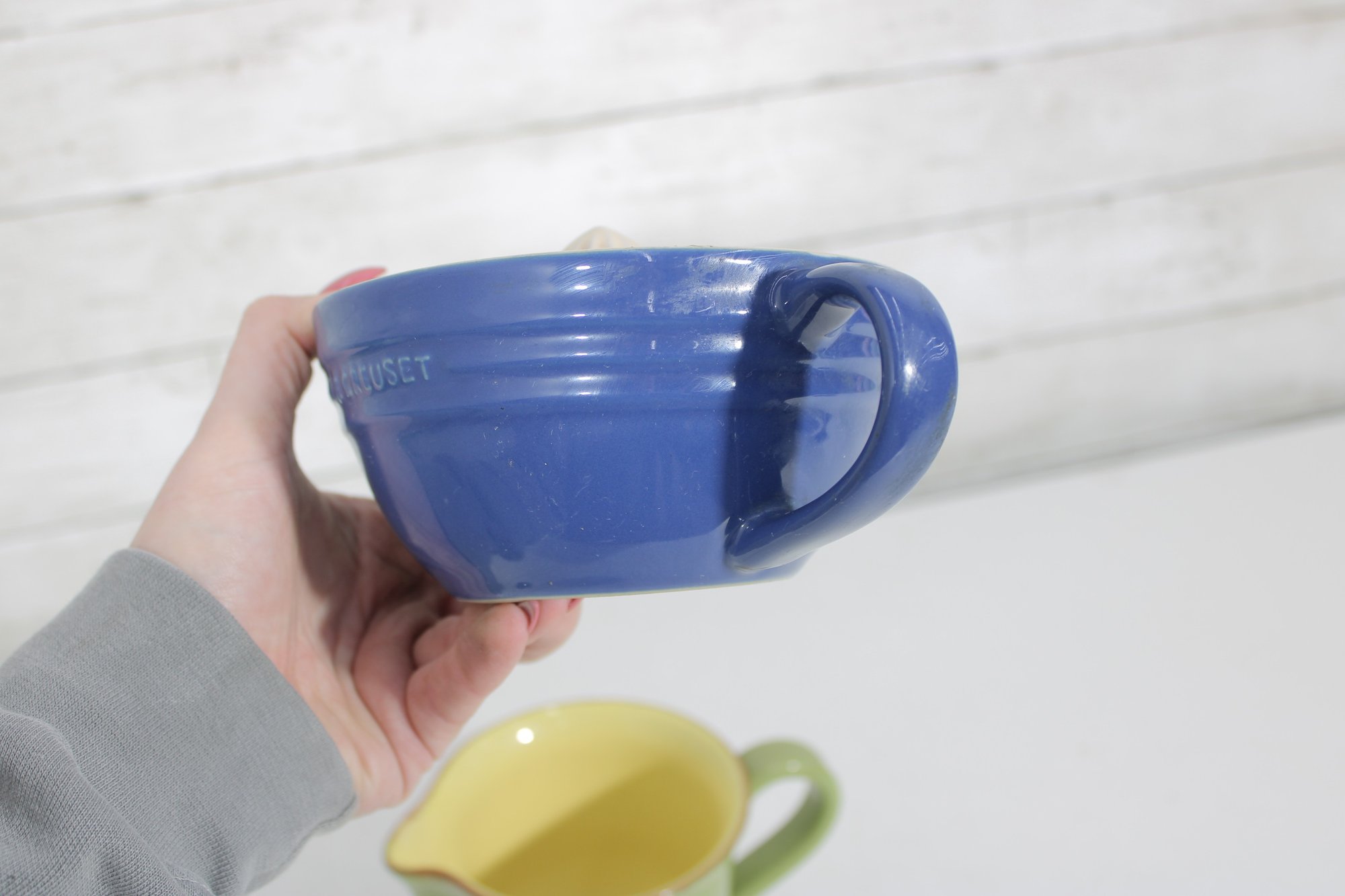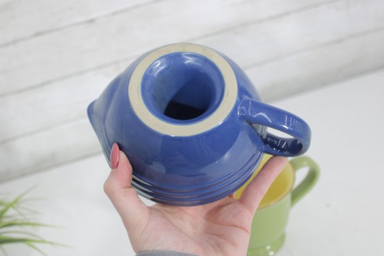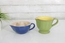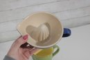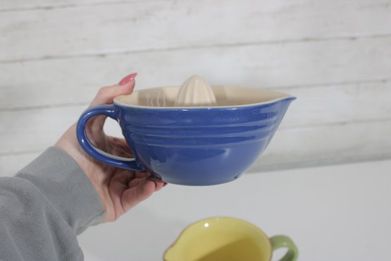 Brighten your kitchen with this charming two-piece stoneware set featuring a Le Creuset citrus juicer and a Vietri ceramic pitcher. Both pieces combine functionality with vibrant color, making them perfect for everyday use or display.
