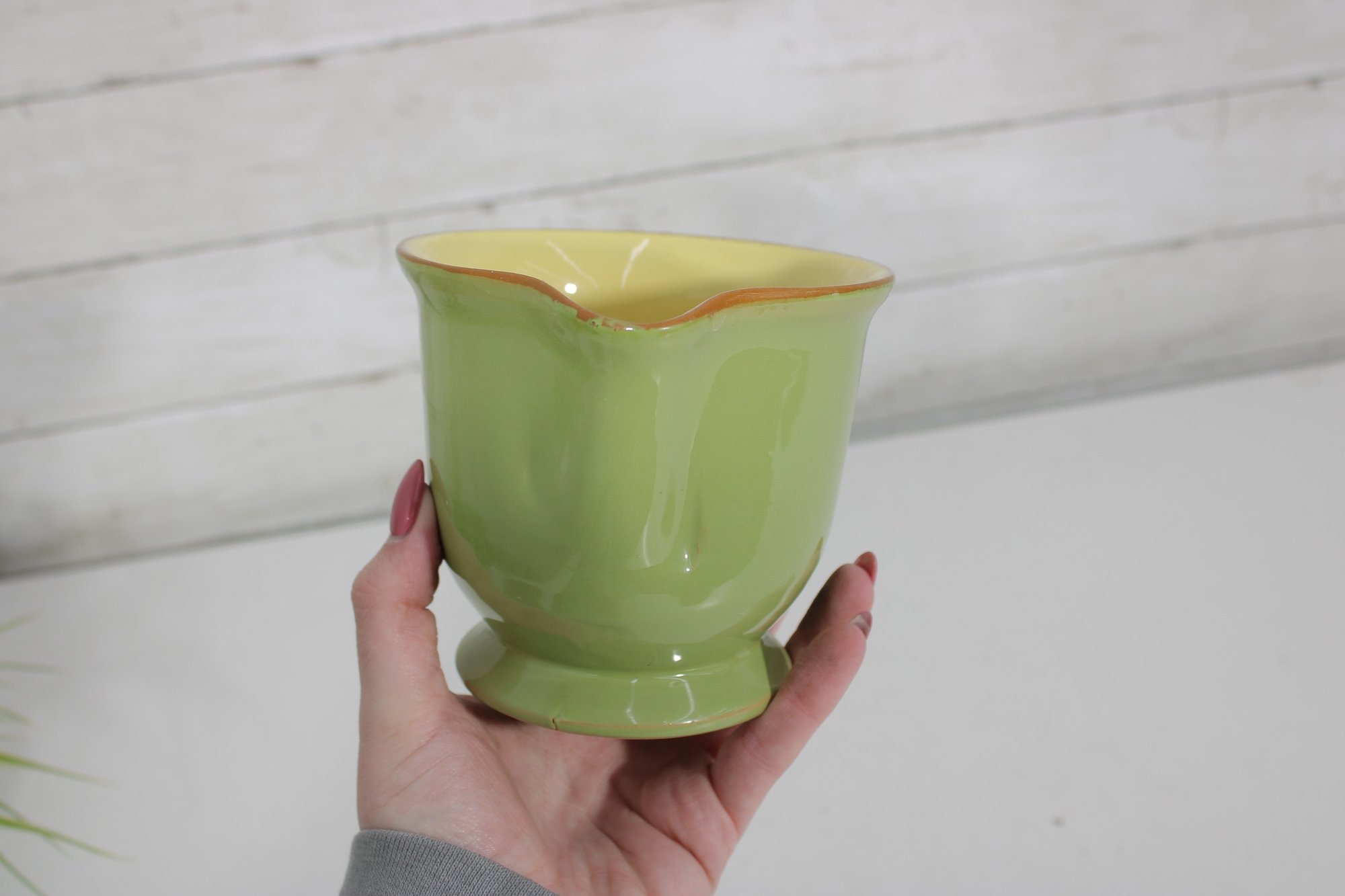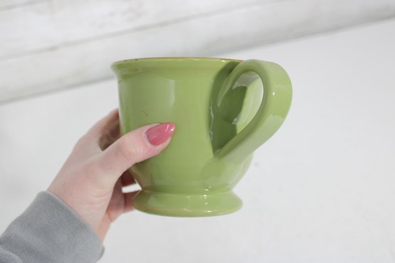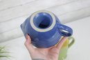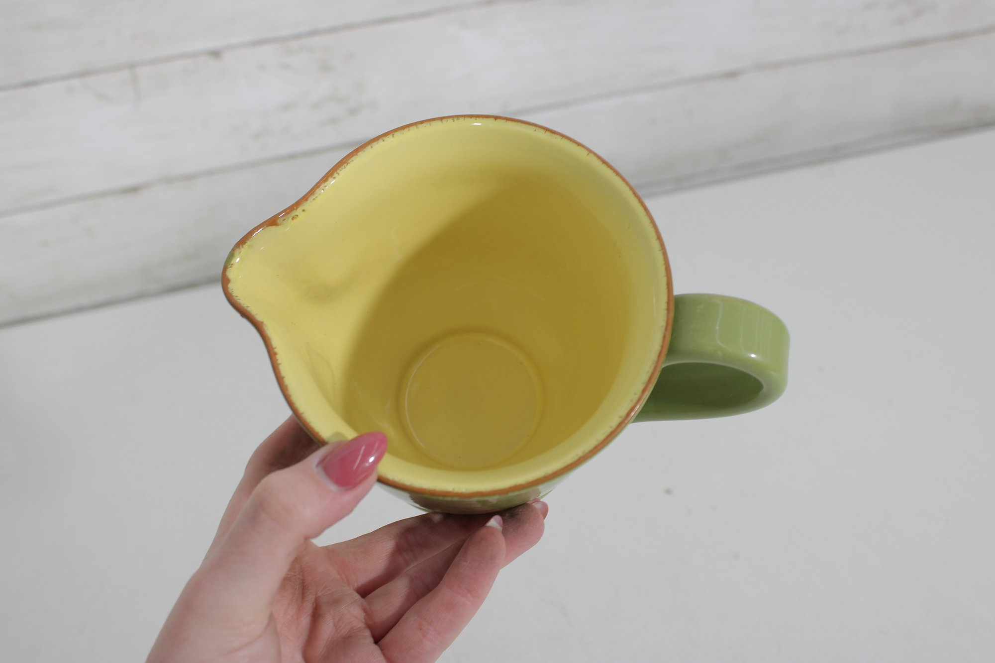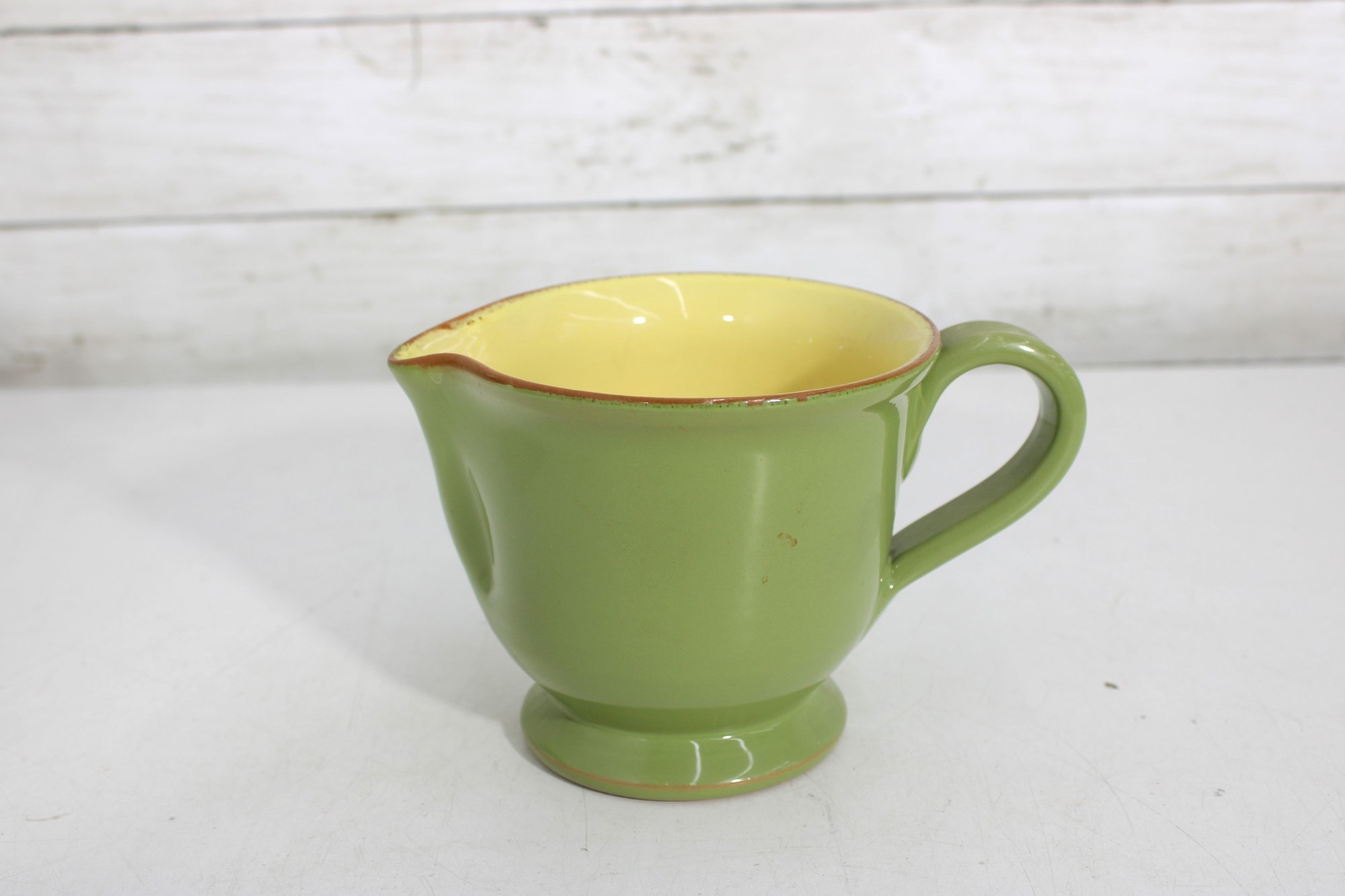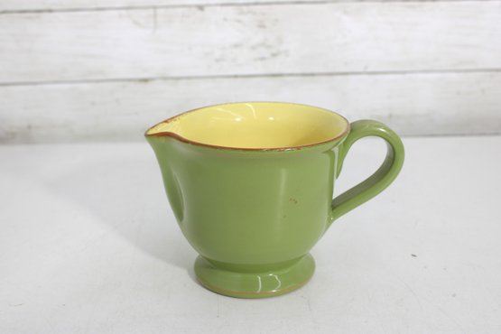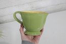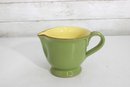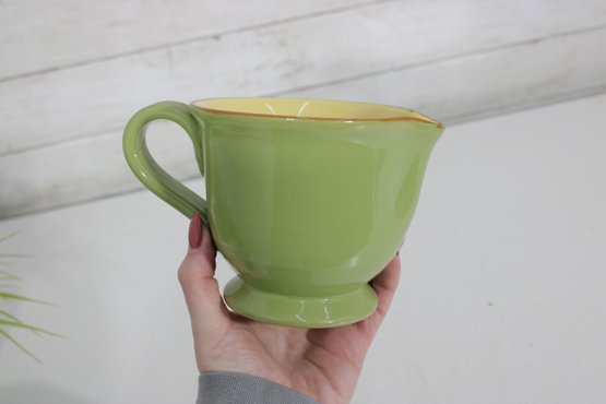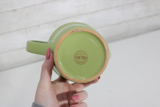 Vietri Pitcher – Beautiful green exterior with a warm yellow interior, marked “Vietri” on the base. Features a comfortable handle and pouring spout, perfect for serving beverages or as a decorative accent.