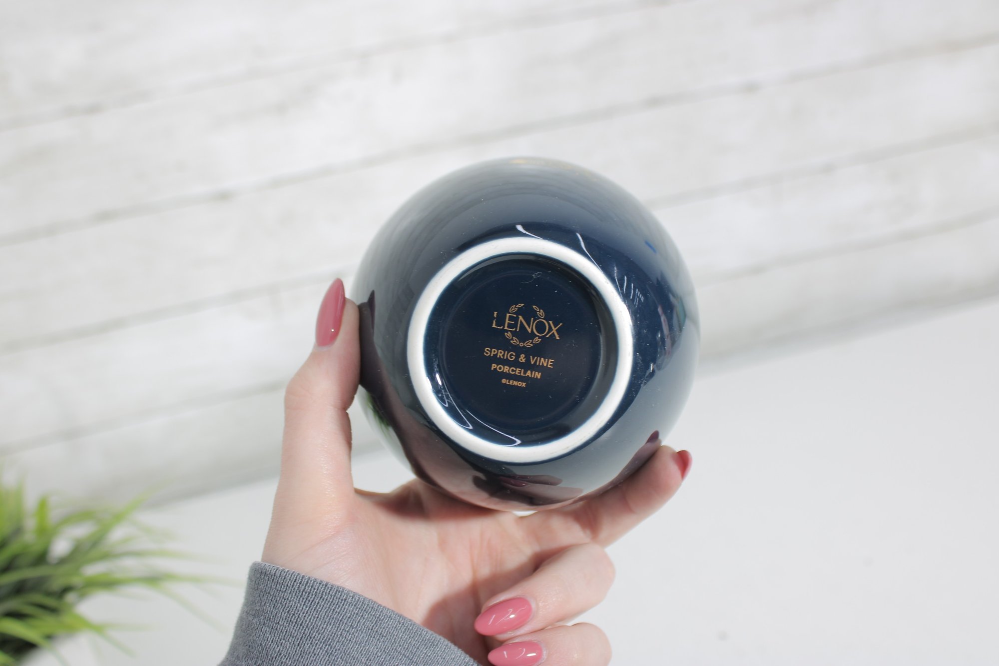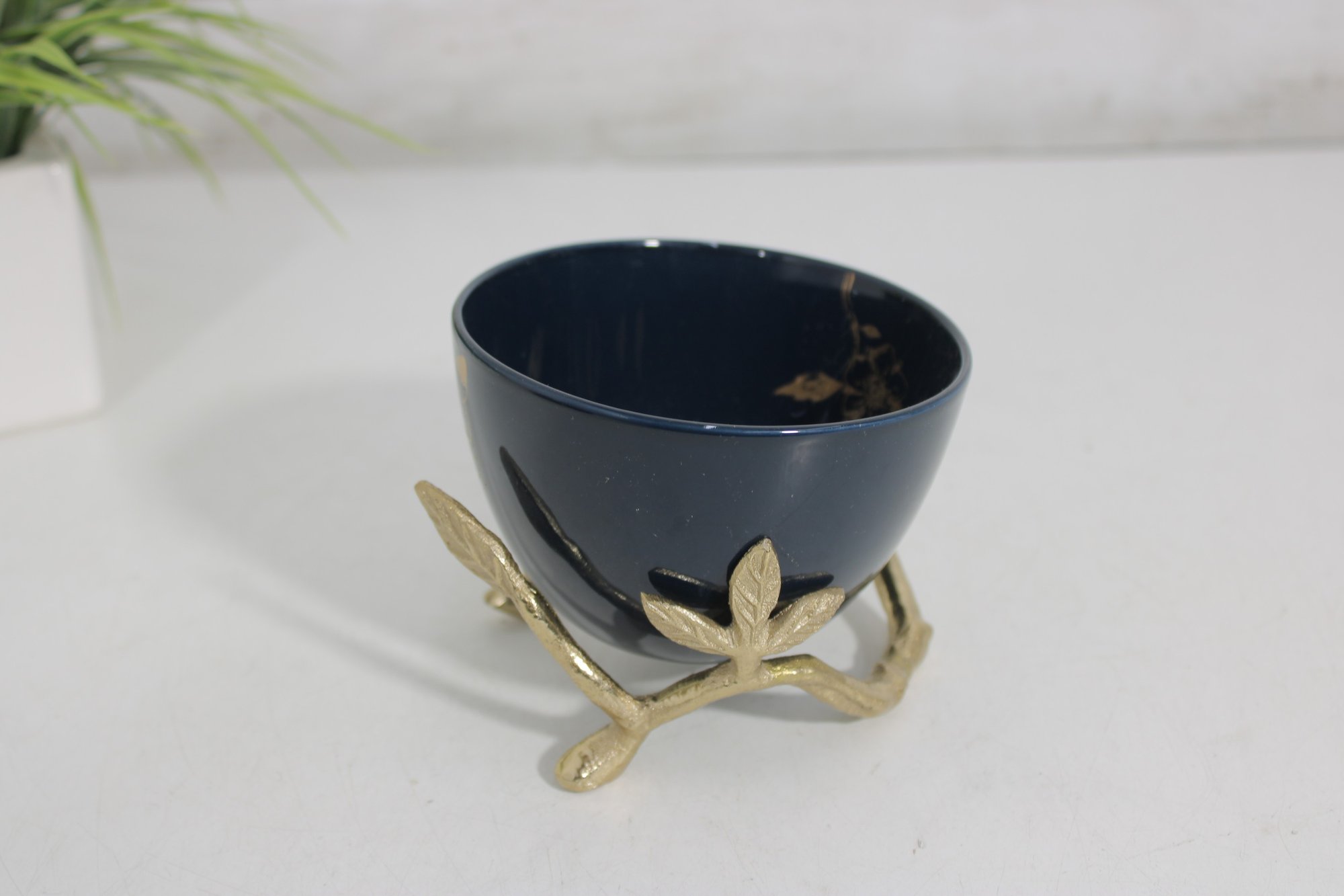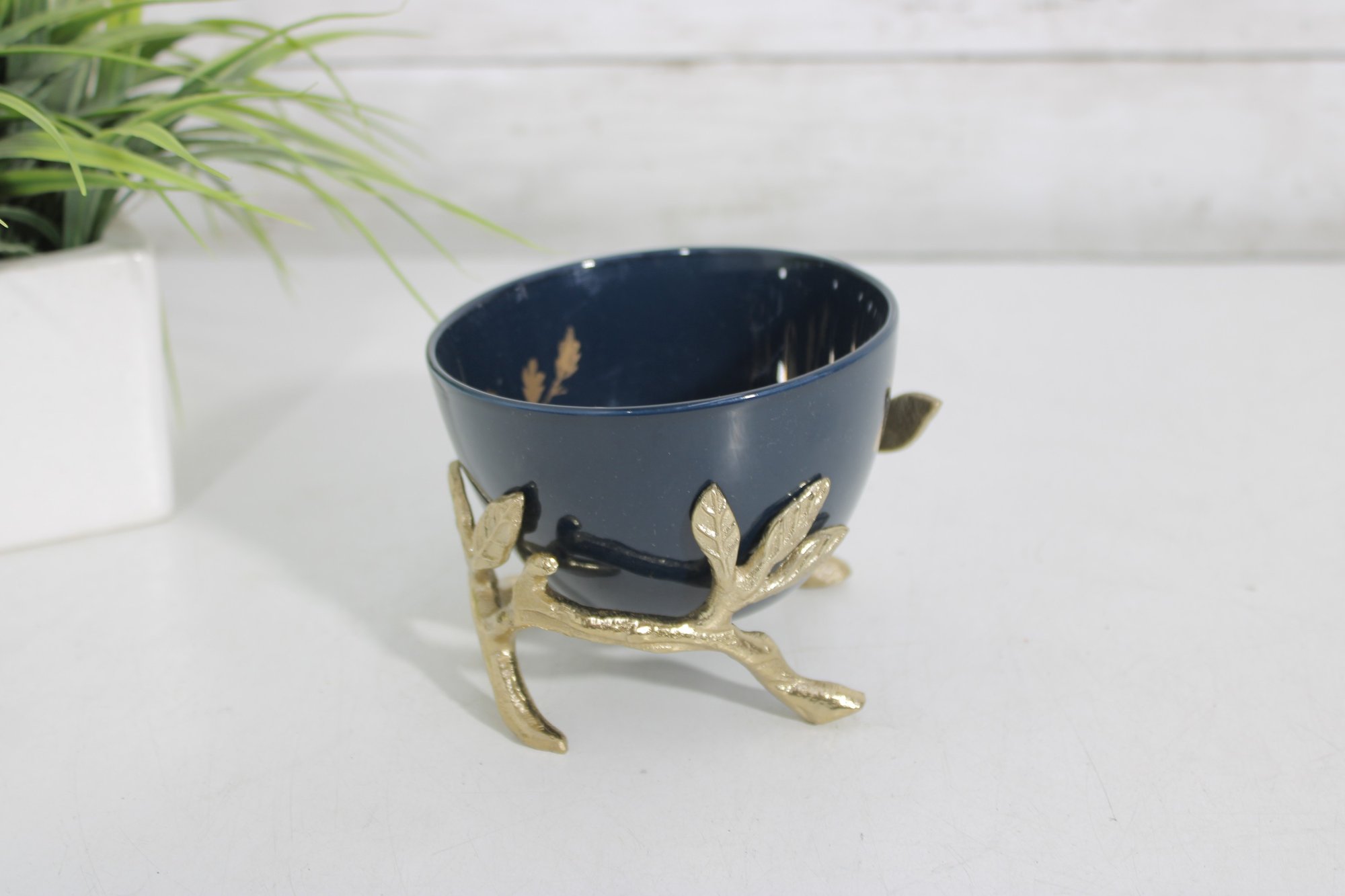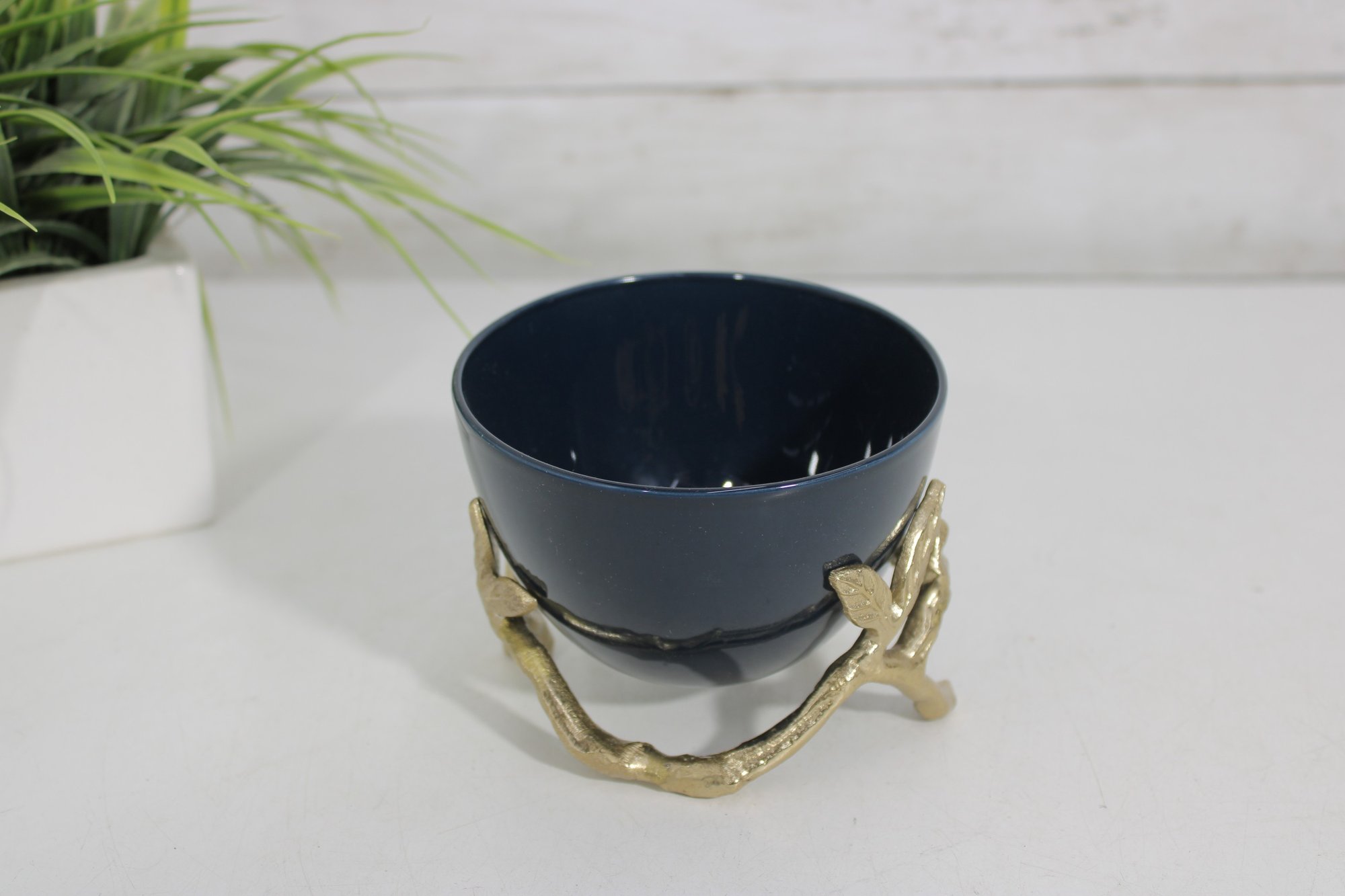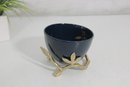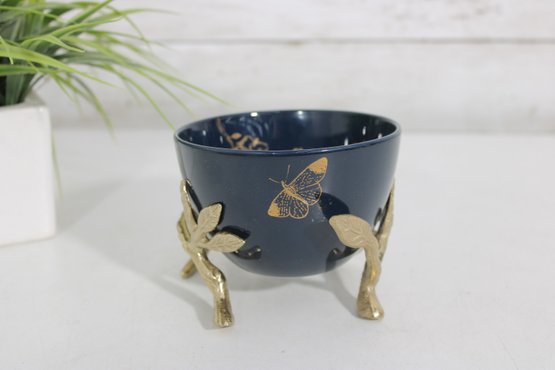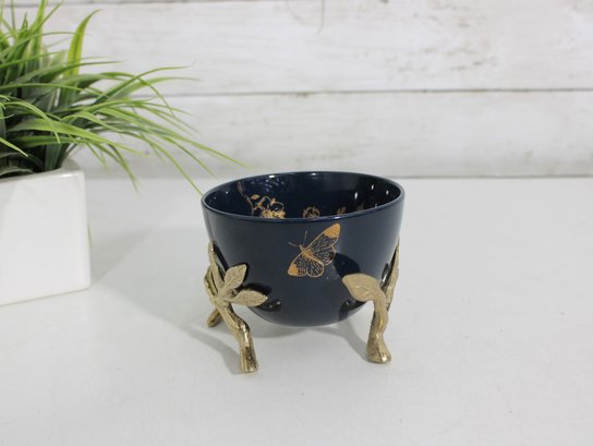 Lenox porcelain bowl featuring a deep navy blue finish adorned with delicate gold butterfly and floral accents. This beautifully crafted piece comes with a decorative gold-tone branch-style stand, adding a nature-inspired touch and elevating its display appeal.
