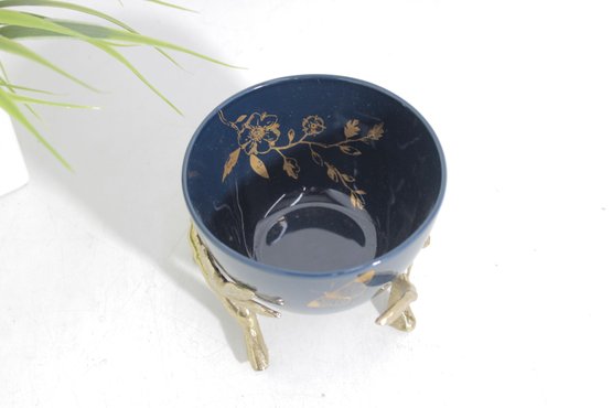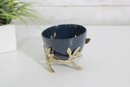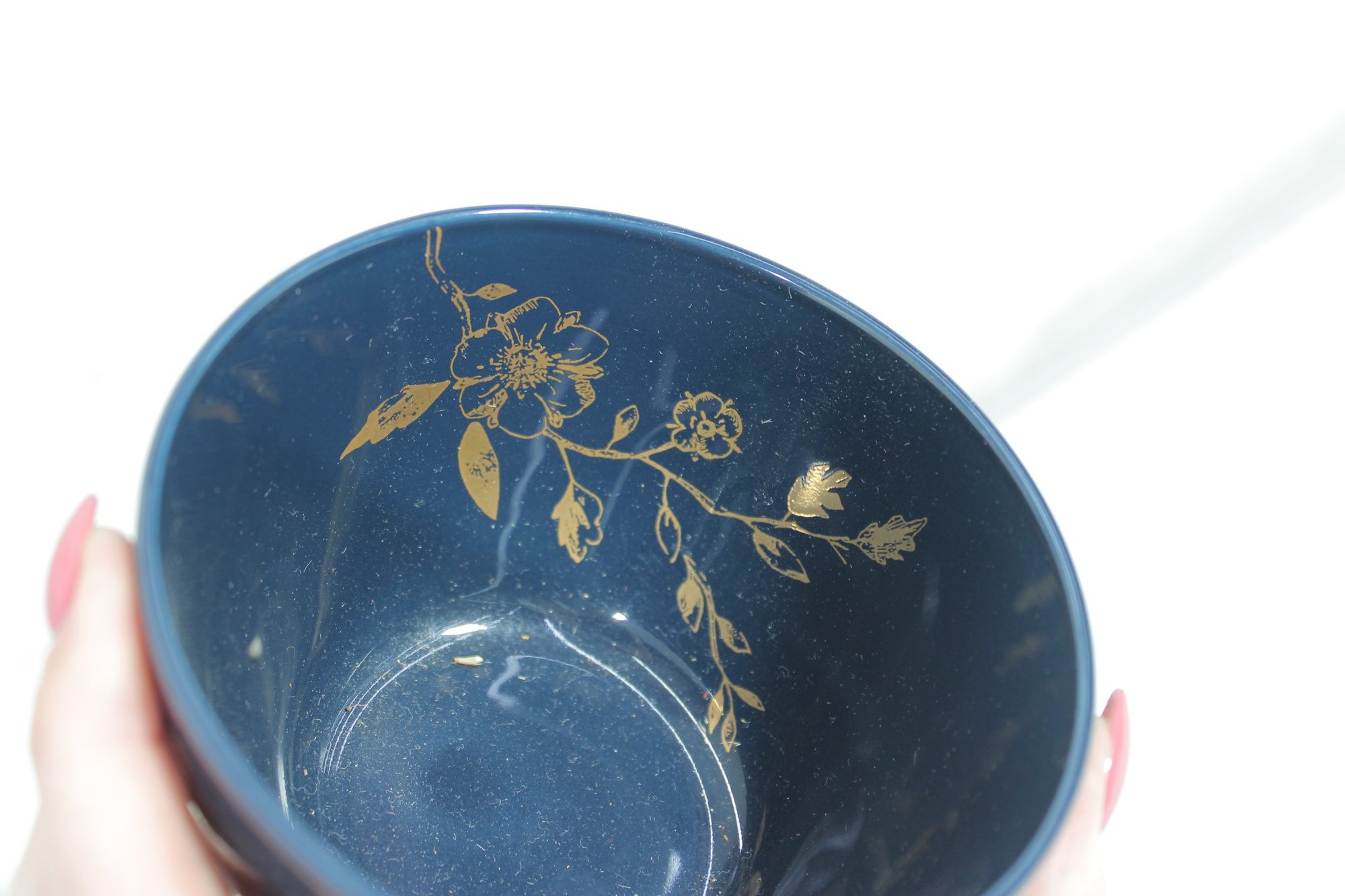 Measuring approximately 3.5 inches high and 4 inches in diameter, this small bowl is perfect as a trinket dish, decorative accent, or collectible display piece. The rich contrast of the dark blue porcelain with the gold detailing gives it a refined and sophisticated look.