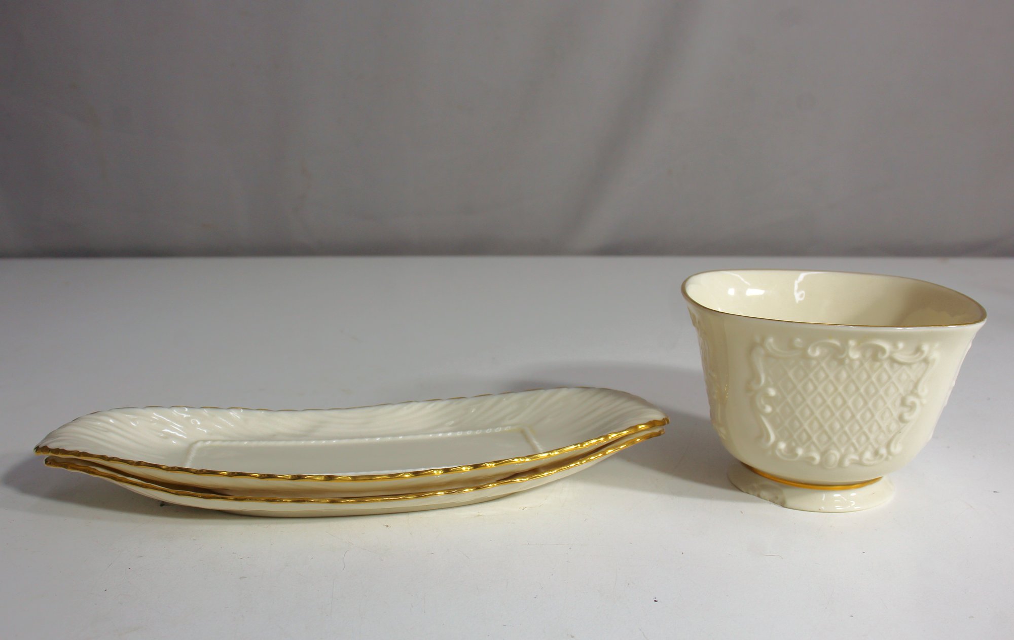 This elegant Lenox set includes a delicate oval tray and a matching pedestal bowl, both crafted in ivory porcelain with gold accents. Known for its high-quality craftsmanship, Lenox pieces are a staple in fine American china.