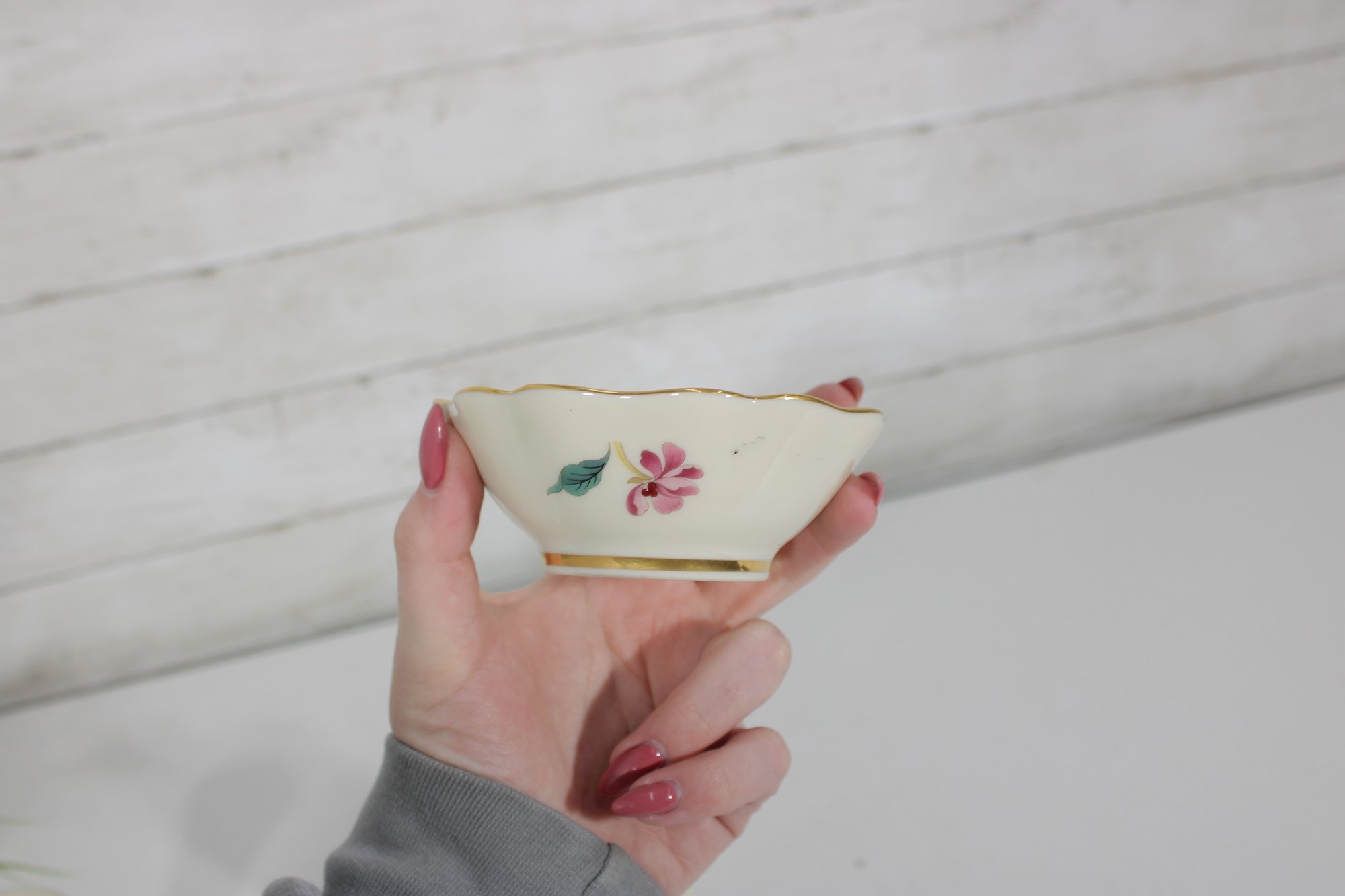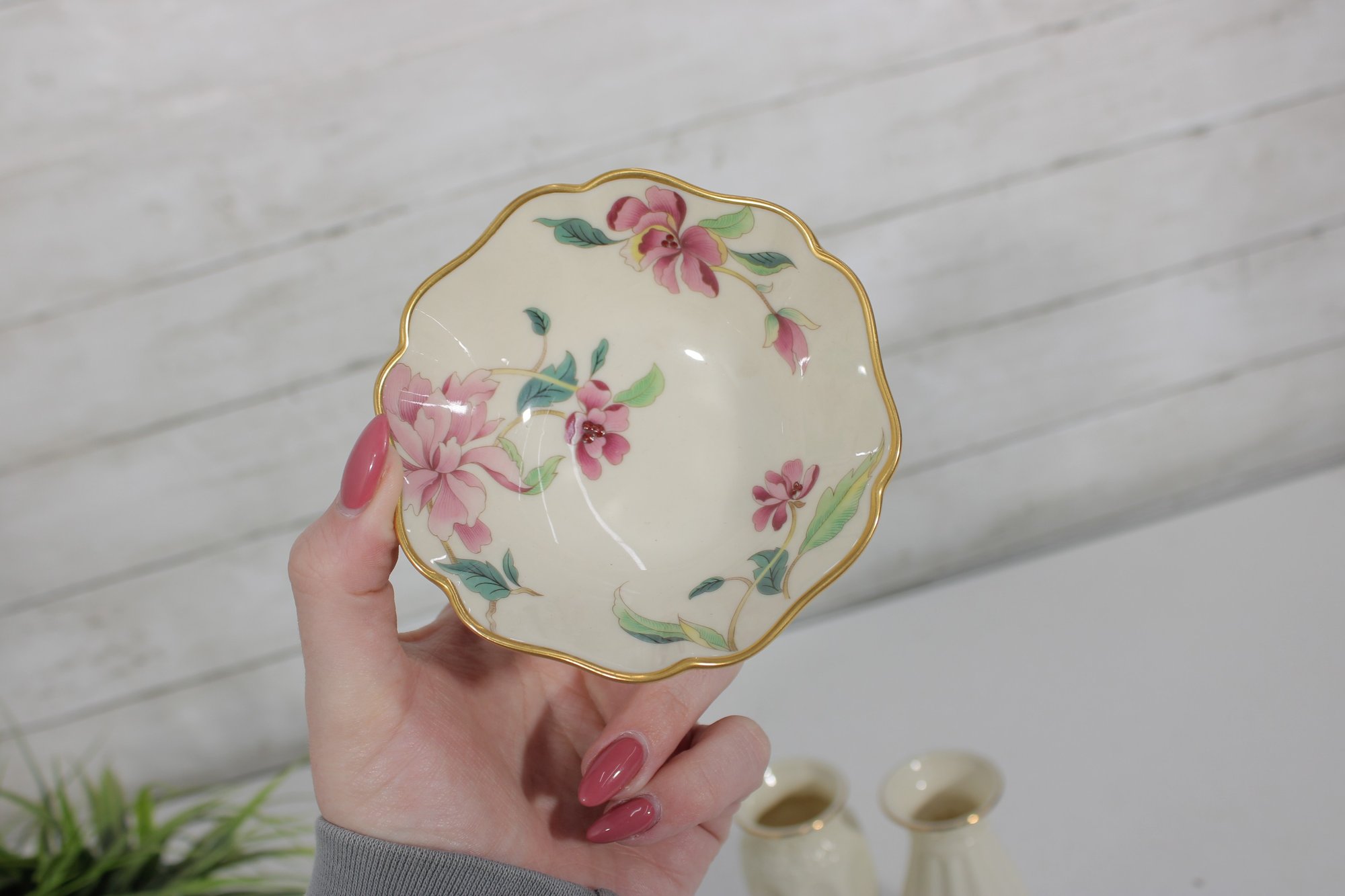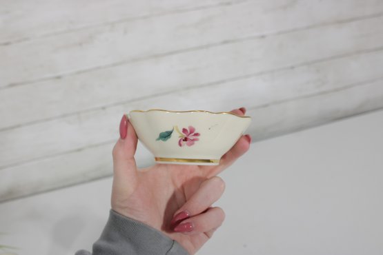 One small Lenox floral trinket dish featuring soft pink blossoms and green leaves with gold trim