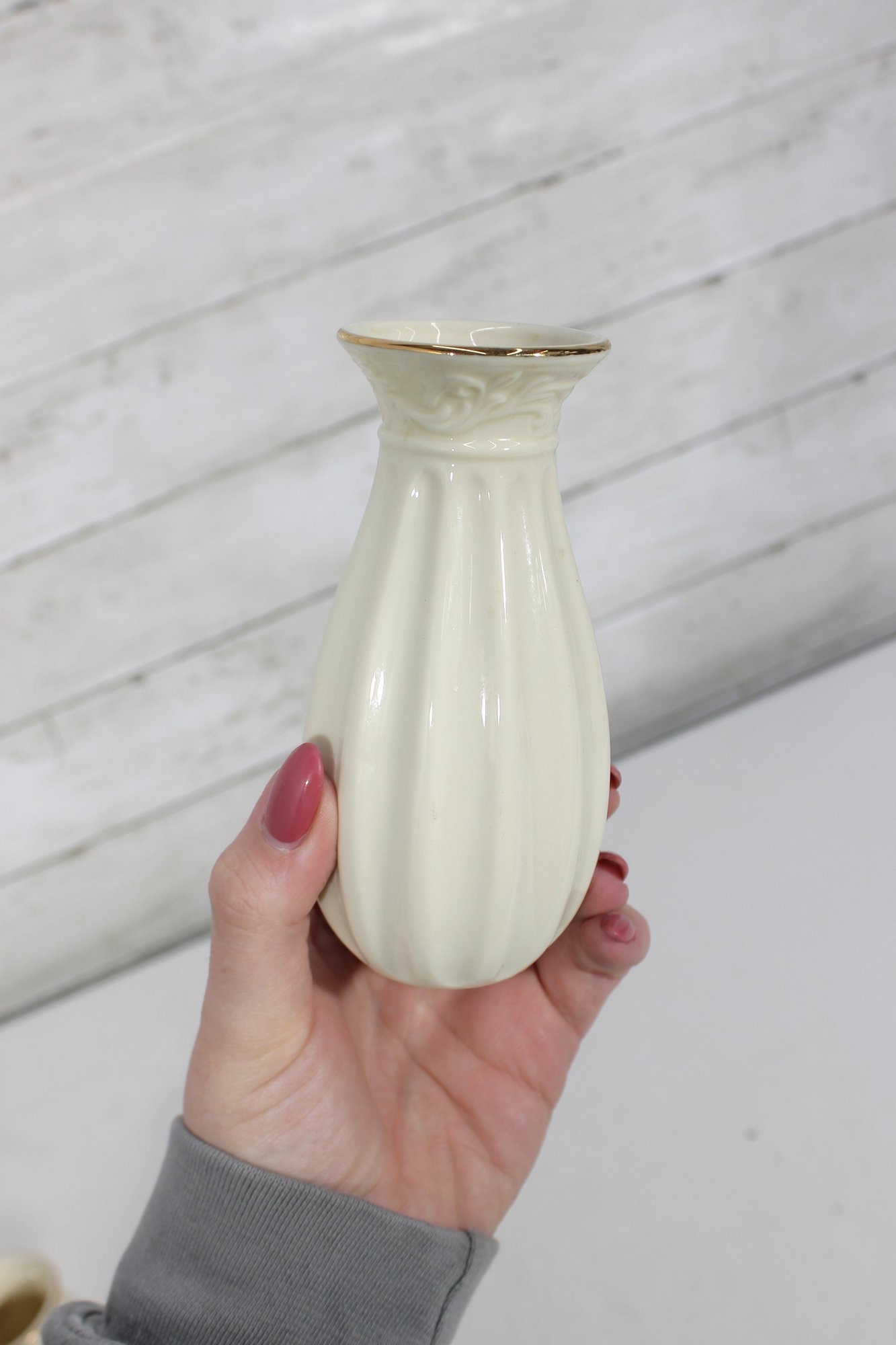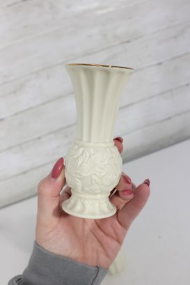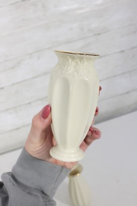 Three Lenox ivory bud vases in varying shapes and sizes, each with graceful fluted or paneled designs