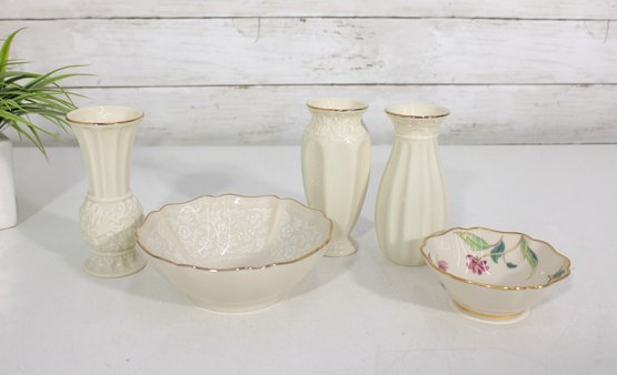 assortment of fine ivory porcelain by Lenox, featuring a coordinated collection of decorative pieces with classic gold trim accents.