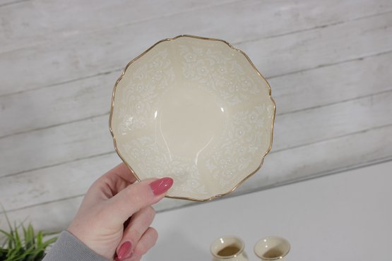 One embossed Lenox bowl with delicate raised patterning and scalloped rim