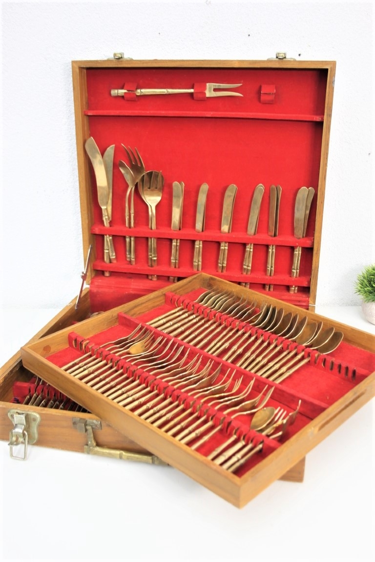 Plentiful Lot Of Stunning Nickel Bronze Cane Bamboo Pattern Flatware - Original Case (incomplete Set)