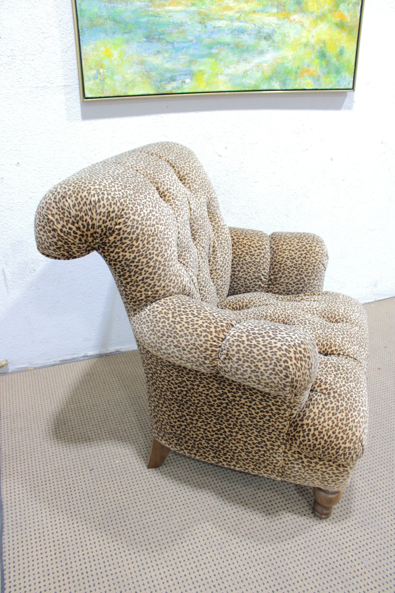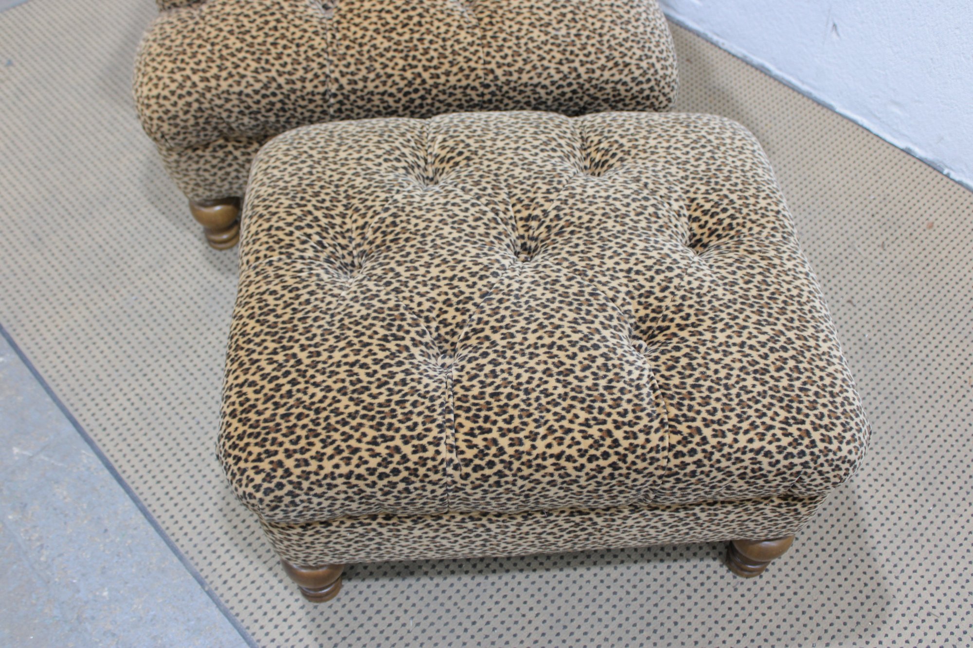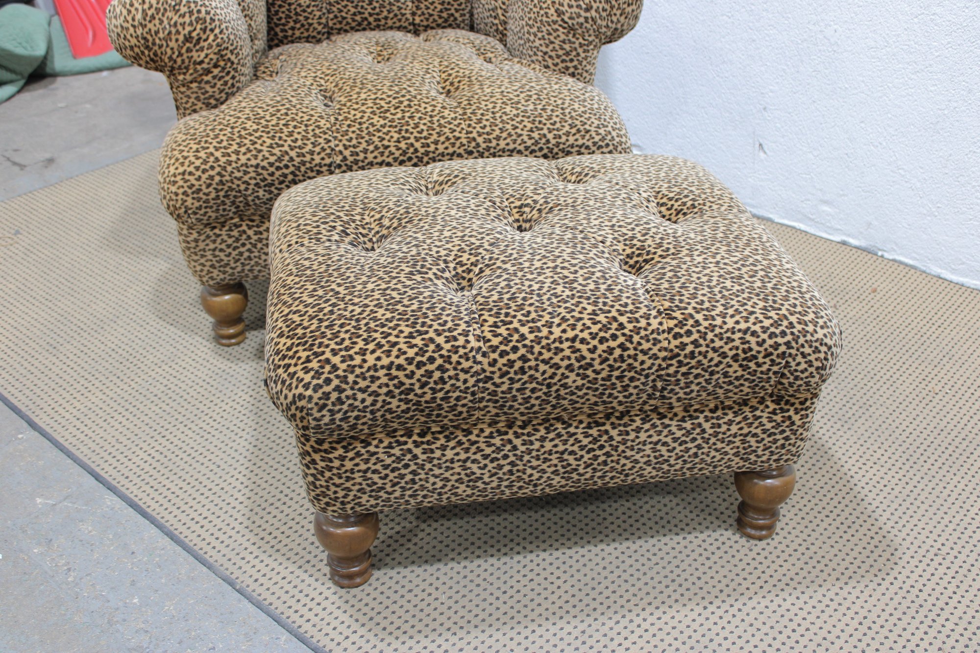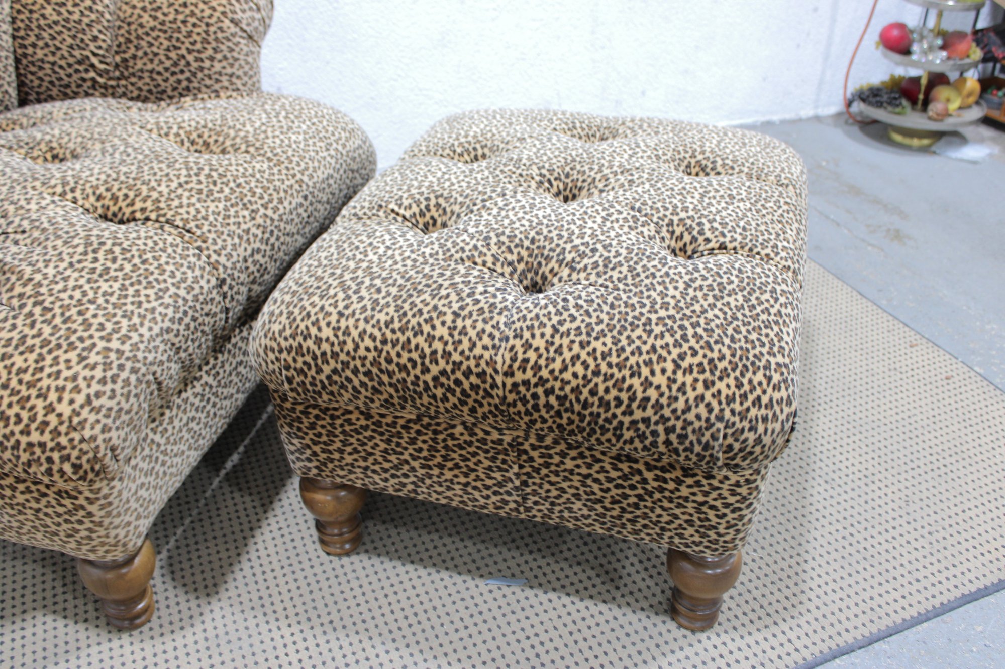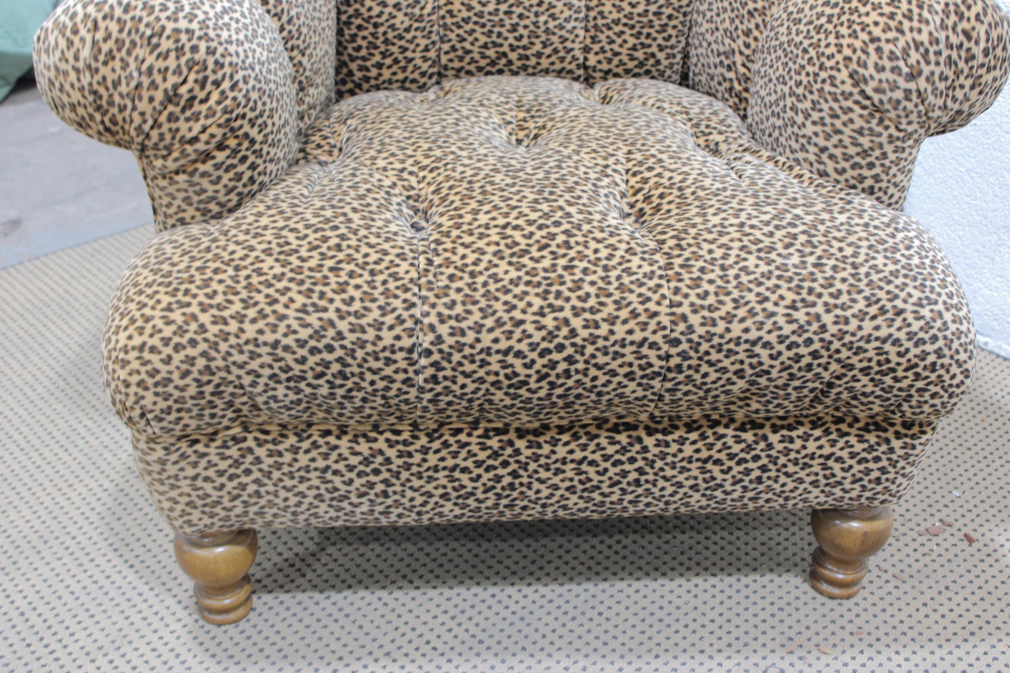 Make a bold style statement with this eye-catching leopard print armchair and matching ottoman set. Upholstered in a soft, patterned fabric with classic button tufting, this duo blends comfort with standout personality. The generously padded chair features rolled arms, a high back, and deep seating—perfect for relaxing with a book or adding a dramatic accent to any room.