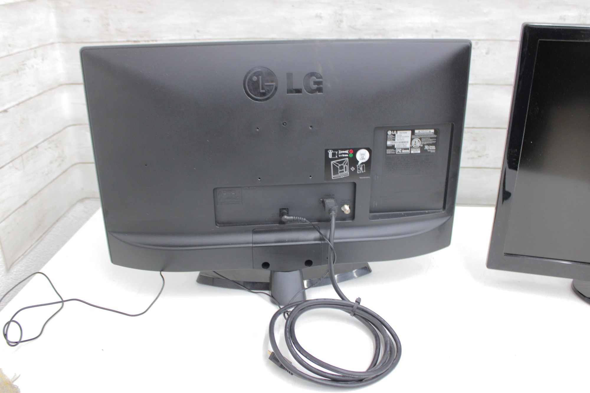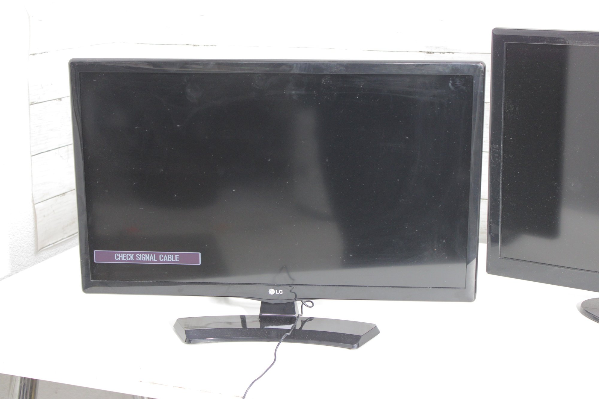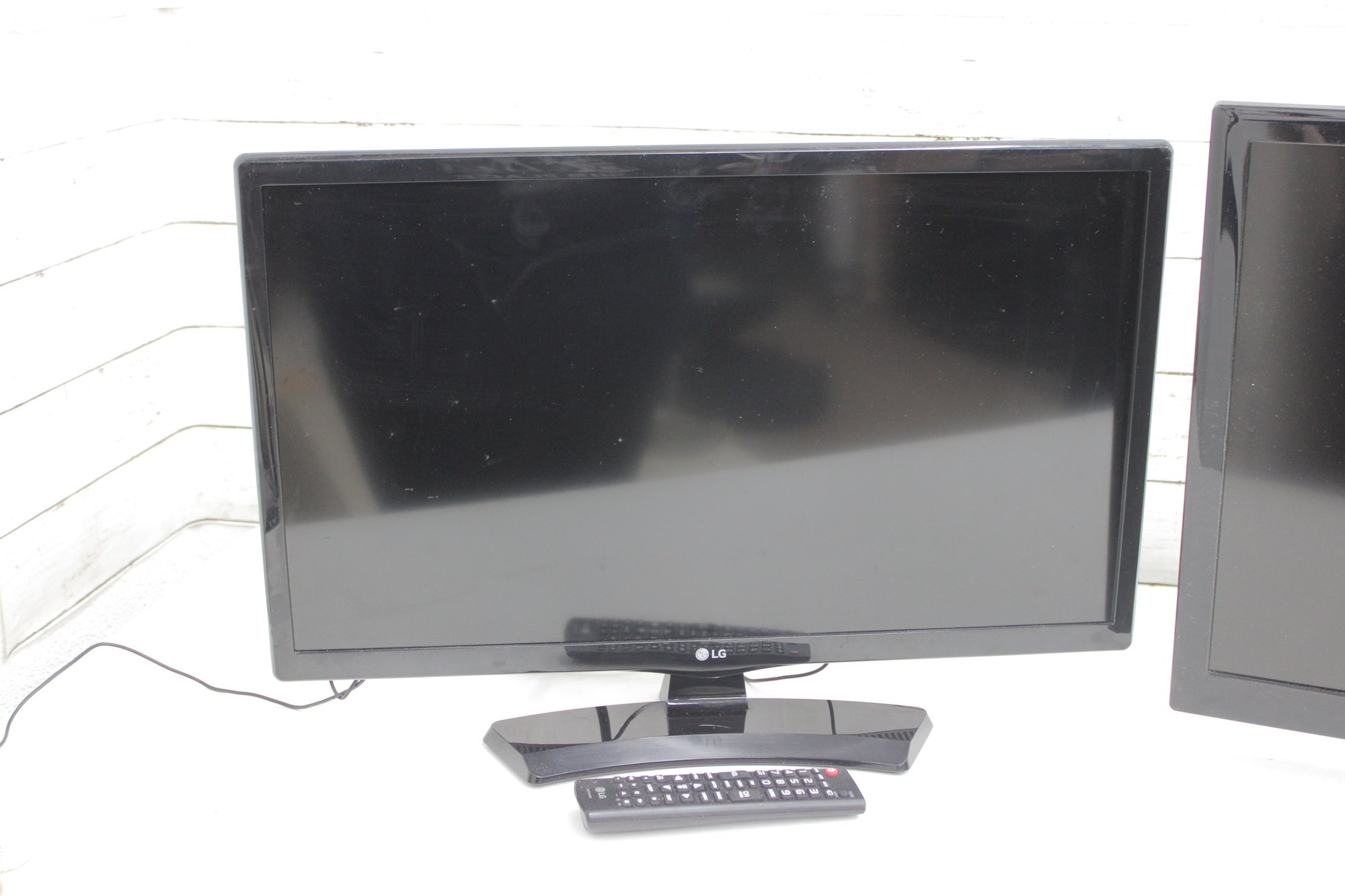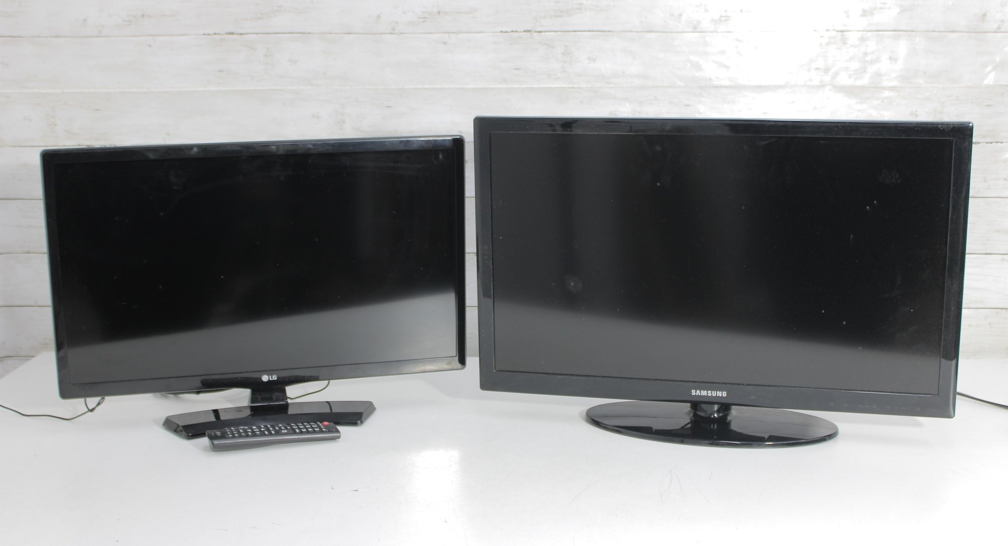 Mixed lot featuring LG and Samsung flat screen LCD televisions, ideal for home, office, gaming setups, or resale. This bundle includes two sleek black flat screens with modern styling, along with an LG remote control as shown. Perfect for use as secondary TVs, computer monitors, or workshop displays.