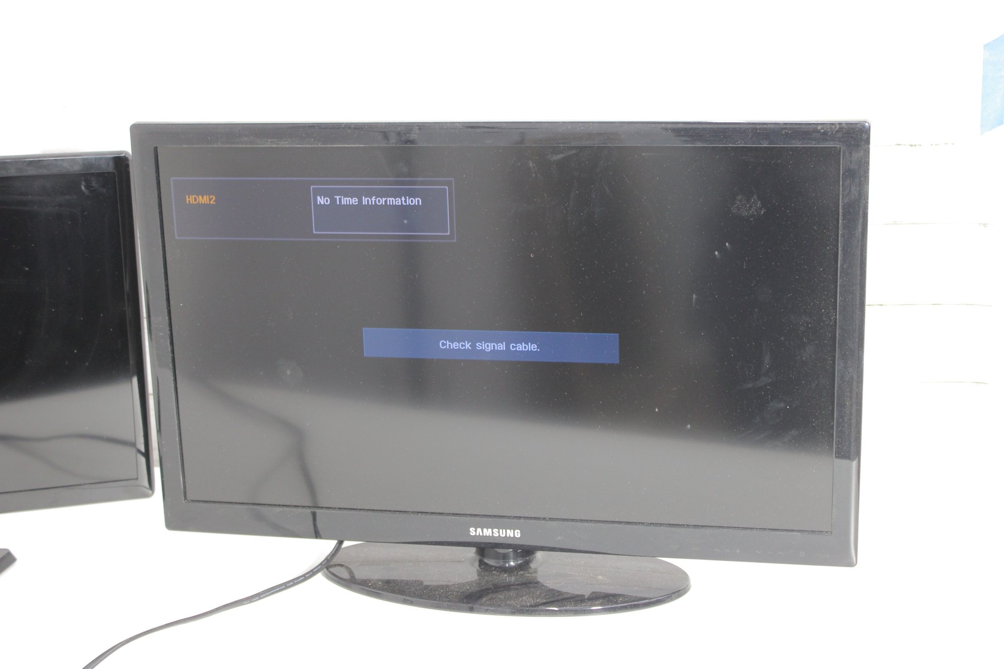 Both screens power on, with one showing a “No Signal” message indicating it is ready for connection to your preferred device. Clean, simple designs make them easy to integrate into any space.