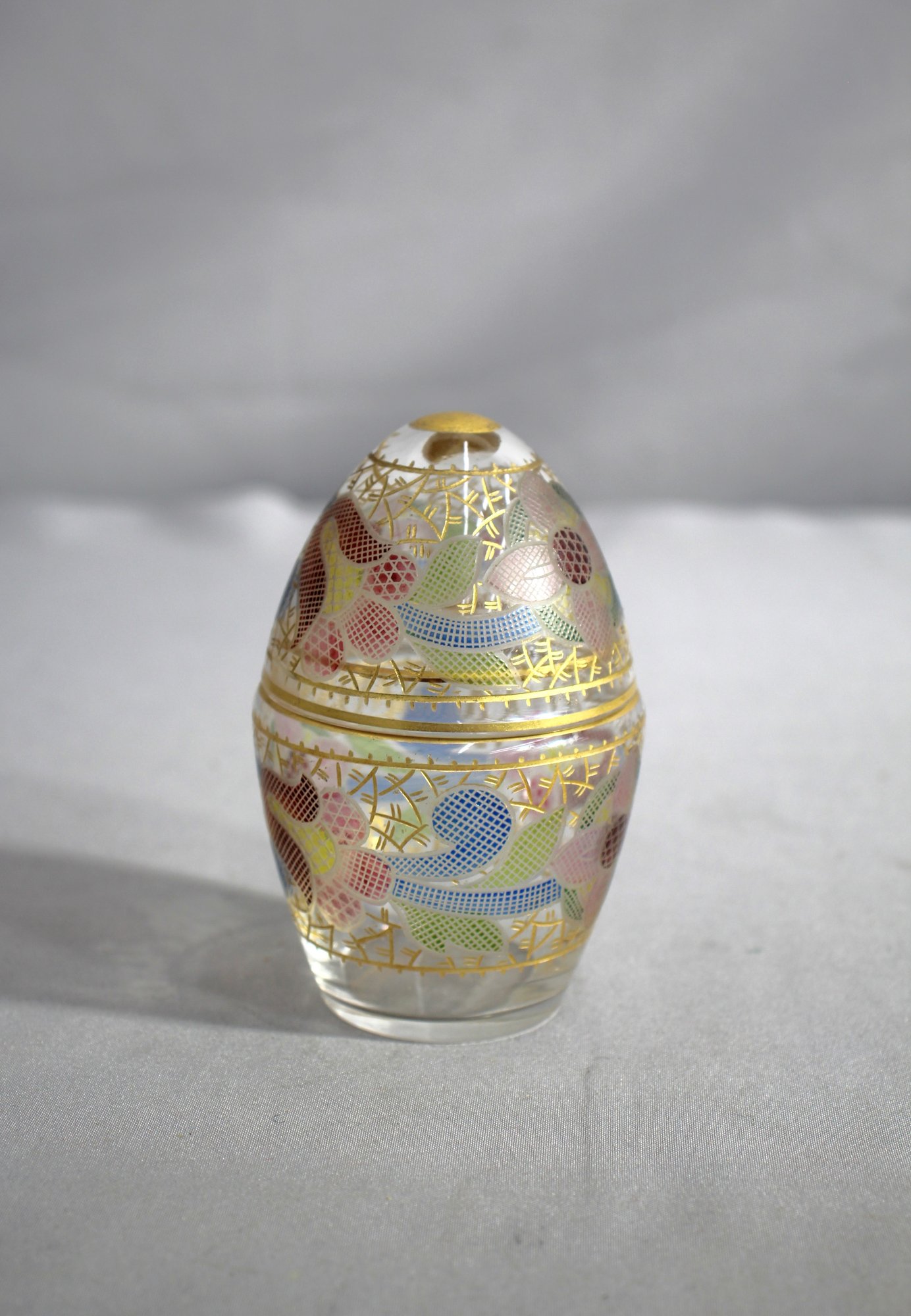 shaped like a traditional egg and adorned with intricate patterns and vibrant colors under a gilded lattice. The egg, a symbol of new beginnings and purity, has been transformed into a piece of art, with each panel featuring a kaleidoscope of colors reminiscent of stained glass. The ornamental box is perfect for safeguarding your most precious keepsakes, from jewels to heirloom trinkets.