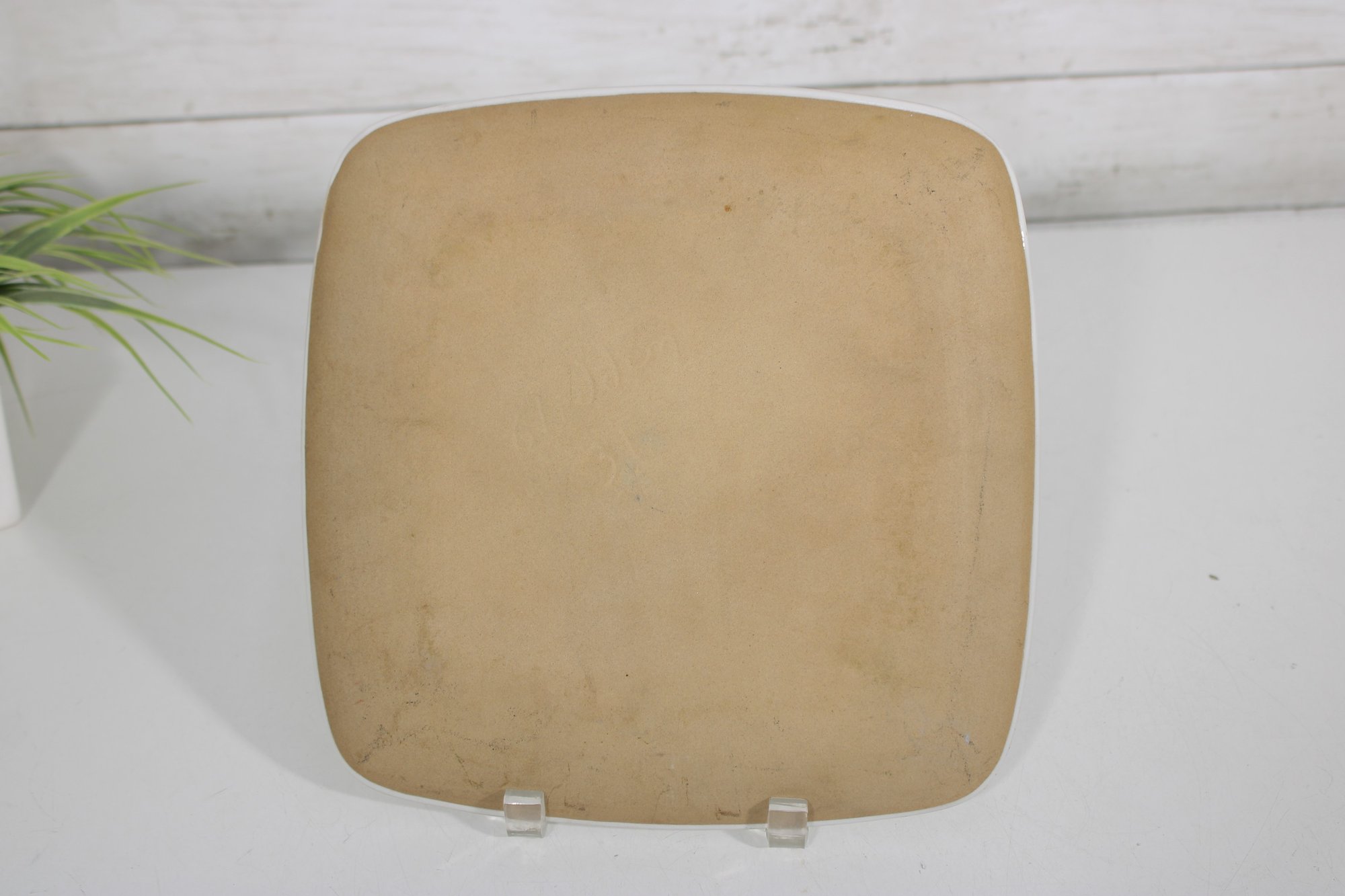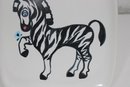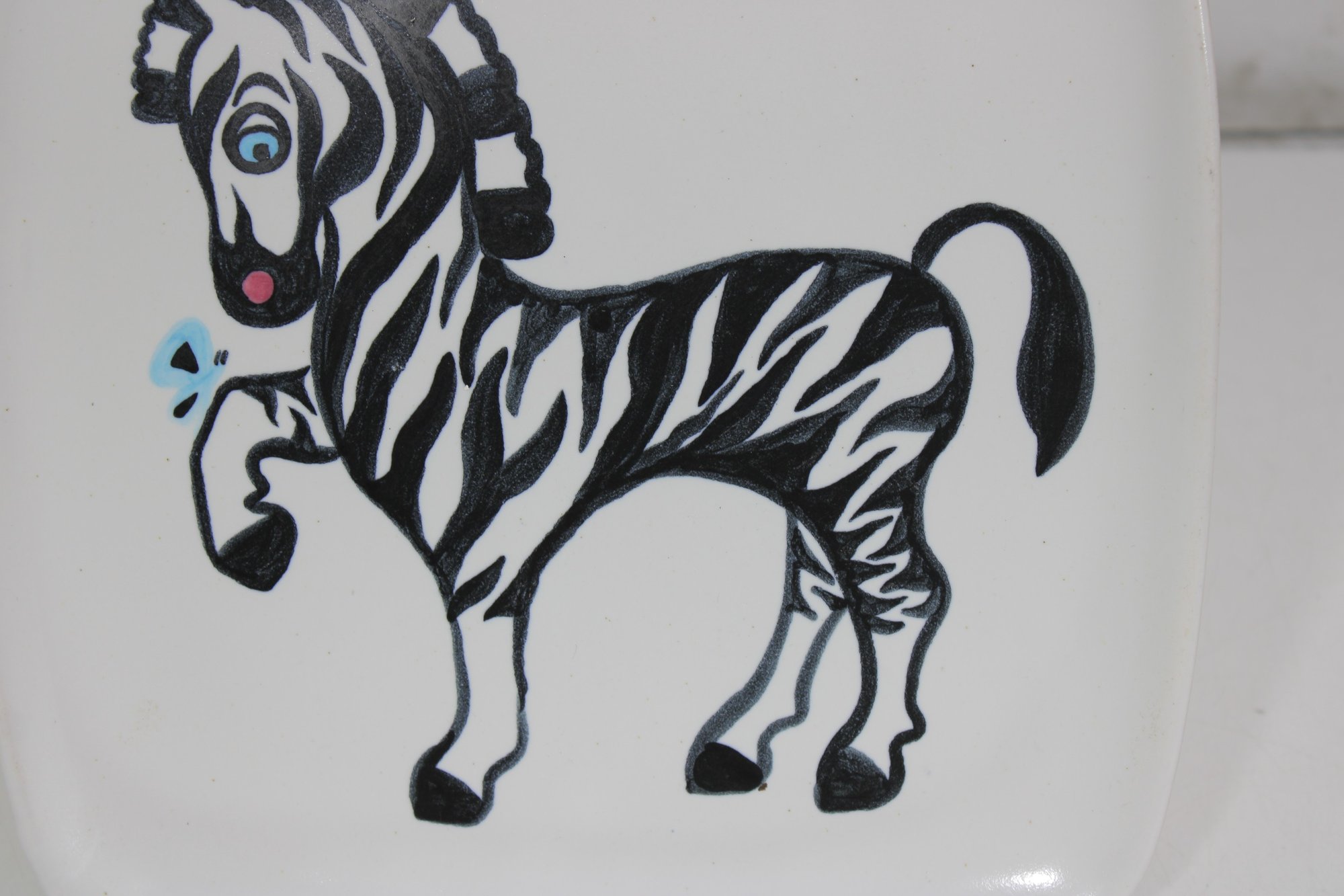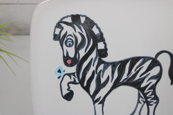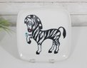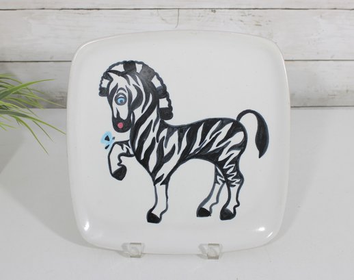 mid-century charm to your collection with this eye-catching Glidden Art Pottery canapé/appetizer plate featuring a whimsical zebra design. The square plate measures approximately 10" x 10" and showcases a playful, stylized zebra in black and white with hand-painted details, accented by subtle pops of color.