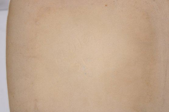 Produced by Glidden Pottery, a California-based studio known for its distinctive mid-century modern designs, this piece reflects the era’s love of artistic expression and functional décor. The smooth glazed front contrasts nicely with the unglazed underside, typical of studio pottery.