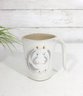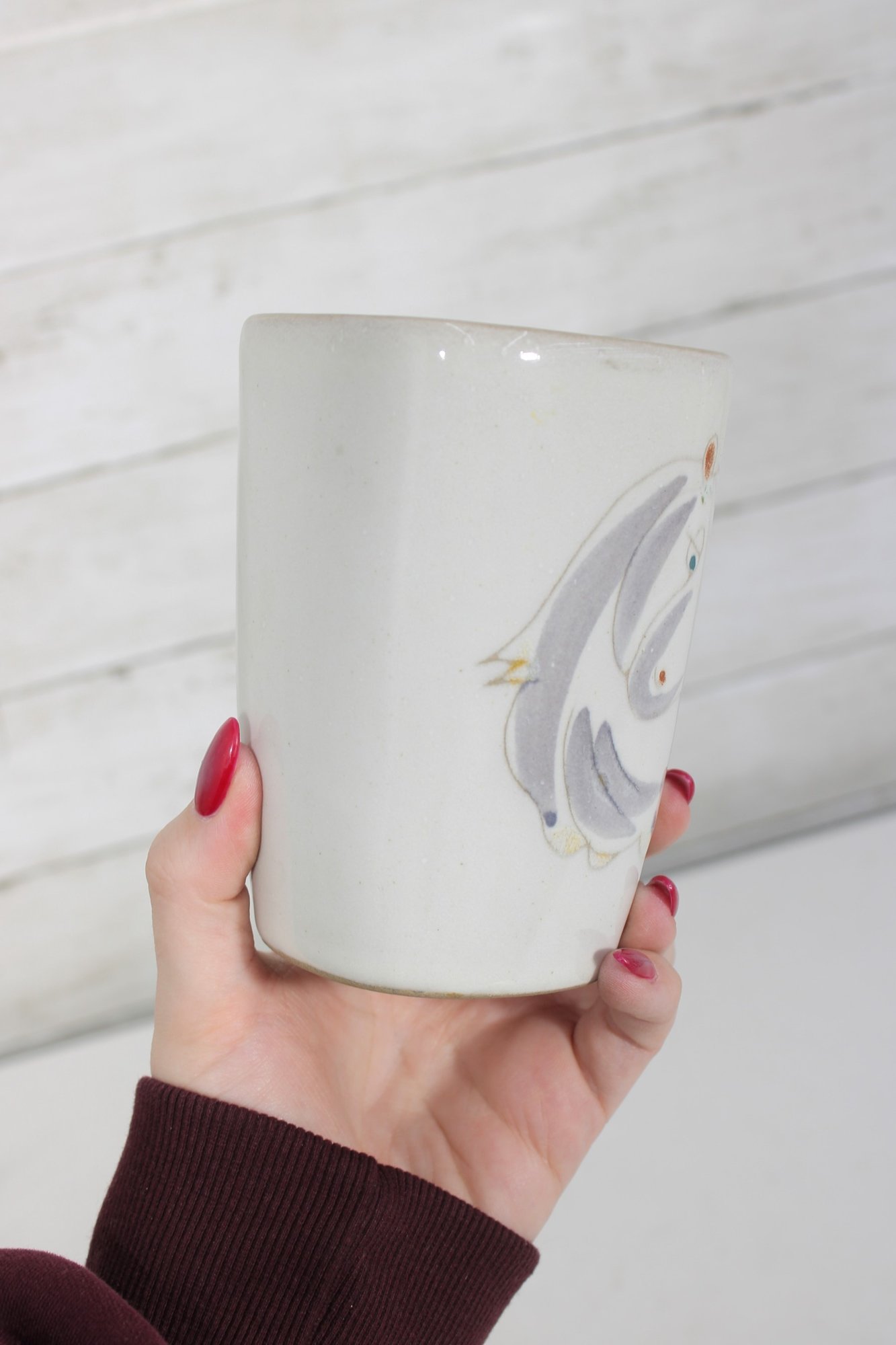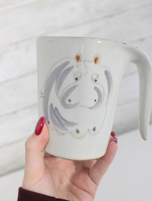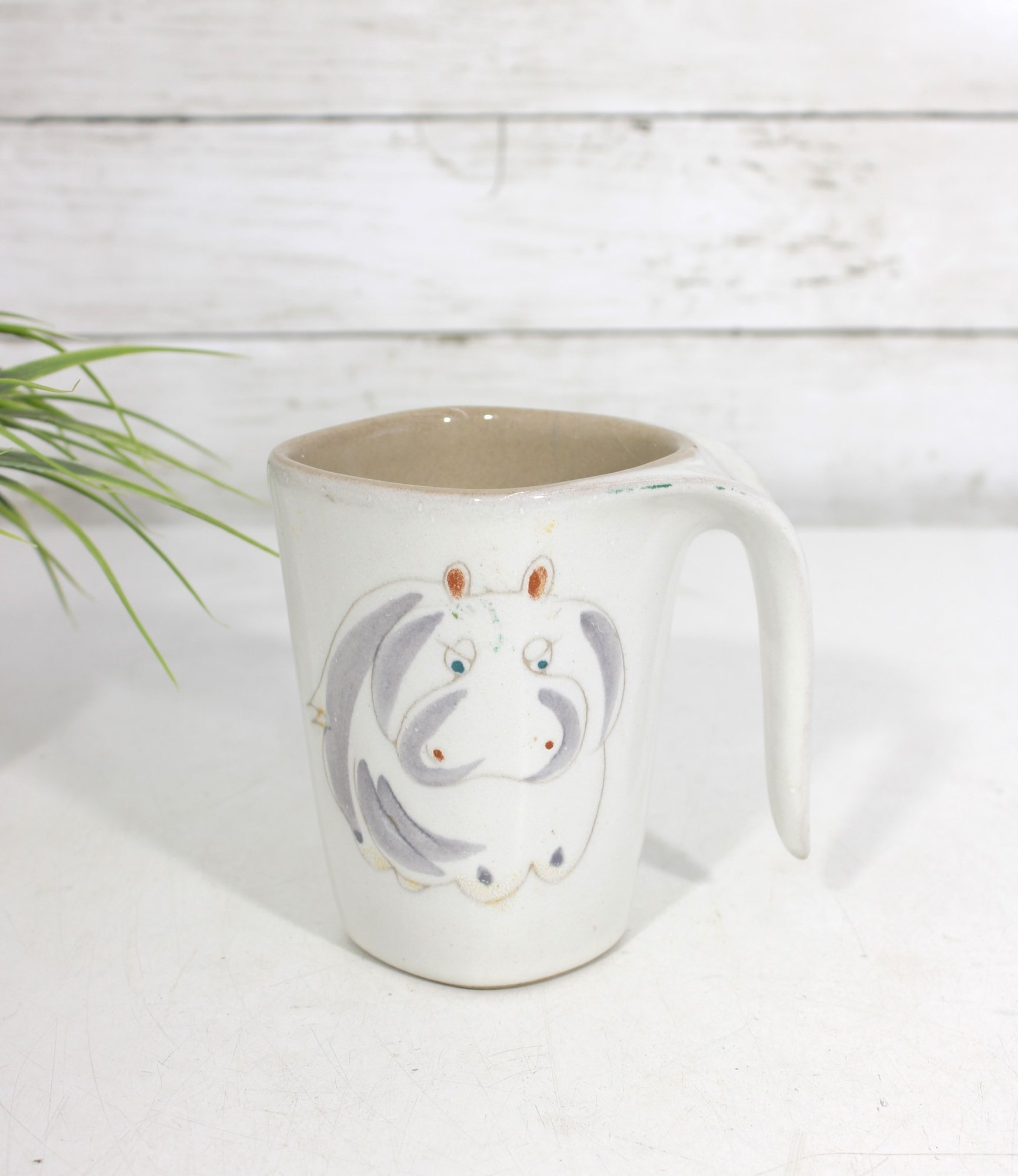 vintage Glidden Pottery mug featuring a whimsical hand-decorated hippopotamus design. Rendered in soft gray tones with subtle accent colors, the stylized hippo motif wraps the exterior, giving this piece a playful yet distinctly mid-century modern aesthetic.