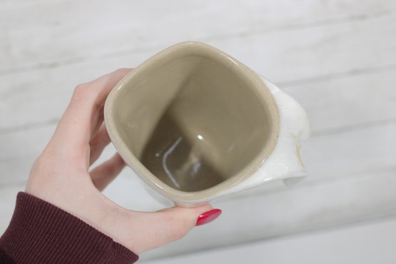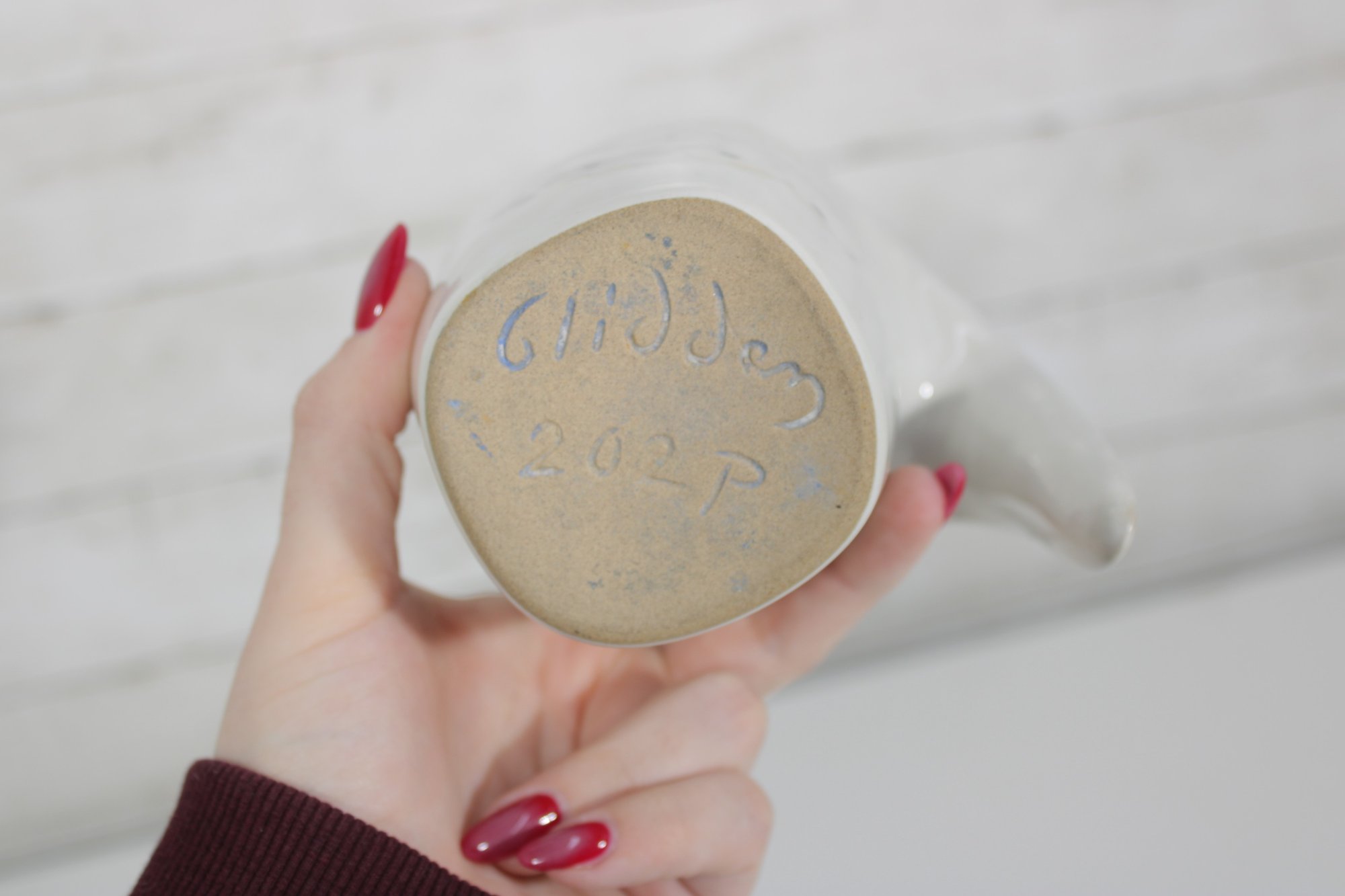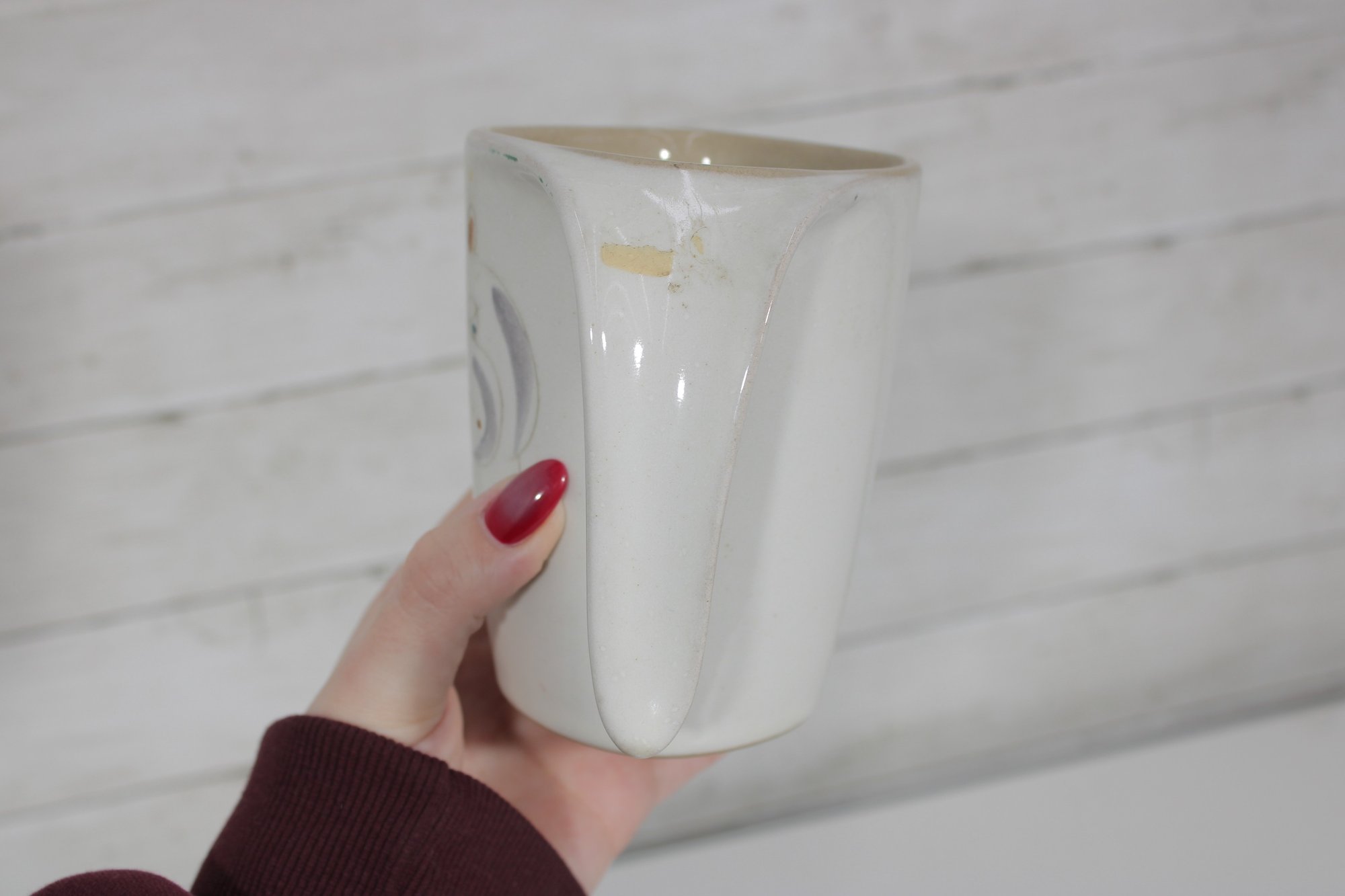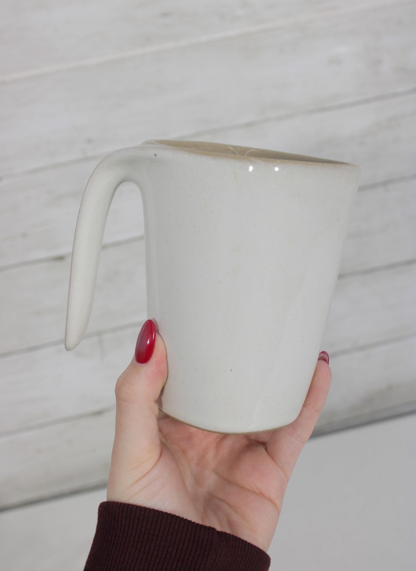 The mug has a unique squared form with a comfortable, sculptural handle and a warm neutral glaze interior. A great example of Glidden’s artistic pottery, blending function with personality.
