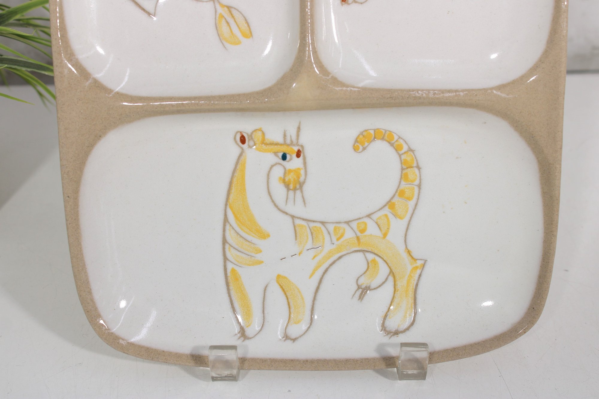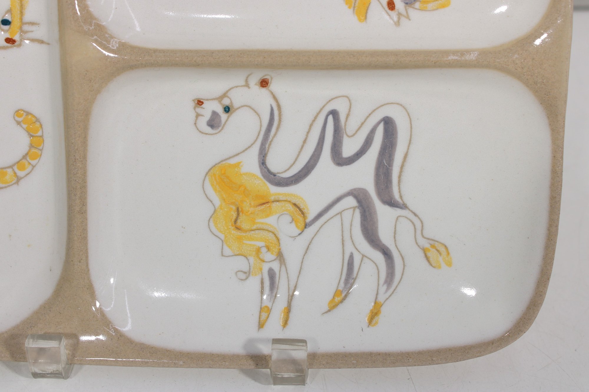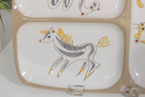 a charming mid-century modern divided serving platter by Glidden Pottery, featuring playful whimsical animal illustrations in a soft palette of yellow, gray, and gold accents. This eye-catching piece is divided into four sections, each showcasing a stylized creature with a fun, abstract design typical of MCM artistry.
