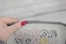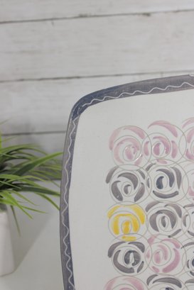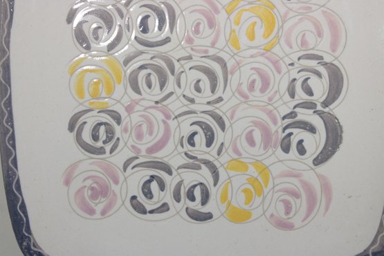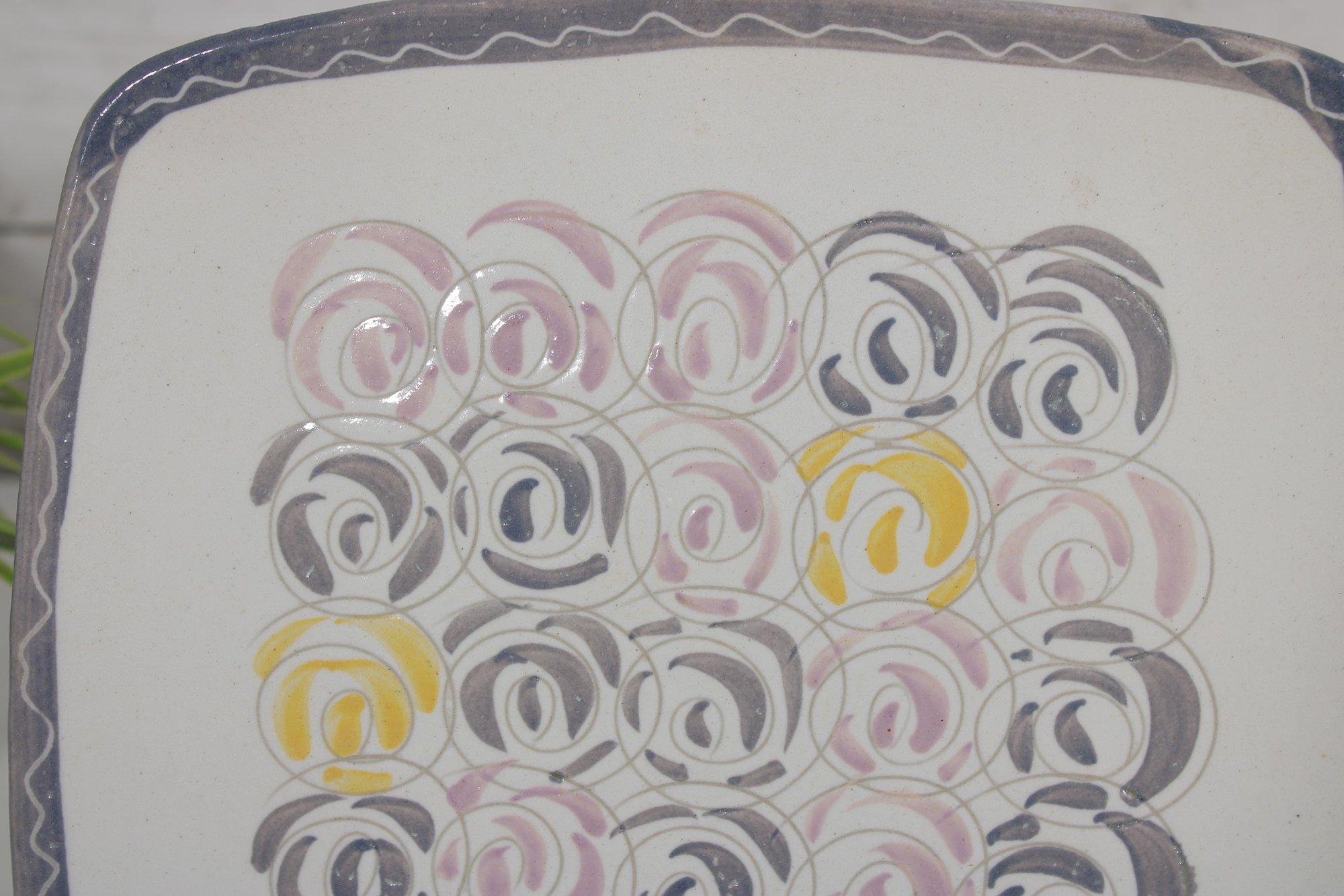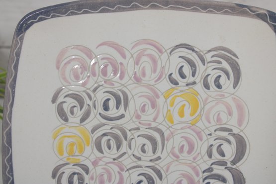 mid-century modern ceramic plate by Glidden Pottery, featuring a bold abstract pattern in soft tones of gray, pink, and yellow. The design consists of repeating circular brushstroke motifs, framed by a contrasting border that enhances its graphic appeal.