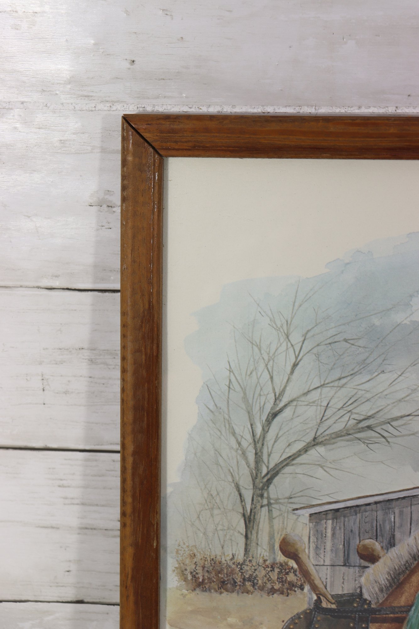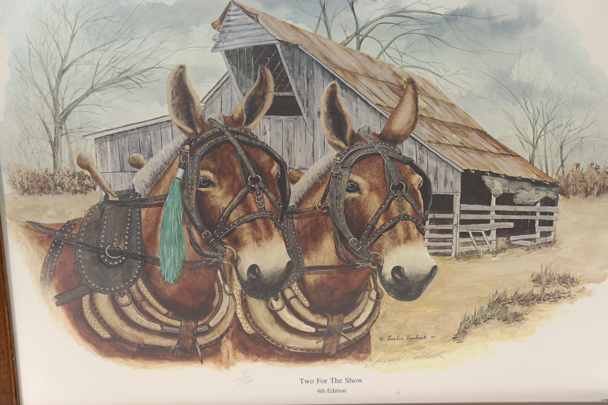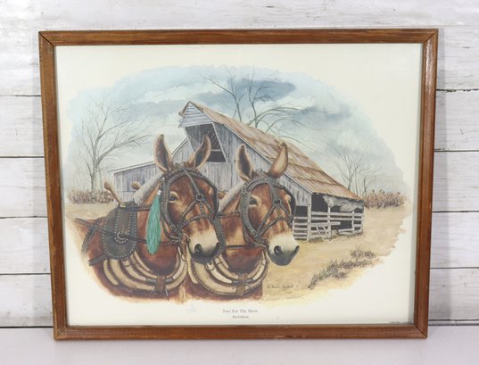 limited edition print from Leslie’s Art, depicting a pair of draft horses harnessed in front of a weathered barn in a peaceful rural landscape. The artwork captures a nostalgic slice of farm life, with warm earth tones, careful detail, and a timeless Americana feel.