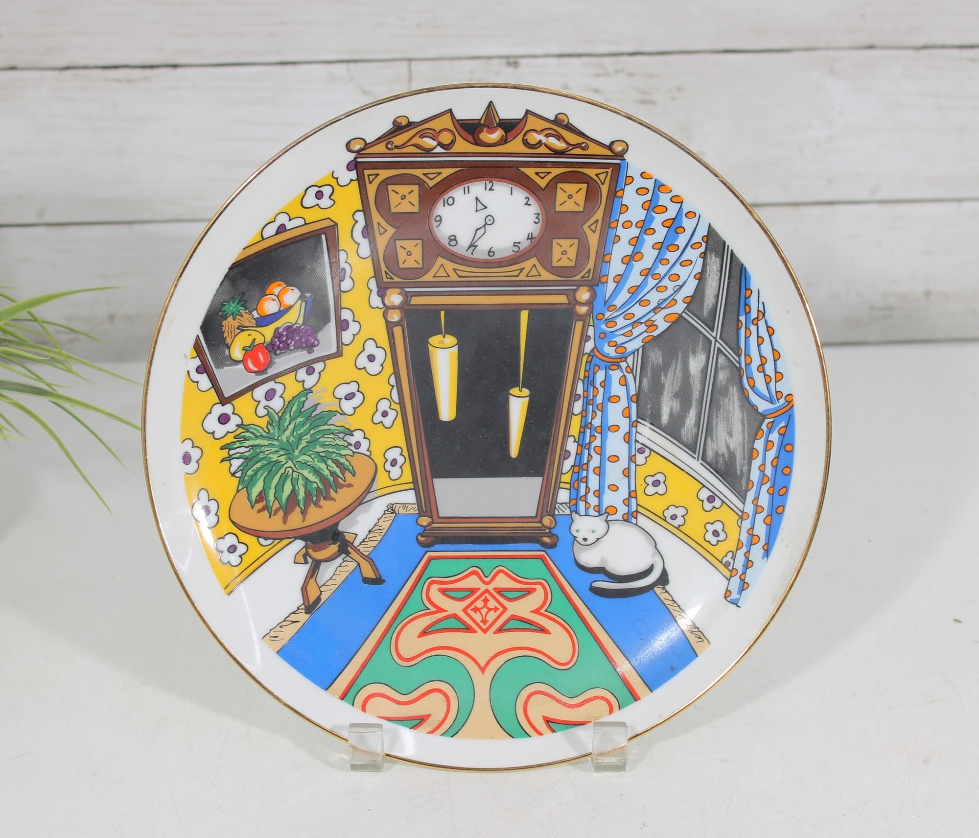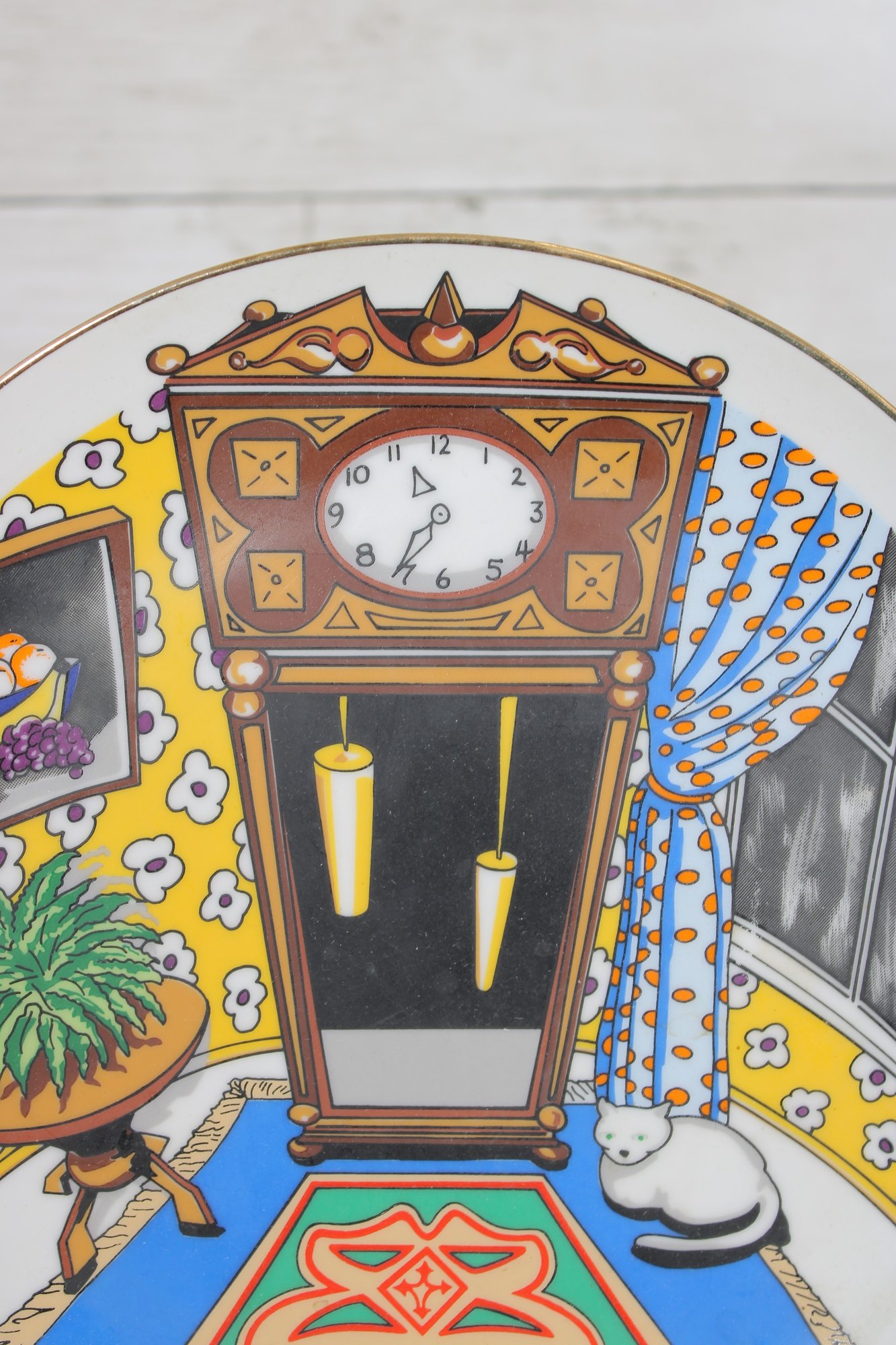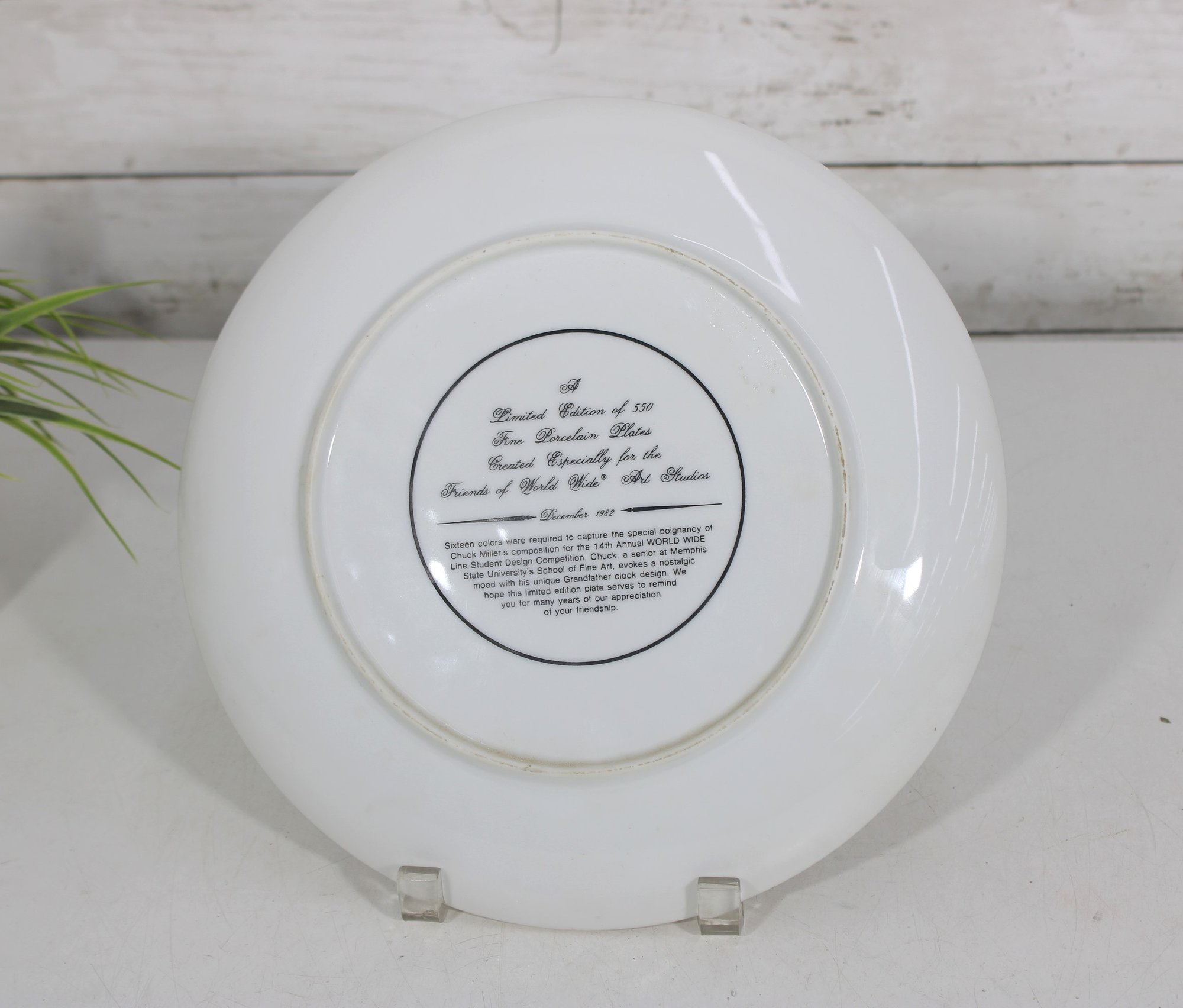 a charming limited edition collector plate featuring “Grandfather’s Clock” by Norman Rockwell. This colorful scene depicts a cozy interior with a tall grandfather clock, patterned wallpaper, a window with curtains, and quaint decorative elements—capturing Rockwell’s nostalgic storytelling style.