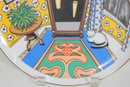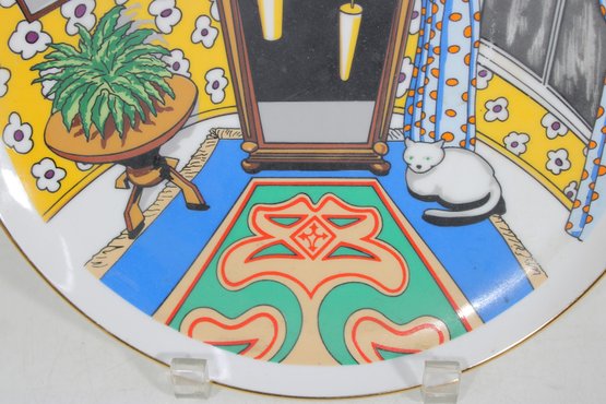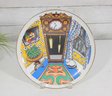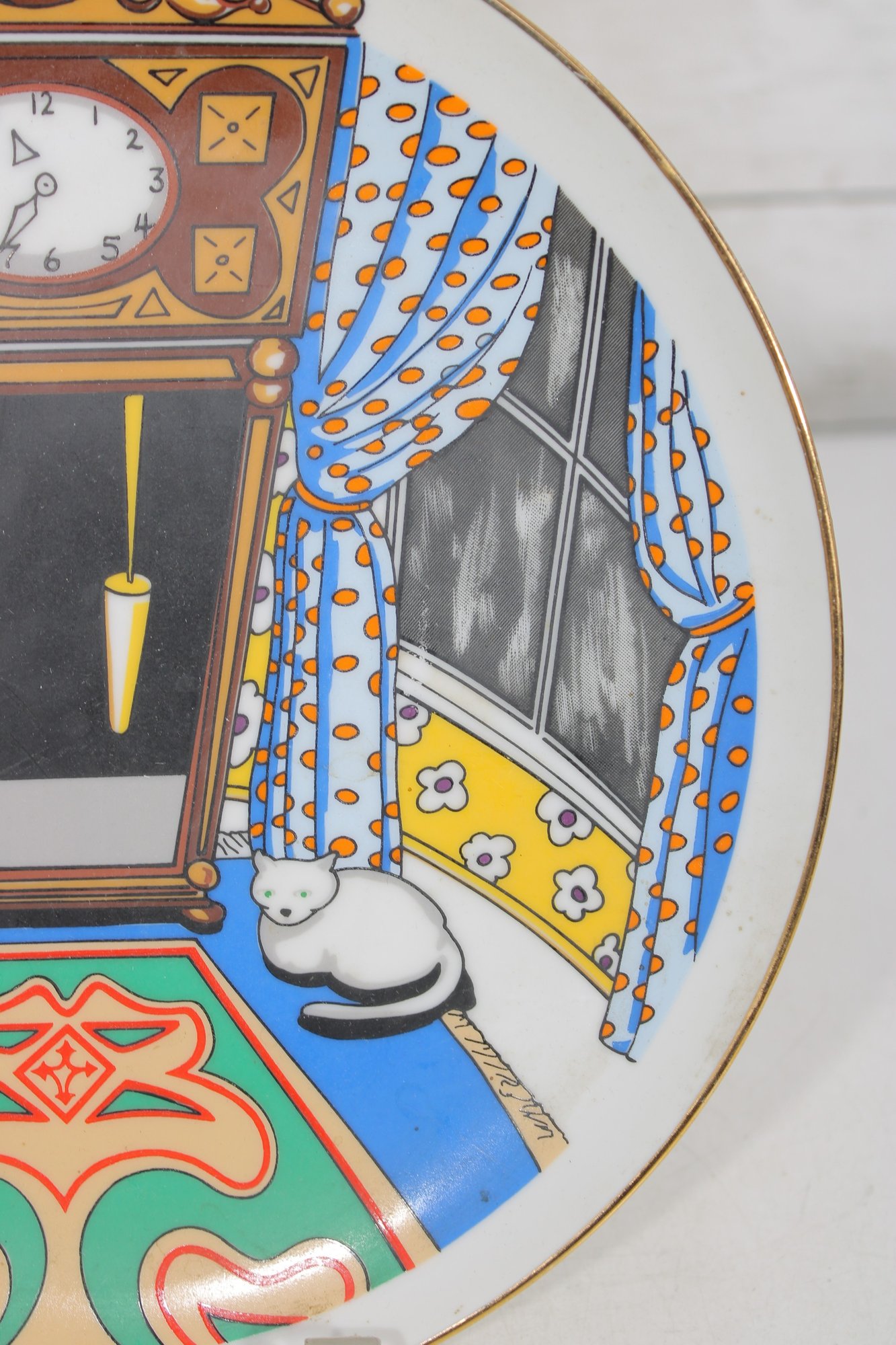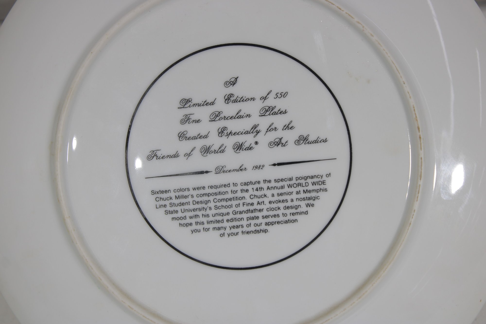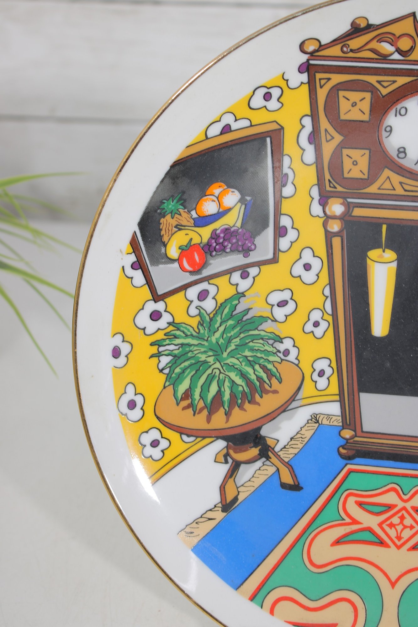 a charming limited edition collector plate featuring “Grandfather’s Clock” by Norman Rockwell. This colorful scene depicts a cozy interior with a tall grandfather clock, patterned wallpaper, a window with curtains, and quaint decorative elements—capturing Rockwell’s nostalgic storytelling style.