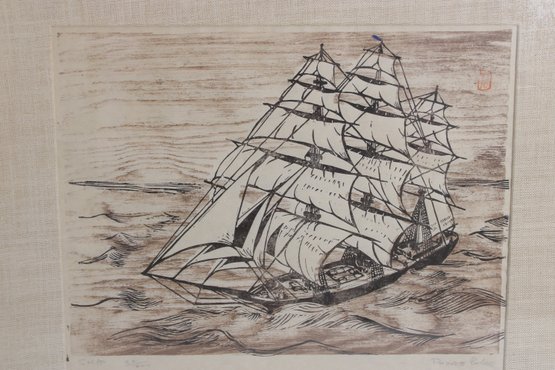a beautifully detailed limited edition nautical print featuring a classic sailing ship navigating open waters. The artwork is rendered in elegant monochrome tones with fine linework, capturing the movement of the sea and the intricate rigging of the vessel.
