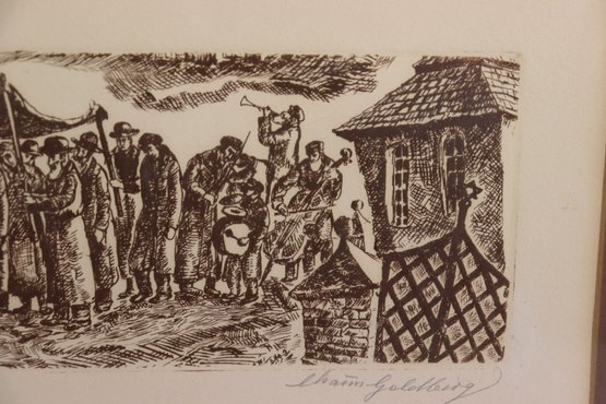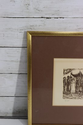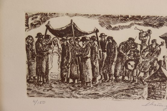 Wonderful limited edition lithograph artwork depicting a wedding ceremony scene with musicians, guests and traditional elements. Highly detailed line illustration capturing a cultural celebration moment with expressive figures and great character.