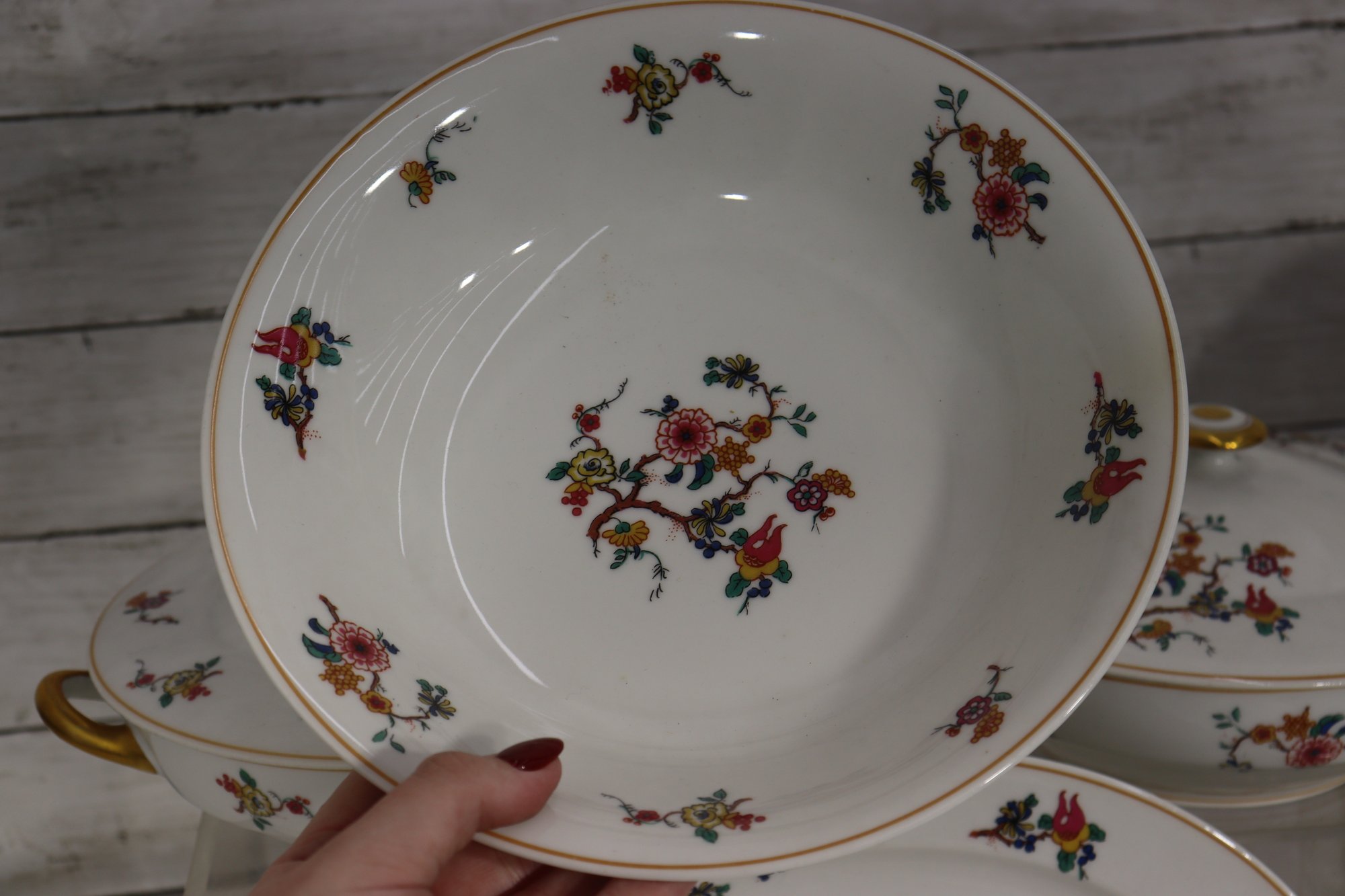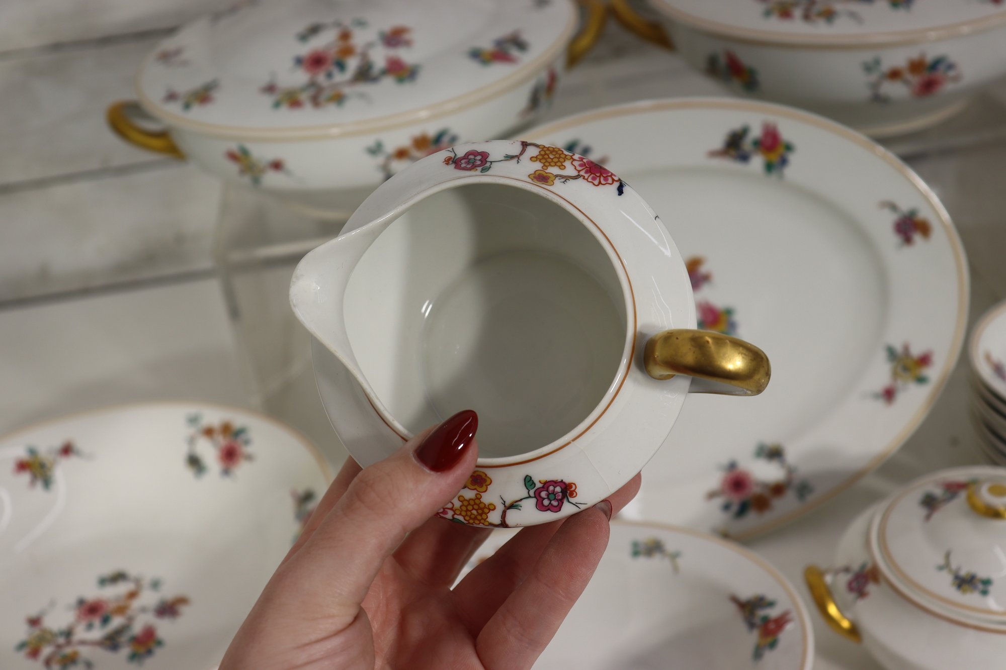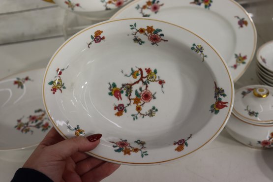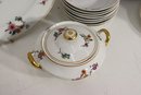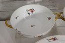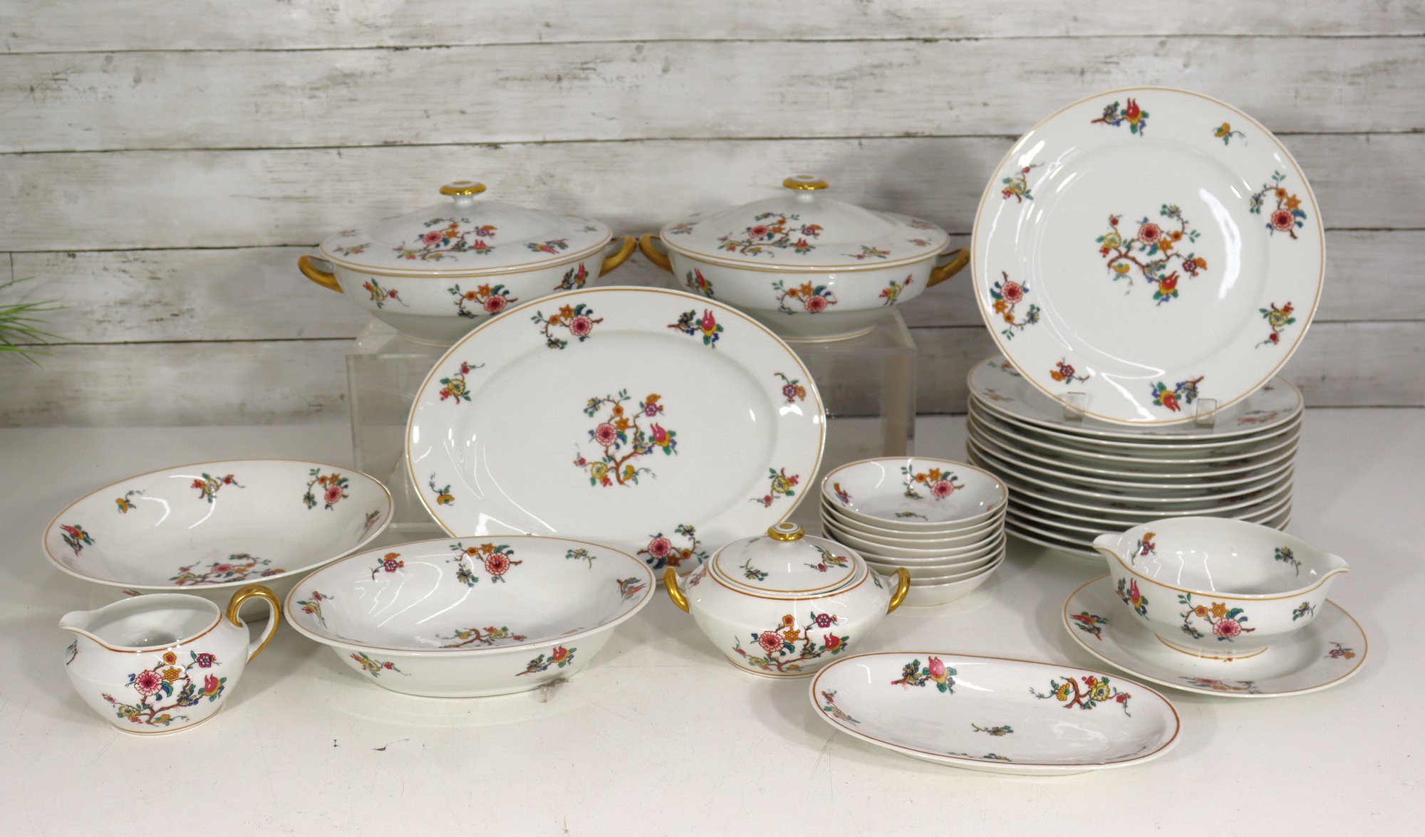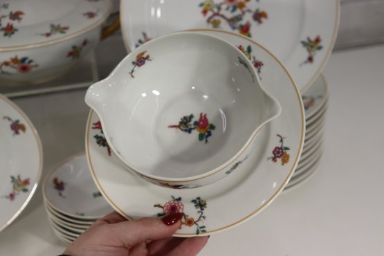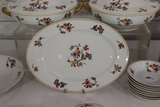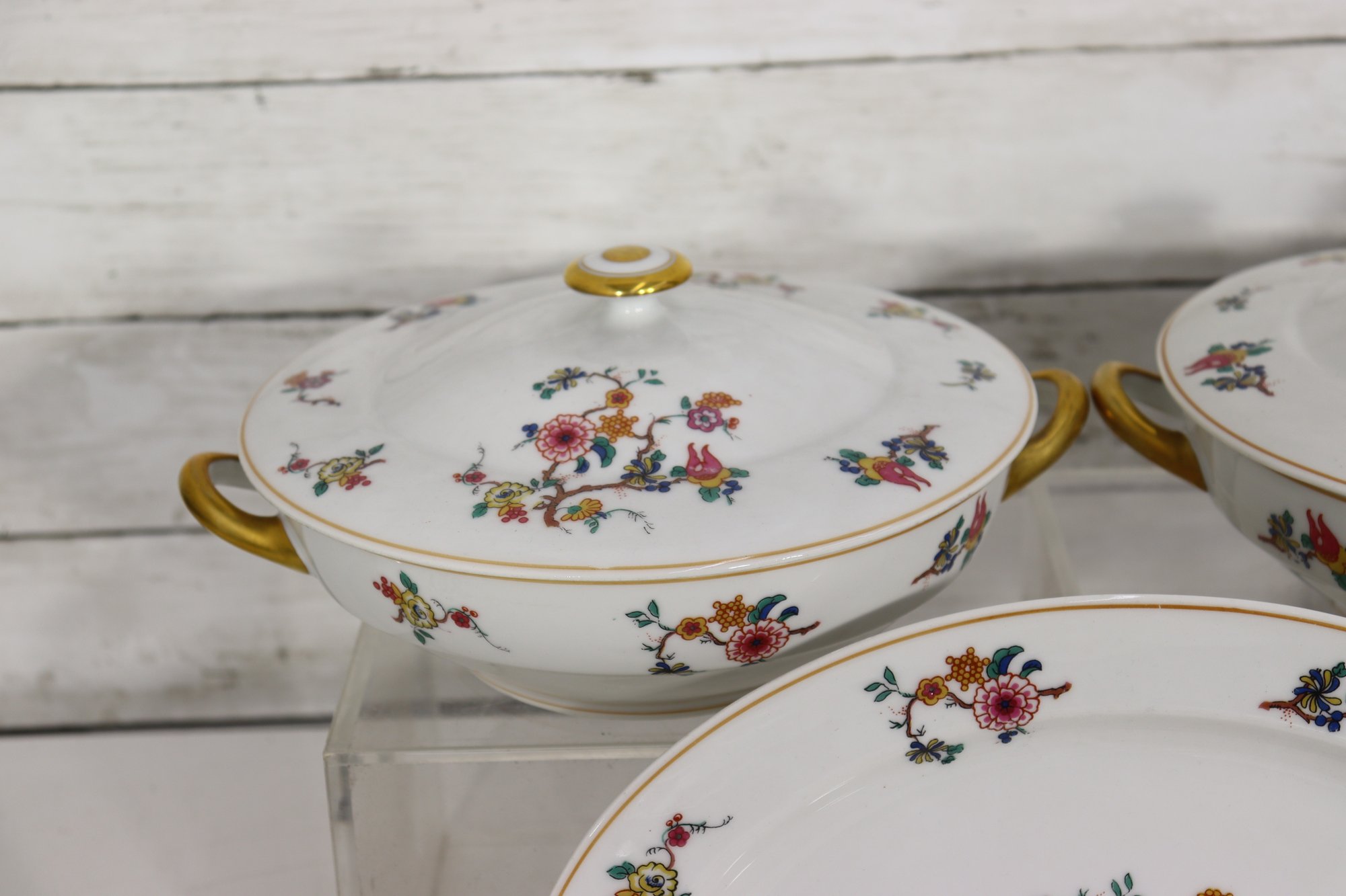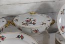 This extensive set includes a variety of serving and dining pieces, featuring tureens, platters, bowls, and dinner plates — all decorated with colorful blossoms on white porcelain and accented with graceful gold detailing.