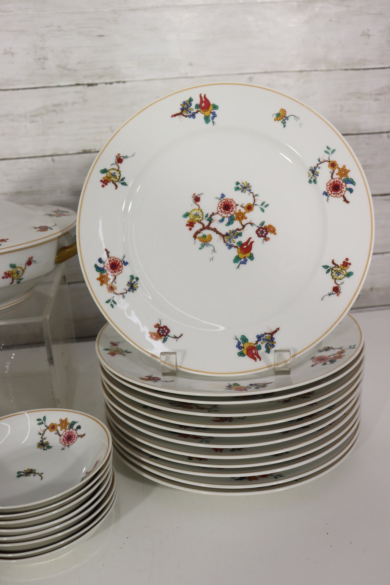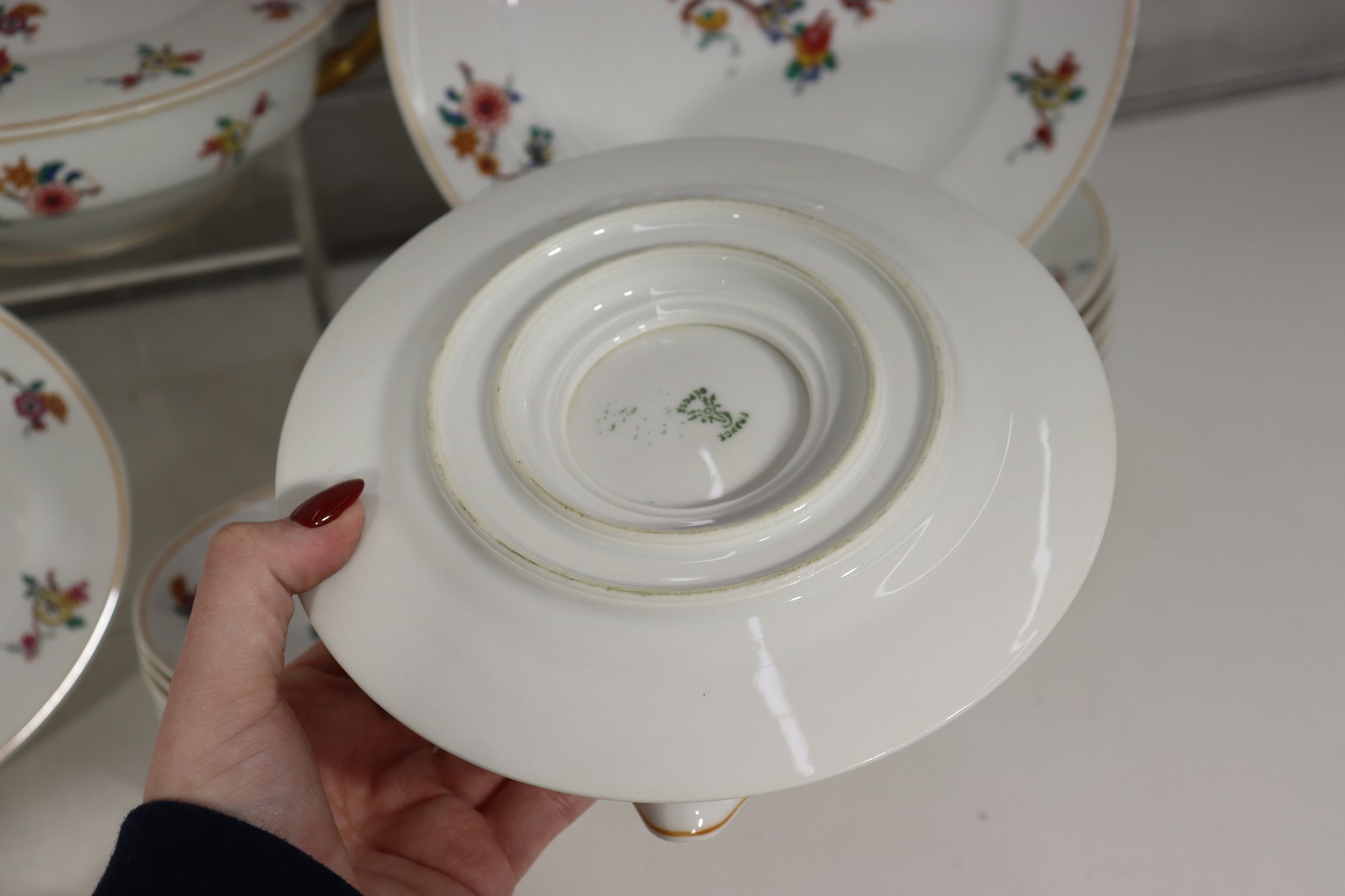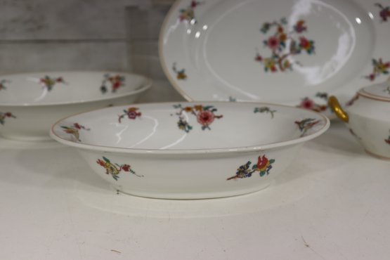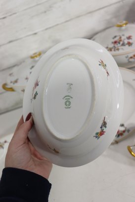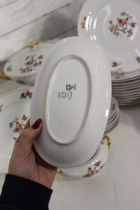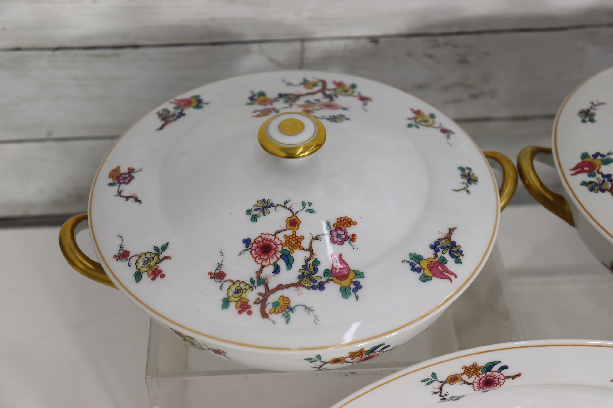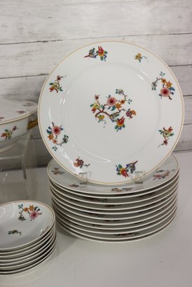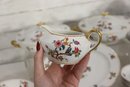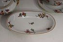 This extensive set includes a variety of serving and dining pieces, featuring tureens, platters, bowls, and dinner plates — all decorated with colorful blossoms on white porcelain and accented with graceful gold detailing.
