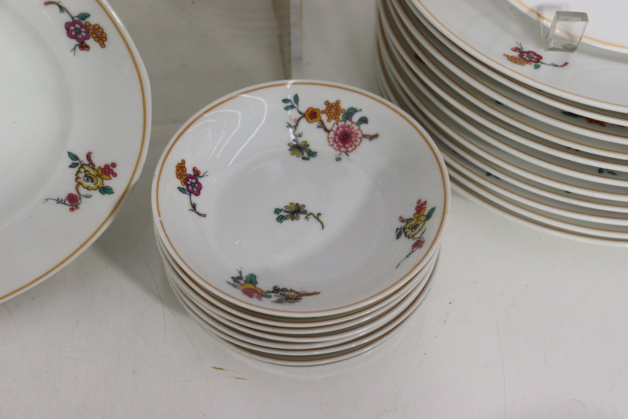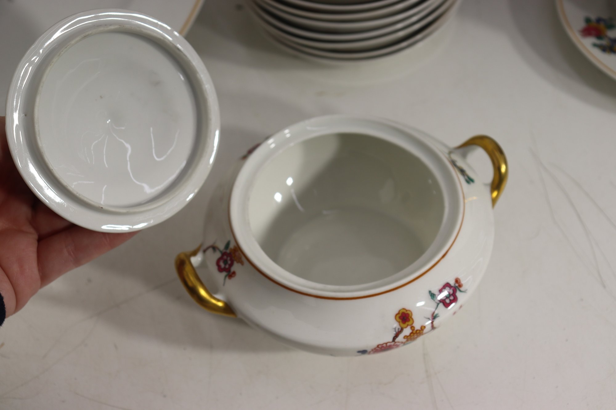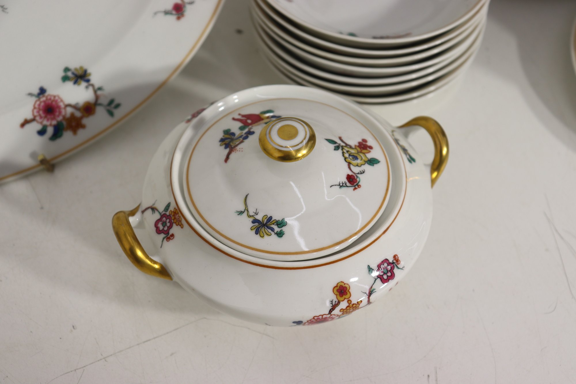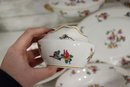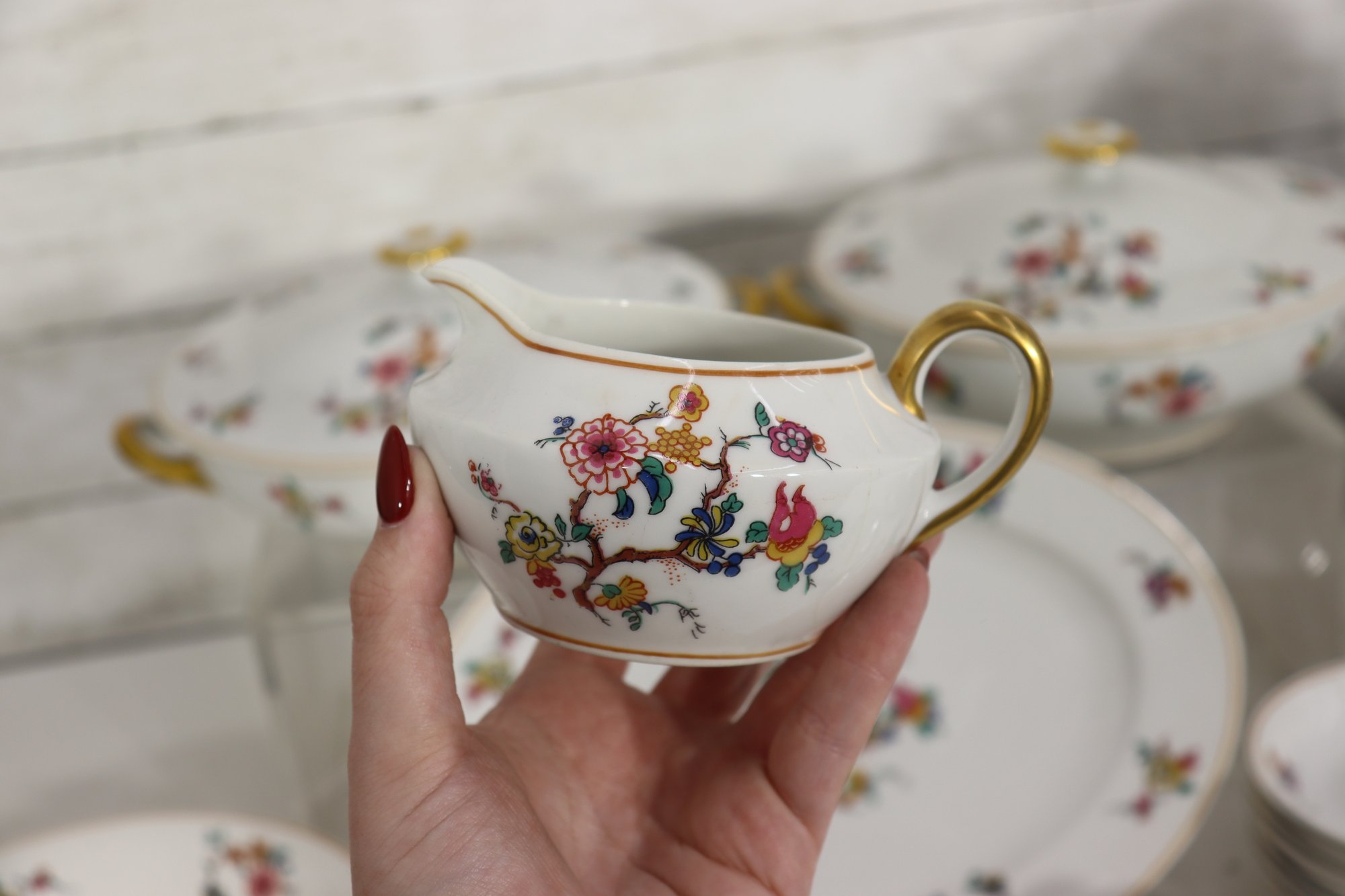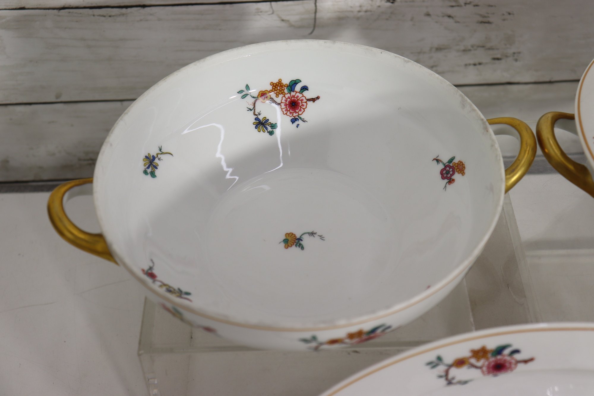 This extensive set includes a variety of serving and dining pieces, featuring tureens, platters, bowls, and dinner plates — all decorated with colorful blossoms on white porcelain and accented with graceful gold detailing.
