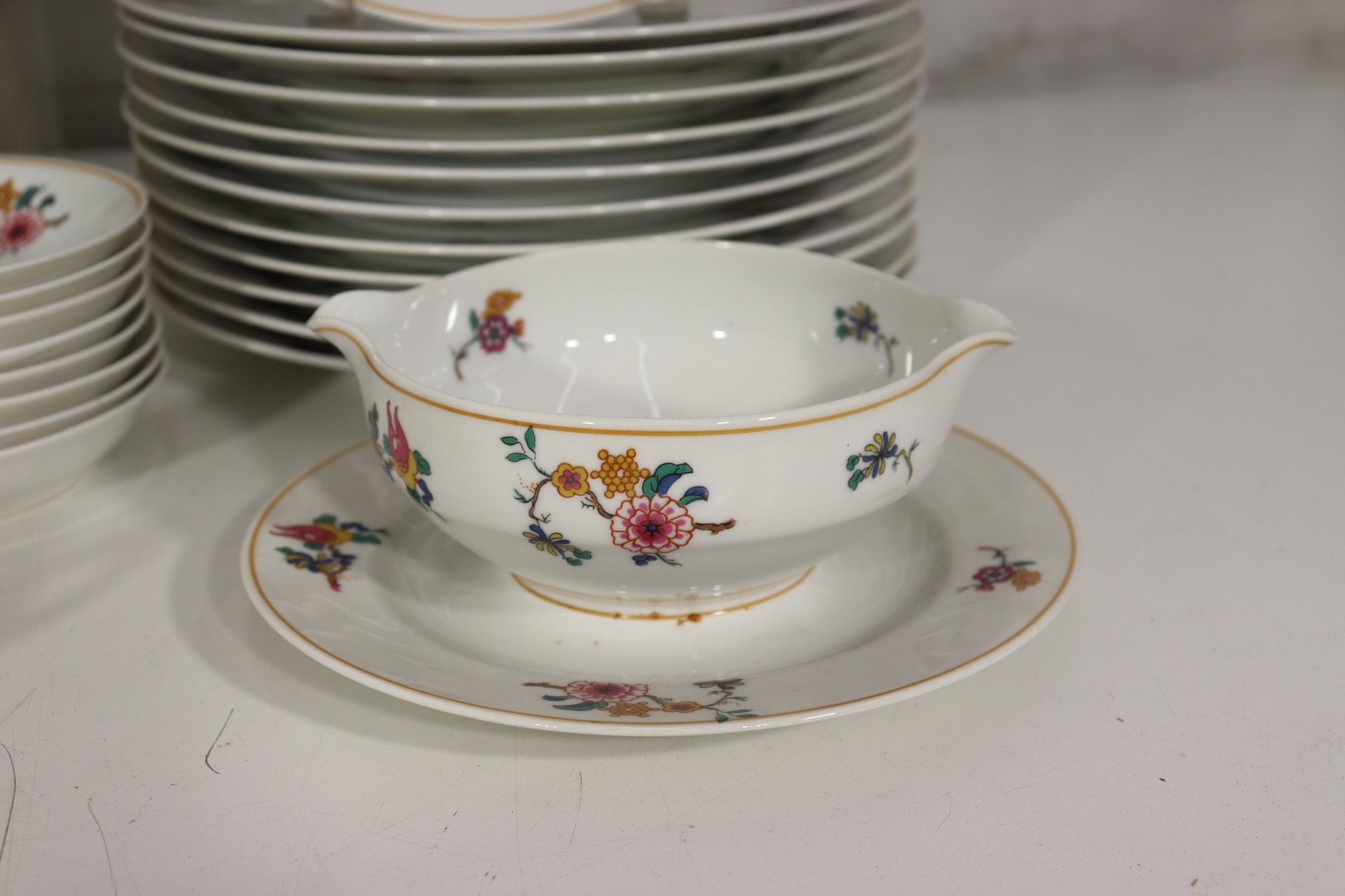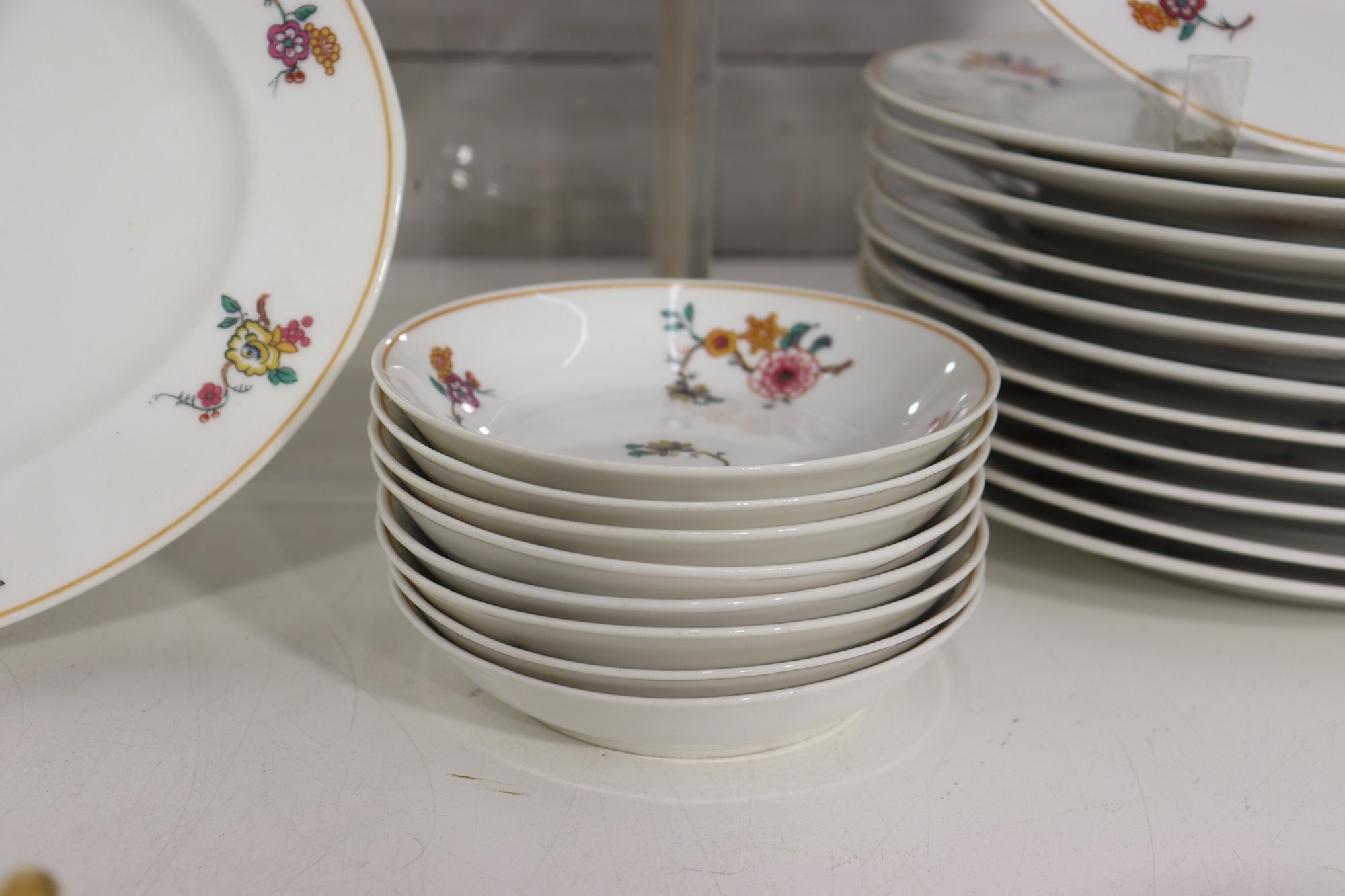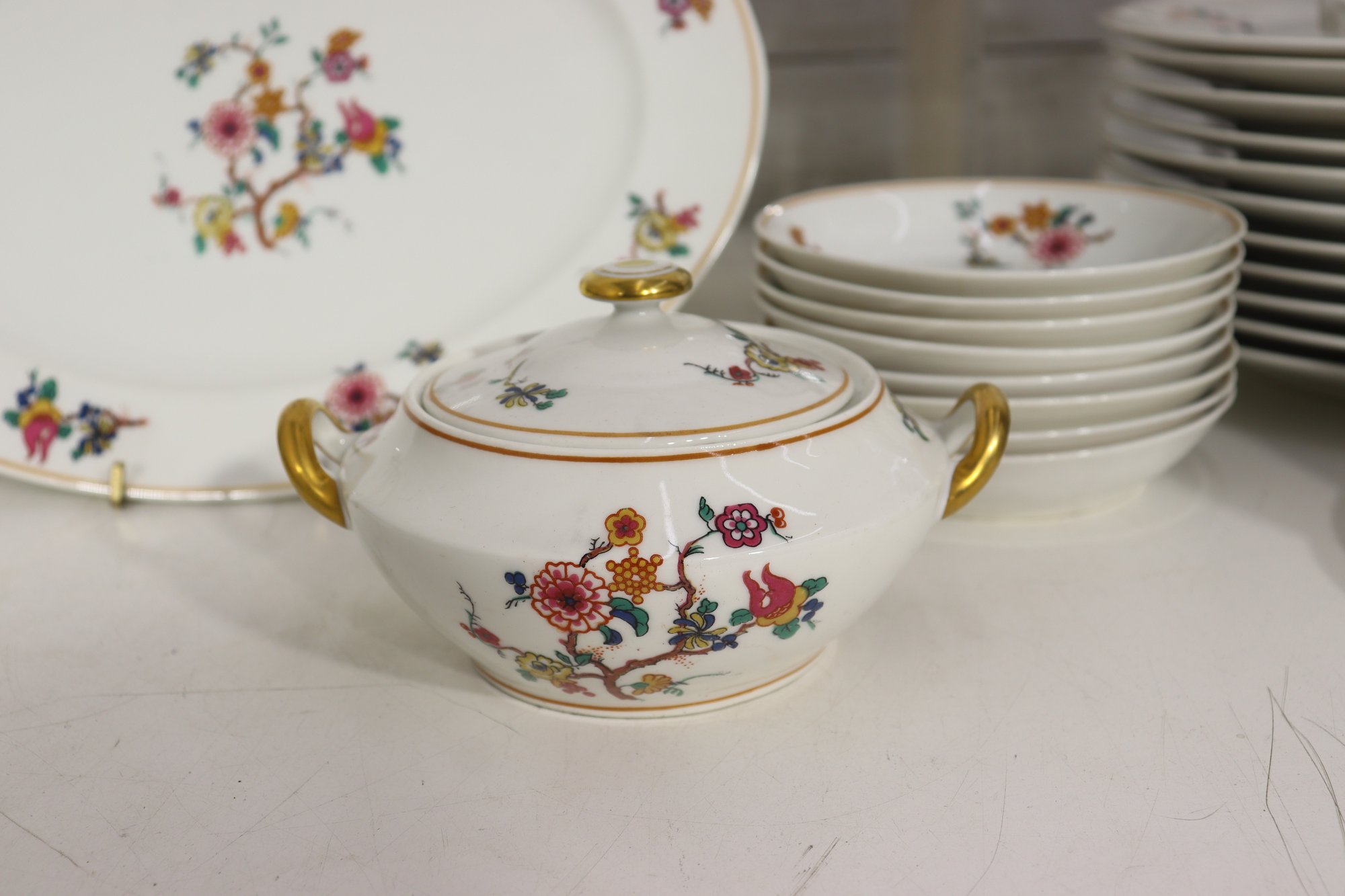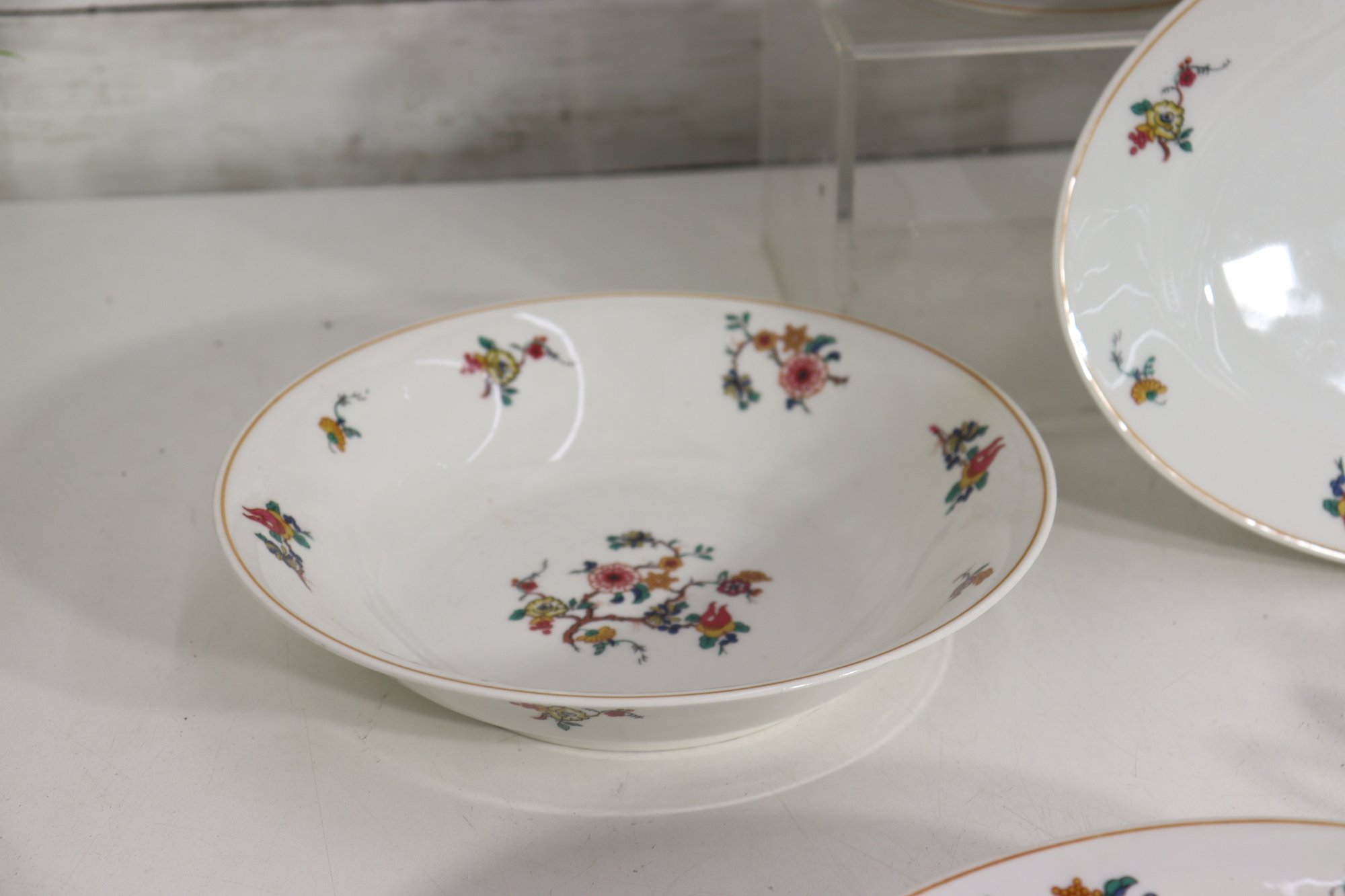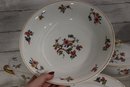 This extensive set includes a variety of serving and dining pieces, featuring tureens, platters, bowls, and dinner plates — all decorated with colorful blossoms on white porcelain and accented with graceful gold detailing.