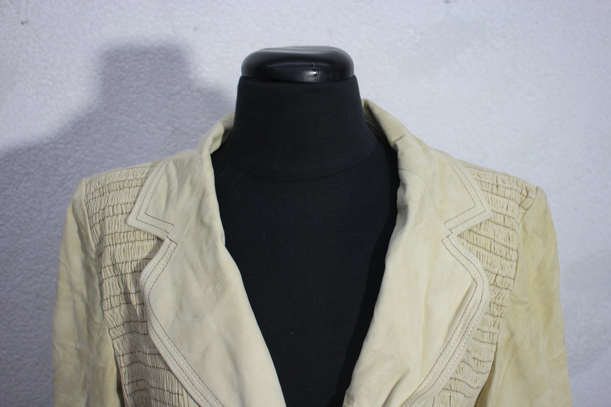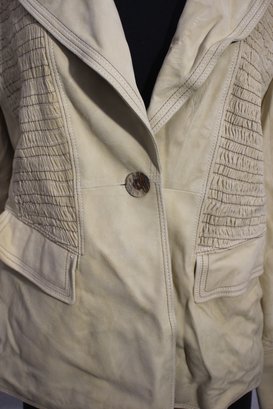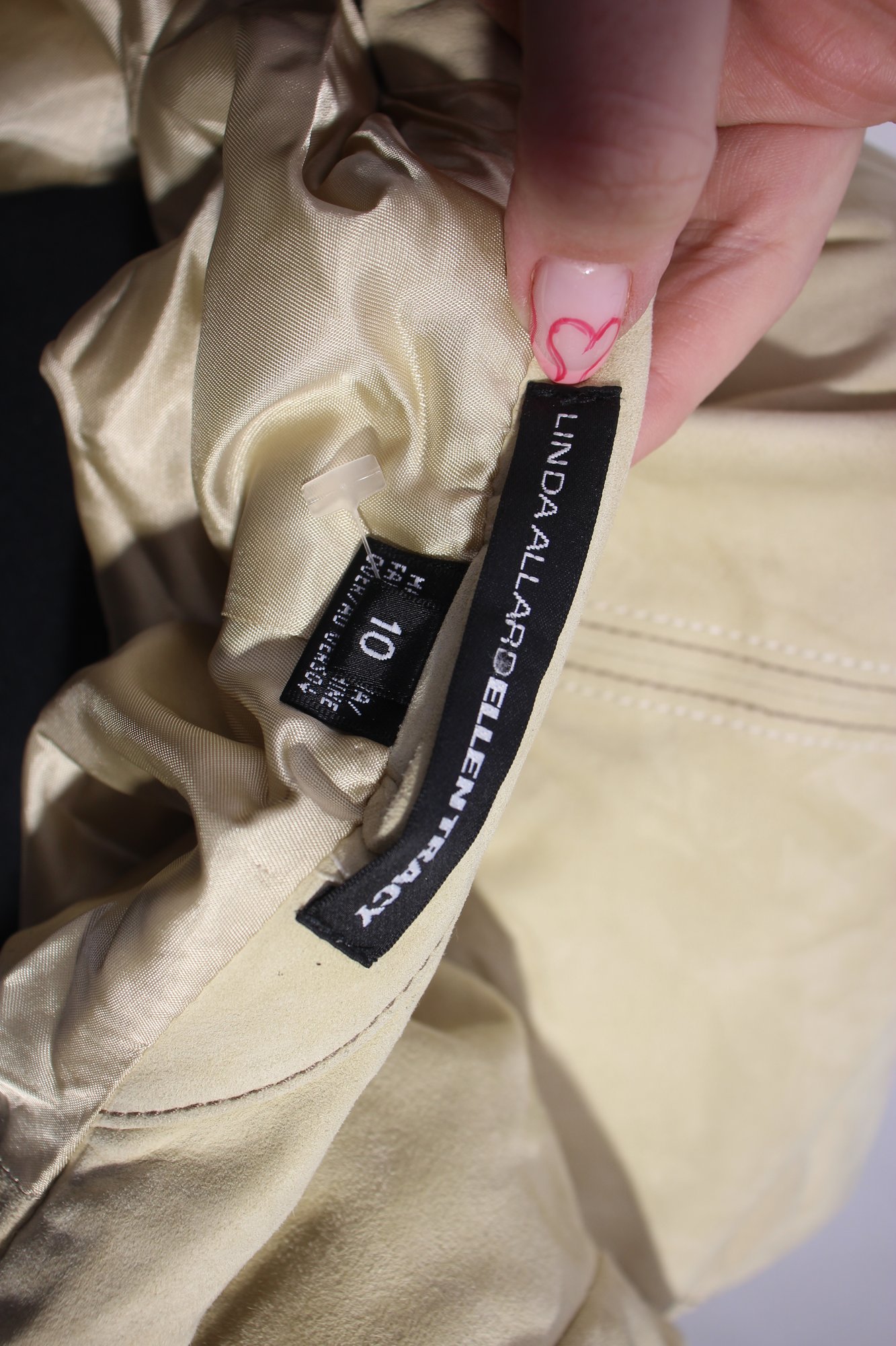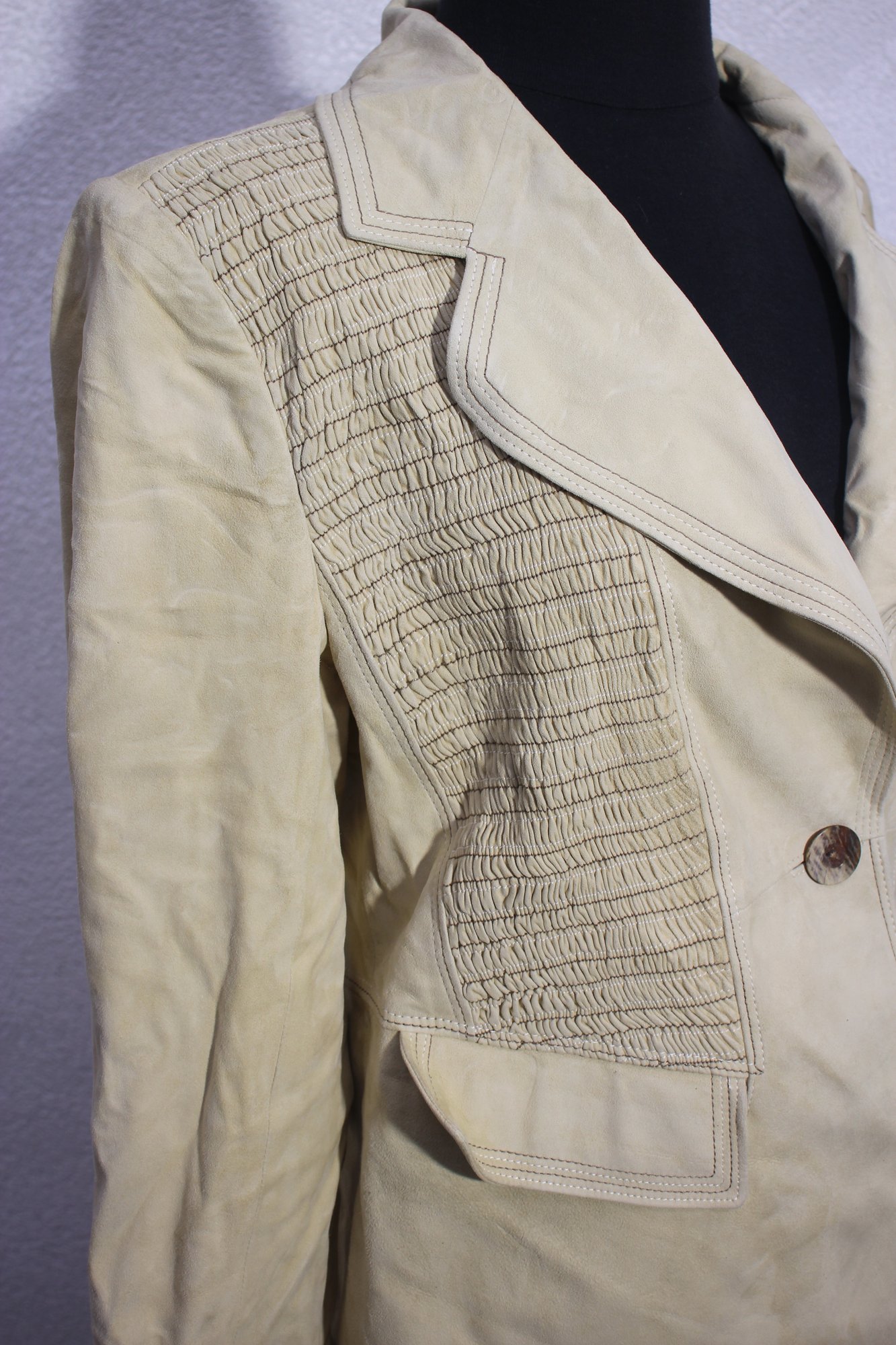 Make a statement with this Linda Allard Ellen Tracy beige leather blazer, featuring unique ruched panel detailing and a classic tailored fit. This elegant yet edgy piece is perfect for adding sophistication to any outfit