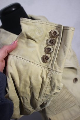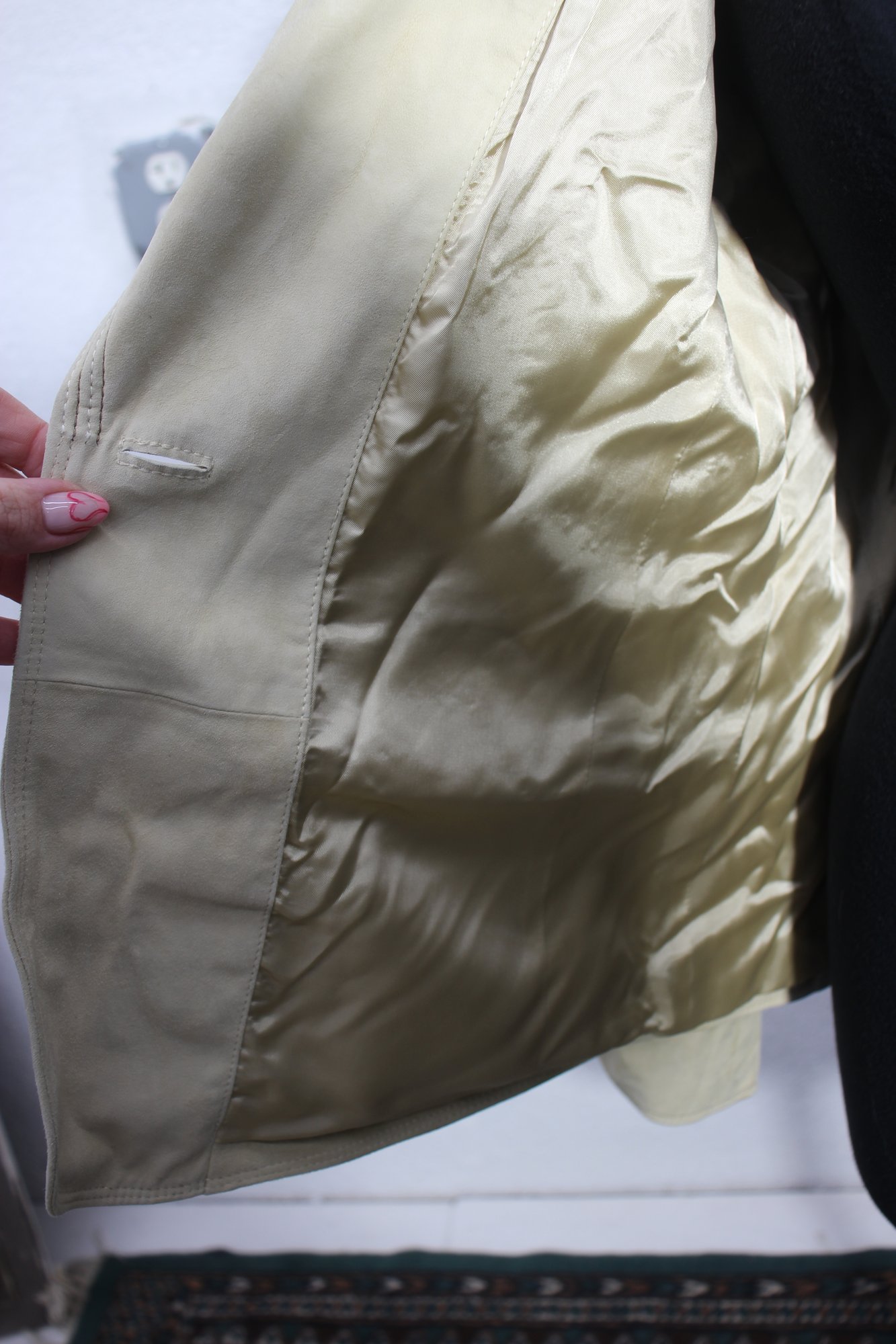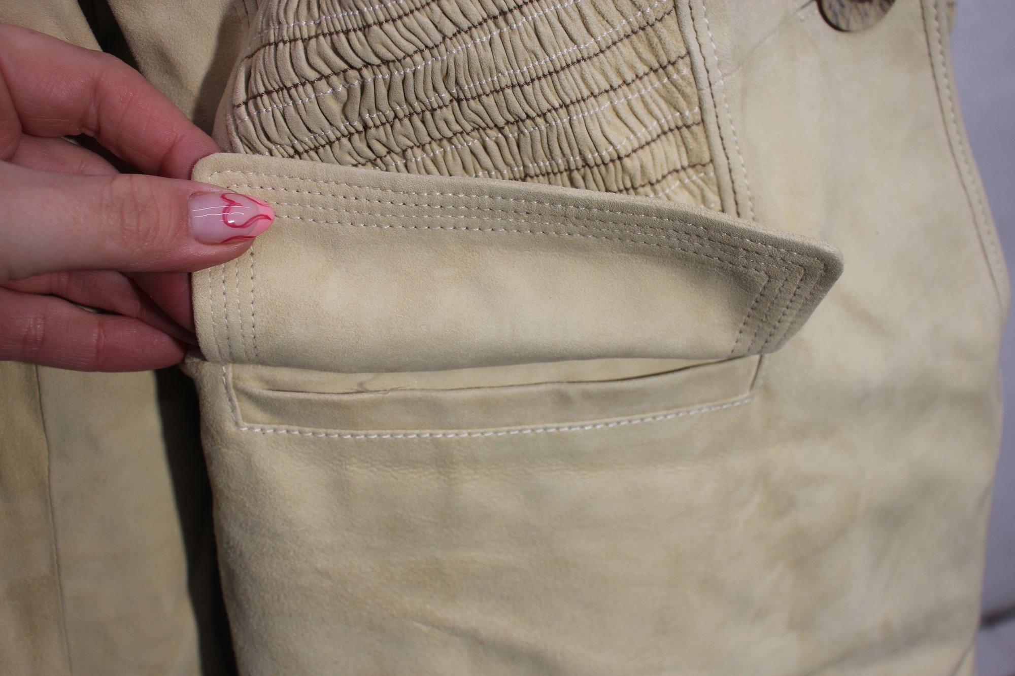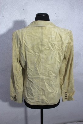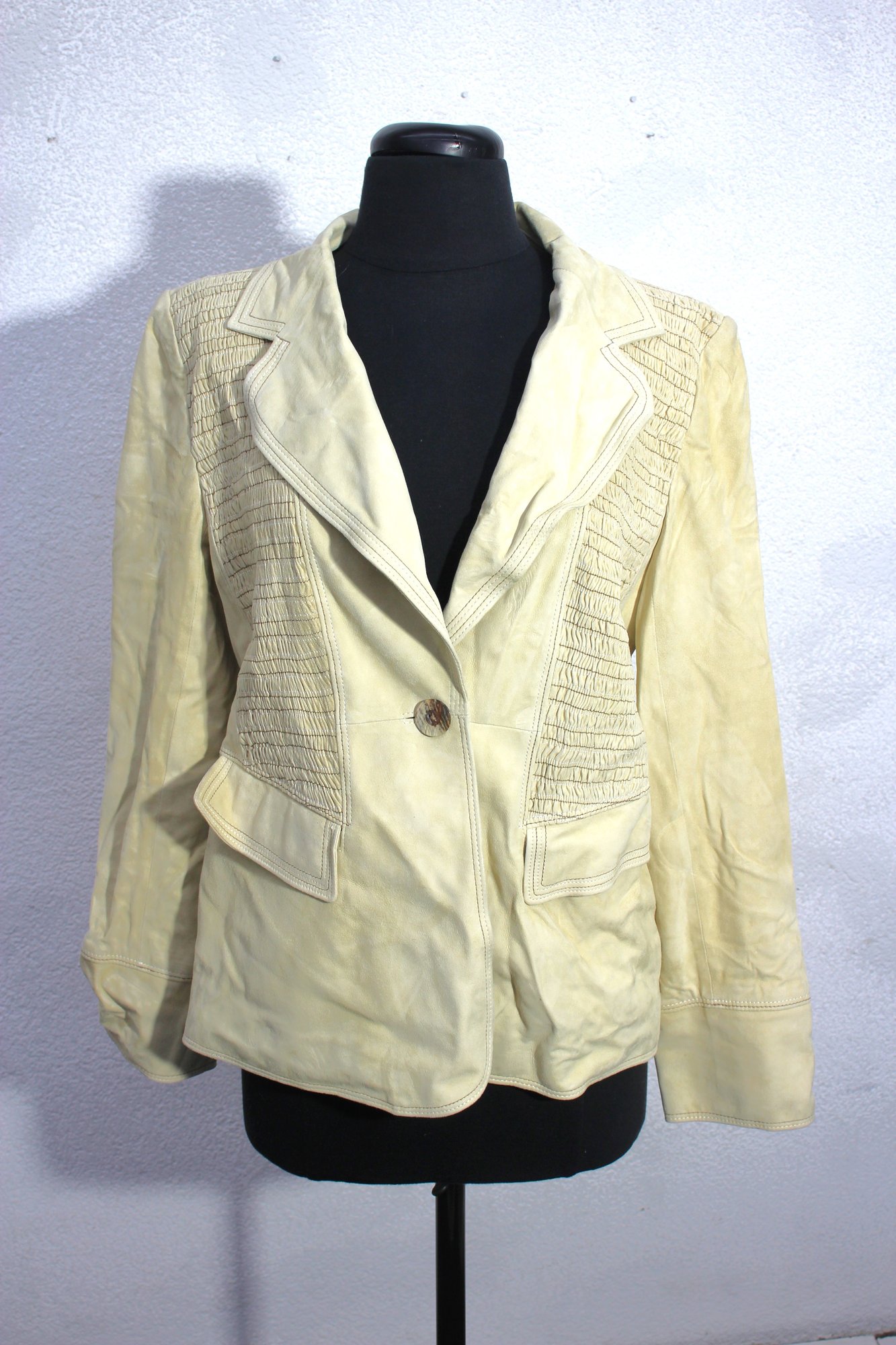 Make a statement with this Linda Allard Ellen Tracy beige leather blazer, featuring unique ruched panel detailing and a classic tailored fit. This elegant yet edgy piece is perfect for adding sophistication to any outfit