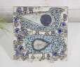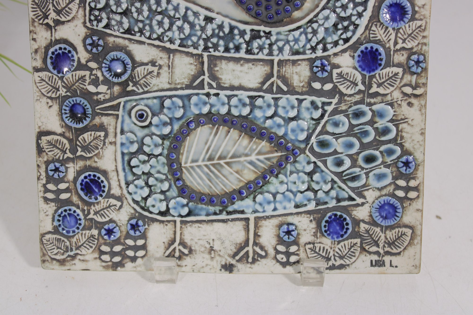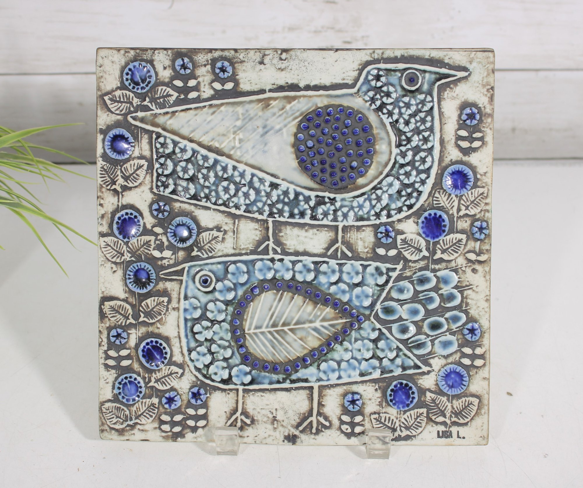 Beautiful and highly collectible ceramic wall plaque designed by Lisa Larson for Gustavsberg, Sweden, featuring the iconic “2 Birds” motif. This mid-century modern piece showcases two stylized birds surrounded by intricate floral and geometric patterns in soft neutral tones accented with rich blue details.