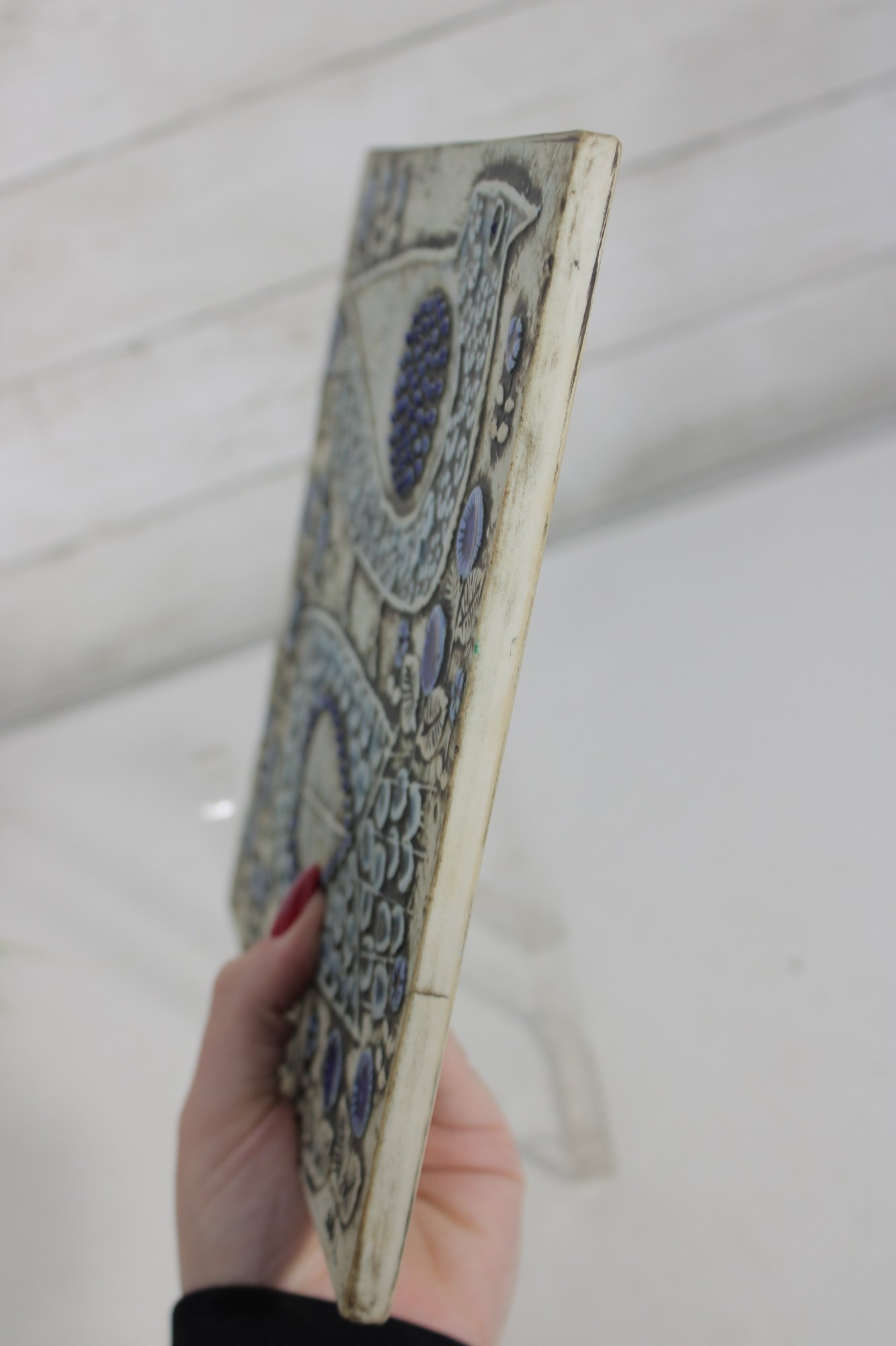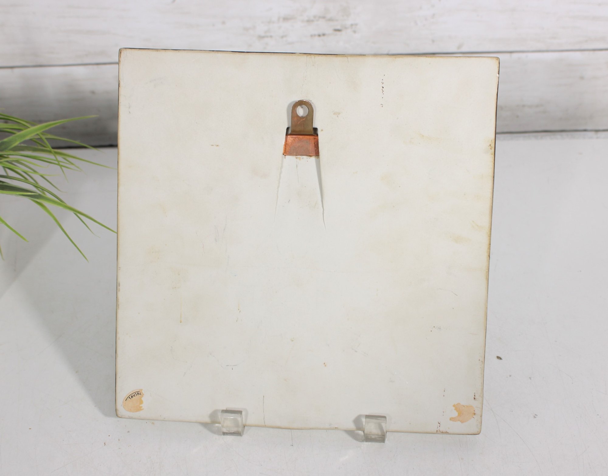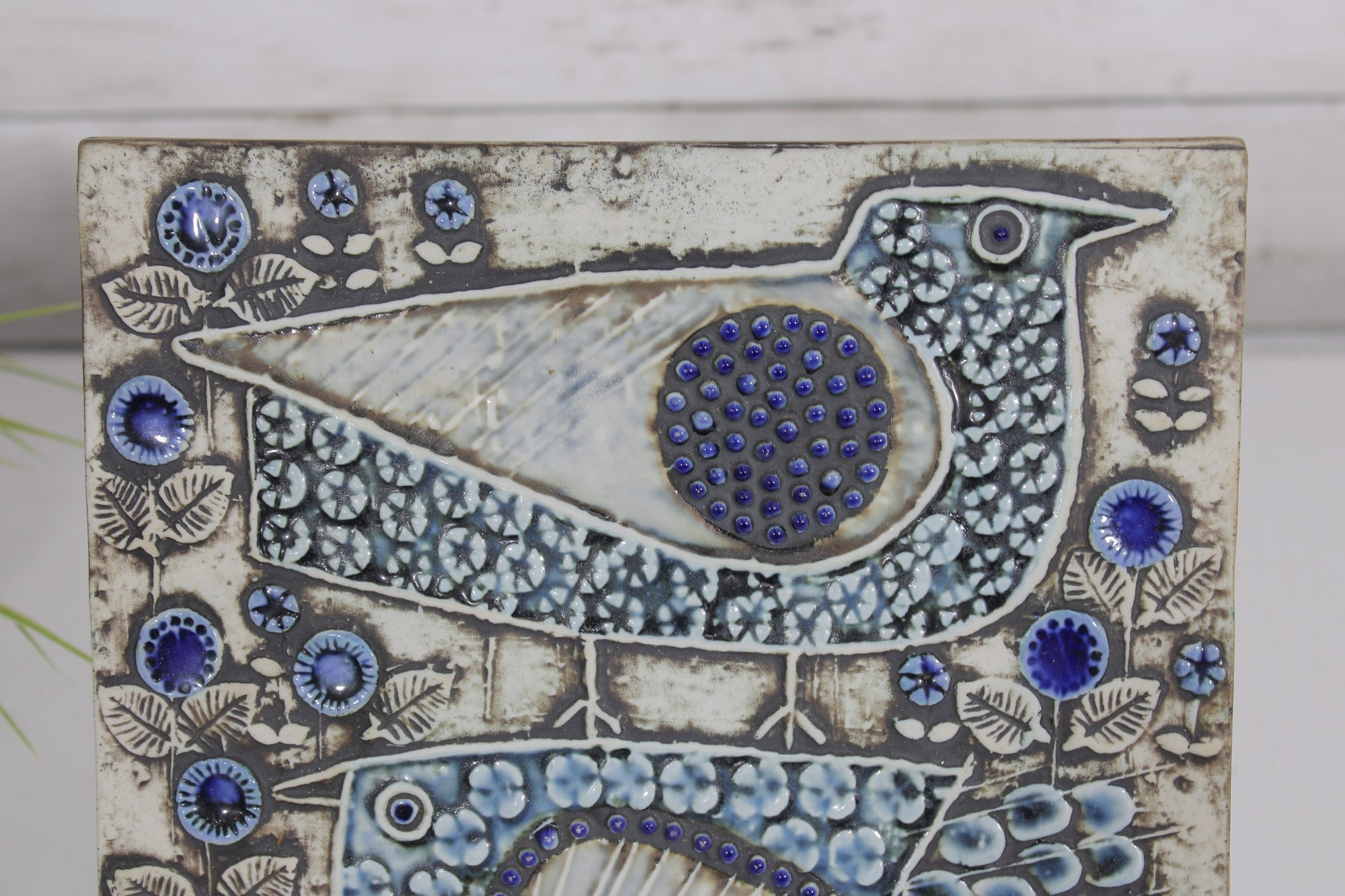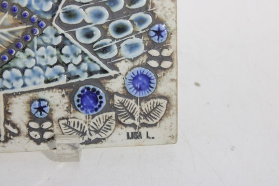 The textured surface and raised design elements create depth and visual interest, while the earthy glaze palette reflects Scandinavian design aesthetics of the period. The tile is marked with the artist’s initials and retains its original wall hanger on the reverse for easy display.